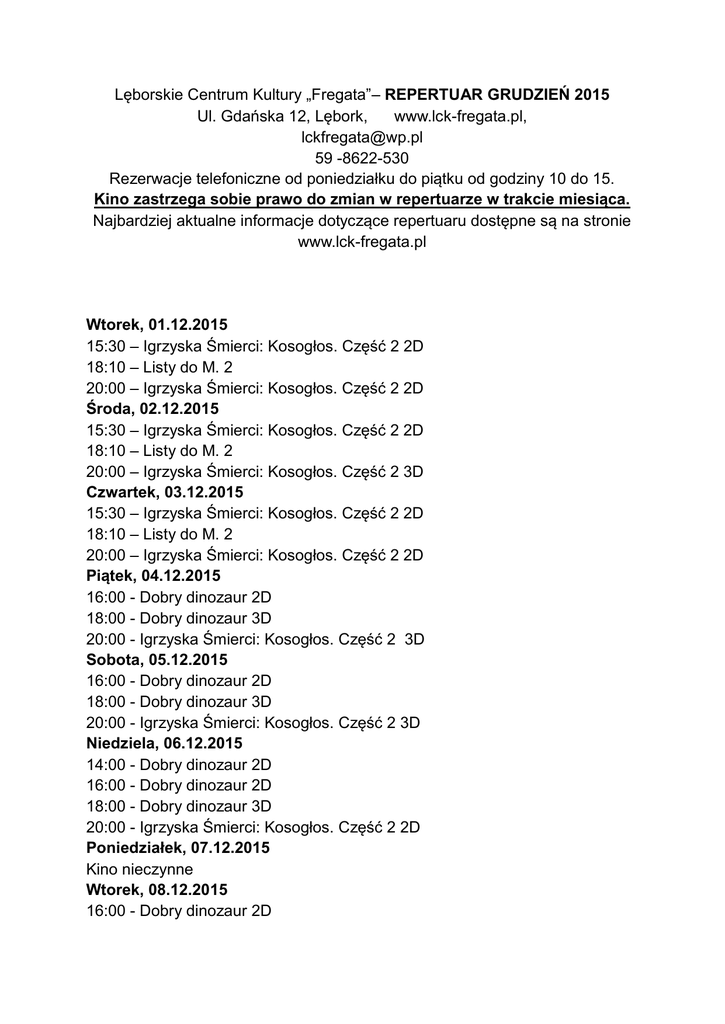 Lęborskie Centrum Kultury „Fregata”– REPERTUAR GRUDZIEŃ 2015 Ul. Gdańska 12, Lębork, www.lck-fregata.pl, [email protected] 59 -8622-530 Rezerwacje telefoniczne od poniedziałku do piątku od godziny 10 do 15. Kino zastrzega sobie prawo do zmian w repertuarze w trakcie miesiąca. Najbardziej aktualne informacje dotyczące repertuaru dostępne są na stronie www.lck-fregata.pl Wtorek, 01.12.2015 15:30 – Igrzyska Śmierci: Kosogłos. Część 2 2D 18:10 – Listy do M. 2 20:00 – Igrzyska Śmierci: Kosogłos. Część 2 2D Środa, 02.12.2015 15:30 – Igrzyska Śmierci: Kosogłos. Część 2 2D 18:10 – Listy do M. 2 20:00 – Igrzyska Śmierci: Kosogłos. Część 2 3D Czwartek, 03.12.2015 15:30 – Igrzyska Śmierci: Kosogłos. Część 2 2D 18:10 – Listy do M. 2 20:00 – Igrzyska Śmierci: Kosogłos. Część 2 2D Piątek, 04.12.2015 16:00 - Dobry dinozaur 2D 18:00 - Dobry dinozaur 3D 20:00 - Igrzyska Śmierci: Kosogłos. Część 2 3D Sobota, 05.12.2015 16:00 - Dobry dinozaur 2D 18:00 - Dobry dinozaur 3D 20:00 - Igrzyska Śmierci: Kosogłos. Część 2 3D Niedziela, 06.12.2015 14:00 - Dobry dinozaur 2D 16:00 - Dobry dinozaur 2D 18:00 - Dobry dinozaur 3D 20:00 - Igrzyska Śmierci: Kosogłos. Część 2 2D Poniedziałek, 07.12.2015 Kino nieczynne Wtorek, 08.12.2015 16:00 - Dobry dinozaur 2D 18:00 - Dobry dinozaur 3D 20:00 - Igrzyska Śmierci: Kosogłos. Część 2 2D Środa, 09.12.2015 16:00 - Dobry dinozaur 2D 18:00 - Dobry dinozaur 3D 20:00 - Igrzyska Śmierci: Kosogłos. Część 2 3D Czwartek, 10.12.2015 16:00 - Dobry dinozaur 2D 18:00 - Dobry dinozaur 3D 20:00 - Igrzyska Śmierci: Kosogłos. Część 2 3D Piątek, 11.12.2015 16:00 - Dobry dinozaur 2D 18:00 - Dobry dinozaur 3D 20:00 - Czerwony pająk Sobota, 12.12.2015 16:00 - Dobry dinozaur 2D 18:00 - Dobry dinozaur 3D 20:00 - Czerwony pająk Niedziela, 13.12.2015 16:00 - Dobry dinozaur 2D 18:00 - Dobry dinozaur 3D 20:00 - Czerwony pająk Poniedziałek, 14.12.2015 Kino nieczynne Wtorek, 15.12.2015 16:00 - Dobry dinozaur 2D 18:00 - Dobry dinozaur 3D 20:00 – Czerwony pająk Środa, 16.12.2015 16:00 - Dobry dinozaur 2D 18:00 - Dobry dinozaur 3D 20:00 – Czerwony pająk Czwartek, 17.12.2015 16:00 - Dobry dinozaur 2D 18:00 - Dobry dinozaur 3D 20:00 – Czerwony pająk Piątek, 18.12.2015 14:00 – Gwiezdne wojny: Przebudzenie Mocy (2D dubbing) – PREMIERA 17:00 - Gwiezdne wojny: Przebudzenie Mocy (3D dubbing) 20:00 - Gwiezdne wojny: Przebudzenie Mocy (3D napisy) Sobota, 19.12.2015 14:00 – Gwiezdne wojny: Przebudzenie Mocy (2D dubbing) 17:00 - Gwiezdne wojny: Przebudzenie Mocy (3D dubbing) 20:00 - Gwiezdne wojny: Przebudzenie Mocy (3D napisy) Niedziela, 20.12.2015 14:00 – Gwiezdne wojny: Przebudzenie Mocy (2D dubbing) 17:00 - Gwiezdne wojny: Przebudzenie Mocy (3D dubbing) 20:00 - Gwiezdne wojny: Przebudzenie Mocy (2D napisy) Poniedziałek, 21.12.2015 17:00 - Gwiezdne wojny: Przebudzenie Mocy (3D dubbing) 20:00 - Gwiezdne wojny: Przebudzenie Mocy (3D napisy) Wtorek, 22.12.2015 17:00 - Gwiezdne wojny: Przebudzenie Mocy (3D dubbing) 20:00 - Gwiezdne wojny: Przebudzenie Mocy (3D napisy) Środa, 23.12.2015 17:00 - Gwiezdne wojny: Przebudzenie Mocy (2D dubbing) 20:00 - Gwiezdne wojny: Przebudzenie Mocy (3D napisy) Czwartek, 24.12.2015 Kino nieczynne Piątek, 25.12.2015 Kino nieczynne Sobota, 26.12.2015 14:00 – Gwiezdne wojny: Przebudzenie Mocy (2D dubbing) 17:00 - Gwiezdne wojny: Przebudzenie Mocy (3D dubbing) 20:00 - Gwiezdne wojny: Przebudzenie Mocy (3D napisy) Niedziela, 27.12.2015 14:00 – Gwiezdne wojny: Przebudzenie Mocy (2D dubbing) 17:00 - Gwiezdne wojny: Przebudzenie Mocy (3D dubbing) 20:00 - Gwiezdne wojny: Przebudzenie Mocy (2D napisy) Poniedziałek, 28.12.2015 17:00 - Gwiezdne wojny: Przebudzenie Mocy (2D dubbing) 20:00 - Gwiezdne wojny: Przebudzenie Mocy (3D napisy) Wtorek, 29.12.2015 17:00 - Gwiezdne wojny: Przebudzenie Mocy (3D dubbing) 20:00 - Gwiezdne wojny: Przebudzenie Mocy (3D napisy) Środa, 30.12.2015 17:00 - Gwiezdne wojny: Przebudzenie Mocy (3D dubbing) 20:00 - Gwiezdne wojny: Przebudzenie Mocy (2D napisy) Czwartek, 31.12.2015 Kino nieczynne Piątek, 01.01.2016 Kino nieczynne Sobota , 02.01.2016 14:00 – Gwiezdne wojny: Przebudzenie Mocy (2D dubbing) 17:00 - Gwiezdne wojny: Przebudzenie Mocy (3D dubbing) 20:00 - Gwiezdne wojny: Przebudzenie Mocy (2D napisy) Niedziela, 03.01.2016 14:00 – Gwiezdne wojny: Przebudzenie Mocy (2D dubbing) 17:00 - Gwiezdne wojny: Przebudzenie Mocy (3D dubbing) 20:00 - Gwiezdne wojny: Przebudzenie Mocy (3D napisy) Poniedziałek, 04.01.2016 Kino nieczynne Wtorek, 05.01.2016 17:00 - Gwiezdne wojny: Przebudzenie Mocy (3D dubbing) 20:00 - Gwiezdne wojny: Przebudzenie Mocy (3D napisy) Środa, 06.01.2016 17:00 - Gwiezdne wojny: Przebudzenie Mocy (3D dubbing) 20:00 - Gwiezdne wojny: Przebudzenie Mocy (3D napisy) Czwartek, 07.01.2016 17:00 - Gwiezdne wojny: Przebudzenie Mocy (2D dubbing) 20:00 - Gwiezdne wojny: Przebudzenie Mocy (3D napisy) OPISY Listy do M.2 102 min. Komedia romantyczna/Polska Cztery lata po spektakularnym sukcesie „Listów do M.” bohaterowie najpopularniejszej komedii wyświetlanej w polskich kinach w ciągu ostatnich 25 lat powracają. „Listy do M. 2” mają w sobie wszystko to, za co pierwszy film pokochały miliony Polaków – światowy poziom realizacyjny, wciągającą historię, błyskotliwy humor, prawdziwe wzruszenia, przebojową ścieżkę dźwiękową i jeszcze więcej gwiazd w obsadzie. A w niej m.in. Maciej Stuhr, Roma Gąsiorowska, Tomasz Karolak, Agnieszka Dygant, Piotr Adamczyk, Maciej Zakościelny, Marta Żmuda-Trzebiatowska, Magdalena Lamparska, Agnieszka Wagner, Wojciech Malajkat, Katarzyna Zielińska, Paweł Małaszyński, Marcin Perchuć, Katarzyna Bujakiewicz, Piotr Głowacki, Nikodem Rozbicki i Małgorzata Kożuchowska w pierwszej od lat roli na dużym ekranie. Igrzyska śmierci: Kosogłos. Część 2 2D/3D 145 min. Akcja, Science-Fiction/USA Katniss Everdeen i przywódcy Dystryktu 13 rozpoczynają wielką ofensywą przeciwko