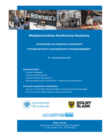 Międzynarodowa Konferencja Naukowa „Atomizacja czy integracja europejska? Transgraniczność w perspektywie (wielo)pedagogiki” 22 - 23 października 2014 ORGANIZATORZY: Instytut Pedagogiki Uniwersytet Wrocławski Instytut Studiów nad Islamem Muzułmańskie Centrum Kulturalno – Oświatowe we Wrocławiu PATRONAT HONOROWY KONFERENCJI prof. zw. dr hab. Marek Bojarski, Rektor Uniwersytetu Wrocławskiego prof. zw. dr hab. Stefan Lelental, Uniwersytet Łódzki Miejsce obrad: Uniwersytet Wrocławski, Instytut Pedagogiki ul. J.W. Dawida 1, 50 - 527 Wrocław Międzynarodowa Konferencja Naukowa „Atomizacja czy integracja europejska? Transgraniczność w perspektywie (wielo)pedagogiki” 22 - 23 października 2014 Organizatorzy: Instytut Pedagogiki Uniwersytet Wrocławski Instytut Studiów nad Islamem Muzułmańskie Centrum Kulturalno – Oświatowe we Wrocławiu PATRONAT HONOROWY KONFERENCJI prof. zw. dr hab. Marek Bojarski, Rektor Uniwersytetu Wrocławskiego prof. zw. dr hab. Stefan Lelental, Uniwersytet Łódzki Miejsce obrad: Uniwersytet Wrocławski, Instytut Pedagogiki ul. J.W. Dawida 1, 50-527 Wrocław 2 Konferencja Atomizacja czy integracja europejska? Transgraniczność w perspektywie (wielo)pedagogiki została dofinansowana z budżetu Województwa Dolnośląskiego International Conference „European atomization or integration? Transborder aspects of (mutli)pedagogy” 22 - 23 October 2014 Organizers: Institute of Pedagogy University of Wroclaw Institute of Islamic Studies Muslim Educational and Cultural Centre in Wroclaw Honorary Patronage prof. zw. dr hab. Marek Bojarski prof. zw. dr hab. Stefan Lelental Venue: University of Wroclaw, Institute of Pedagogy J.W. Dawida 1, 50-527 Wrocław Konferencja Atomizacja czy integracja europejska? Transgraniczność w perspektywie (wielo)pedagogiki została dofinansowana z budżetu Województwa Dolnośląskiego 3 KOMITET NAUKOWY Przewodniczący: dr hab. Alicja Szerląg prof. UWr prof. dr hab. Piotr Stępniak CZŁONKOWIE: prof. dr Dieter Bingen Deutsches Polen-Institut in Darmstadt, Niemcy prof. dr hab. Bruno Drwęski Institut National des Langues et Civilisations Orientales prof. dr Vilija Grincevičienė Lietuvos Edukologijos Universitetas, Litwa prof. dr hab. Libertas Klimka Lietuvos Edukologijos Universitetas, Litwa prof. dr Dzemal Sokolvić University of Bergen, Bośnia i Hercegowina prof. dr hab. Vilija Targamadze Vilniaus Universitetas, Litwa prof. dr hab. Selim Chazbijewicz Uniwersytet Warmińsko-Mazurski, Polska prof. zw. dr hab. Stefan Lelental Uniwersytet Łódzki, Polska prof. zw. dr hab. Jerzy Nikitorowicz Zespół Pedagogiki Kultury i Edukacji Międzykulturowej KNP PAN, Polska prof. dr hab. Bartłomiej Nowotarski Uniwersytet Ekonomiczny, Polska prof. zw. dr hab. dr h.c. Andrzej J. Szwarc Polsko - Niemiecki Instytut Badawczy, Collegium Polonicum w Słubicach, Polska William Barylo École des Hautes Études en Sciences Sociales, Francja dr Ali Abi Issa Muzułmańskie Centrum Kulturalno – Oświatowe we Wrocławiu, Polska dr Eva Sidorenko University of Greenwich, Anglia prof. Slobodan Šoja były ambasador Bośni i Hercegowiny we Francji i w Egipcie dr hab. Tomasz Stefaniuk UMCS Lublin, ISNI, Polska dr Mariusz Turowski Uniwersytet Wrocławski Polska, Uludağ Üniversitesi Turcja SEKRETARZ KONFERENCJI: dr Justyna Pilarska, tel. 668465777, [email protected] dr Arkadiusz Urbanek, tel. 660418750, [email protected] KOMITET ORGANIZACYJNY KONFERENCJI: Przewodniczący: dr Arkadiusz Urbanek dr Justyna Pilarska dr Małgorzata Prokosz mgr Agnieszka Kucofaj mgr Anita Mencel 4 Konferencja Atomizacja czy integracja europejska? Transgraniczność w perspektywie (wielo)pedagogiki została dofinansowana z budżetu Województwa Dolnośląskiego SCIENTIFIC BOARD Chairs: dr hab. Alicja Szerląg prof. UWr prof. dr hab. Piotr Stępniak MEMBERS: prof. dr Dieter Bingen Deutsches Polen-Institut in Darmstadt, Germany prof. dr hab. Bruno Drwęski Institut National des Langues et Civilisations Orientales prof. dr Vilija Grincevičienė Lietuvos Edukologijos Universitetas, Lithuania prof. dr hab. Libertas Klimka Lietuvos Edukologijos Universitetas, Lithuania prof. dr Dzemal Sokolvić University of Bergen, Norway/Bosnia and Herzegovina prof. dr hab. Vilija Targamadze Vilniaus Universitetas, Lithuania prof. dr hab. Selim Chazbijewicz Uniwersytet Warmińsko-Mazurski, Poland prof. zw. dr hab. Stefan Lelental Uniwersytet Łódzki, Polska prof. zw. dr hab. Jerzy Nikitorowicz Polish Academy of Sciences, Committee of Polish Sciences, Pedagogy of Culture and Intercultural Education prof. dr hab. Bartłomiej Nowotarski Uniwersytet Ekonomiczny, Poland prof. dr hab. dr h.c. Andrzej J. Szwarc Polish-German Research Institute Collegium Polonicum w Słubicach, Poland William Barylo École des Hautes Études en Sciences Sociales, France dr Ali Abi Issa Muslim Educational and Cultural Centre in Wroclaw, Poland dr Eva Sidorenko University of Greenwich, England prof. Slobodan Šoja former ambassador of Bosnia and Herzegovina to France and Egypt dr hab. Tomasz Stefaniuk UMCS Lublin, ISNI, Poland dr Mariusz Turowski Uniwersytet Wrocławski, Uludağ Üniversitesi, ISNI CONFERENCE SECRETARIAT CONTACT PERSONS: dr Justyna Pilarska, mobile: 0048-668465777 dr Arkadiusz Urbanek, [email protected] [email protected] ORGANISATION BOARD: Head of the Organisation Board: dr Arkadiusz Urbanek Members: dr Justyna Pilarska dr Małgorzata Prokosz mgr Anita Mencel mgr Agnieszka Kucofaj Konferencja Atomizacja czy integracja europejska? Transgraniczność w perspektywie (wielo)pedagogiki została dofinansowana z budżetu Województwa Dolnośląskiego 5 RAMOWY PROGRAM KONFERENCJI FRAMEWORK CONFERENCE PROGRAM 22 października 2014 / 22 October 2014 8.30 – 9.30 9.30 – 10.00 10.00 – 15. 00 16.00 – 18.30 Rejestracja uczestników (Parter) Participant Registration (ground floor) Uroczyste otwarcie konferencji AULA Official Opening Sesja plenarna AULA Plenary Session Sekcja tematyczna nr 1 (sala 50 