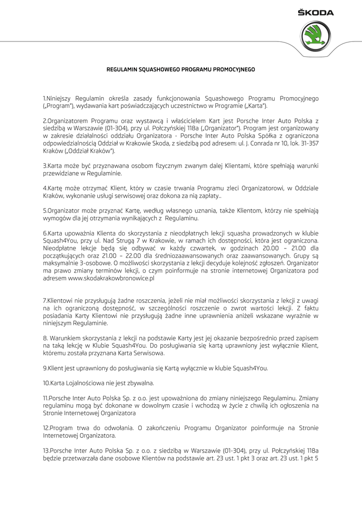 REGULAMIN SQUASHOWEGO PROGRAMU PROMOCYJNEGO 1.Niniejszy Regulamin określa zasady funkcjonowania Squashowego Programu Promocyjnego („Program”), wydawania kart poświadczających uczestnictwo w Programie („Karta”). 2.Organizatorem Programu oraz wystawcą i właścicielem Kart jest Porsche Inter Auto Polska z siedzibą w Warszawie (01-304), przy ul. Połczyńskiej 118a („Organizator”). Program jest organizowany w zakresie działalności oddziału Organizatora - Porsche Inter Auto Polska Spółka z ograniczona odpowiedzialnością Oddział w Krakowie Skoda, z siedzibą pod adresem: ul. J. Conrada nr 10, lok. 31-357 Kraków („Oddział Kraków”). 3.Karta może być przyznawana osobom fizycznym zwanym dalej Klientami, które spełniają warunki przewidziane w Regulaminie. 4.Kartę może otrzymać Klient, który w czasie trwania Programu zleci Organizatorowi, w Oddziale Kraków, wykonanie usługi serwisowej oraz dokona za nią zapłaty.. 5.Organizator może przyznać Kartę, według własnego uznania, także Klientom, którzy nie spełniają wymogów dla jej otrzymania wynikających z Regulaminu. 6.Karta upoważnia Klienta do skorzystania z nieodpłatnych lekcji squasha prowadzonych w klubie Squash4You, przy ul. Nad Strugą 7 w Krakowie, w ramach ich dostępności, która jest ograniczona. Nieodpłatne lekcje będą się odbywać w każdy czwartek, w godzinach 20.00 – 21.00 dla początkujących oraz 21.00 – 22.00 dla średniozaawansowanych oraz zaawansowanych. Grupy są maksymalnie 3-osobowe. O możliwości skorzystania z lekcji decyduje kolejność zgłoszeń. Organizator ma prawo zmiany terminów lekcji, o czym poinformuje na stronie internetowej Organizatora pod adresem www.skodakrakowbronowice.pl 7.Klientowi nie przysługują żadne roszczenia, jeżeli nie miał możliwości skorzystania z lekcji z uwagi na ich ograniczoną dostępność, w szczególności roszczenie o zwrot wartości lekcji. Z faktu posiadania Karty Klientowi nie przysługują żadne inne uprawnienia aniżeli wskazane wyraźnie w niniejszym Regulaminie. 8. Warunkiem skorzystania z lekcji na podstawie Karty jest jej okazanie bezpośrednio przed zapisem na taką lekcję w Klubie Squash4You. Do posługiwania się kartą uprawniony jest wyłącznie Klient, któremu została przyznana Karta Serwisowa. 9.Klient jest uprawniony do posługiwania się Kartą wyłącznie w klubie Squash4You. 10.Karta Lojalnościowa nie jest zbywalna. 11.Porsche Inter Auto Polska Sp. z o.o. jest upoważniona do zmiany niniejszego Regulaminu. Zmiany regulaminu mogą być dokonane w dowolnym czasie i wchodzą w życie z chwilą ich ogłoszenia na Stronie Internetowej Organizatora 12.Program trwa do odwołania. O zakończeniu Programu Organizator poinformuje na Stronie Internetowej Organizatora. 13.Porsche Inter Auto Polska Sp. z o.o. z siedzibą w Warszawie (01-304), przy ul. Połczyńskiej 118a będzie przetwarzała dane osobowe Klientów na podstawie art. 23 ust. 1 pkt 3 oraz art. 23 ust. 1 pkt 5 ustawy z dnia 29 sierpnia 1997 roku o ochronie danych osobowych w celach prawidłowego wykonywania Programu oraz marketingu własnych produktów i usług. Podanie danych osobowych jest dobrowolne. Klient ma prawo wglądu do swoich danych oraz żądania ich poprawienia, jak też wniesienia sprzeciwu wobec przetwarzania jego danych w celach marketingowych. 14.Regulamin wchodzi w życie z dniem 1 września 2015r.