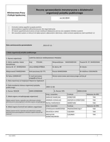 ZŽĐnjŶĞƐƉƌĂǁŽnjĚĂŶŝĞŵĞƌLJƚŽƌLJĐnjŶĞnjĚnjŝĂųĂůŶŽƑĐŝ ŽƌŐĂŶŝnjĂĐũŝƉŽǏLJƚŬƵƉƵďůŝĐnjŶĞŐŽ Ministerstwo Pracy ŝWŽůŝƚLJŬŝ^ƉŽųĞĐnjŶĞũ za rok 2014 • • • • &ŽƌŵƵůĂƌnjŶĂůĞǏLJǁLJƉĞųŶŝđǁũħnjLJŬƵƉŽůƐŬŝŵ͖ ^ƉƌĂǁŽnjĚĂǁĐĂǁLJƉĞųŶŝĂƚLJůŬŽƉƌnjĞnjŶĂĐnjŽŶĞĚůĂŶŝĞŐŽďŝĂųĞƉŽůĂ͖ tƚƌĂŬĐŝĞǁLJƉĞųŶŝĂŶŝĂĨŽƌŵƵůĂƌnjĂŝƐƚŶŝĞũĞŵŽǏůŝǁŽƑđĚŽĚĂǁĂŶŝĂǁŝĞƌƐnjLJŽƌĂnjnjĂǁŝũĂŶŝĂƚĞŬƐƚſǁǁƉŽůĂĐŚ͖ tĞǁƐnjLJƐƚŬŝĐŚƉŽůĂĐŚ͕ǁŬƚſƌLJĐŚŶŝĞďħĚČǁƉŝƐĂŶĞŽĚƉŽǁŝĞĚŶŝĞŝŶĨŽƌŵĂĐũĞ͕ŶĂůĞǏLJǁƐƚĂǁŝđƉŽũĞĚLJŶĐnjLJnjŶĂŬŵLJƑůŶŝŬĂ (--–). Data zamieszczenia sprawozdania 2015-07-13 /͘ĂŶĞŽƌŐĂŶŝnjĂĐũŝƉŽǏLJƚŬƵƉƵďůŝĐnjŶĞŐŽ 1. Nazwa organizacji CARITAS DIECEZJI WARSZAWSKO-PRASKIEJ 2. Adres siedziby i dane kontaktowe Kraj Gmina M. ST. WARSZAWA hůŝĐĂ<t%zF^< Nr domu 49 Nr lokalu DŝĞũƐĐŽǁŽƑđtZ^t Kod pocztowy 03-775 Poczta WARSZAWA Nr telefonu 226194476 Nr faksu 228185167 E-mail [email protected] Strona www www.warszawa-praga.caritas.pl POLSKA Województwo MAZOWIECKIE Powiat M. ST. WARSZAWA ϯ͘ĂƚĂƌĞũĞƐƚƌĂĐũŝǁ<ƌĂũŽǁLJŵZĞũĞƐƚƌnjĞ^ČĚŽǁLJŵ ϰ͘ĂƚĂƵnjLJƐŬĂŶŝĂƐƚĂƚƵƐƵŽƌŐĂŶŝnjĂĐũŝƉŽǏLJƚŬƵ publicznego 5. Numer REGON 04001309800000 ϳ͘^ŬųĂĚŽƌŐĂŶƵnjĂƌnjČĚnjĂũČĐĞŐŽŽƌŐĂŶŝnjĂĐũŝ ;EĂůĞǏLJǁƉŝƐĂđŝŵŝŽŶĂ͕ŶĂnjǁŝƐŬĂŽƌĂnjŝŶĨŽƌŵĂĐũĞŽĨƵŶŬĐũŝ ƉĞųŶŝŽŶĞũƉƌnjĞnjƉŽƐnjĐnjĞŐſůŶLJĐŚĐnjųŽŶŬſǁŽƌŐĂŶƵnjĂƌnjČĚnjĂũČĐĞŐŽͿ ϴ͘^ŬųĂĚŽƌŐĂŶƵŬŽŶƚƌŽůŝůƵďŶĂĚnjŽƌƵŽƌŐĂŶŝnjĂĐũŝ ;EĂůĞǏLJǁƉŝƐĂđŝŵŝŽŶĂ͕ŶĂnjǁŝƐŬĂŽƌĂnjŝŶĨŽƌŵĂĐũĞŽĨƵŶŬĐũŝ ƉĞųŶŝŽŶĞũƉƌnjĞnjƉŽƐnjĐnjĞŐſůŶLJĐŚĐnjųŽŶŬſǁŽƌŐĂŶƵŬŽŶƚƌŽůŝůƵď nadzoru) Druk: MPiPS 2004-12-06 6. Numer KRS 0000223182 /ŵŝħŝŶĂnjǁŝƐŬŽ Funkcja Wpisany do KRS DARIUSZ MARCZAK DYREKTOR TAK ANDRZEJ KOWALSKI ^d%WzZ<dKZ TAK Z&BW/K, SEKRETARZ TAK /ŵŝħŝŶĂnjǁŝƐŬŽ Funkcja ^dE/^BtDZ<Kt^</ WZtKE/z TAK WOJCIECH LIPKA BKE< TAK KRZYSZTOF tZ,BKt^</ BKE< TAK Wpisany do KRS 1 9. Cele statutowe organizacji ;EĂůĞǏLJŽƉŝƐĂđĐĞůĞŶĂƉŽĚƐƚĂǁŝĞƐƚĂƚƵƚƵŽƌŐĂŶŝnjĂĐũŝͿ njŝĂųĂůŶŽƑđĐŚĂƌLJƚĂƚLJǁŶĂŝŚƵŵĂŶŝƚĂƌŶĂĚůĂnjƌĞĂůŝnjŽǁĂŶŝĂƉŽƚƌnjĞď ĚƵĐŚŽǁLJĐŚŝŵĂƚĞƌŝĂůŶLJĐŚĐnjųŽǁŝĞŬĂǁLJƉųLJǁĂũČĐĂnjĞǁĂŶŐĞůŝĐnjŶĞŐŽ ƉƌnjLJŬĂnjĂŶŝĂŵŝųŽƑĐŝŝŵĂũČĐĂŶĂƵǁĂĚnjĞŐŽĚŶŽƑđŬĂǏĚĞũŽƐŽďLJůƵĚnjŬŝĞũďĞnj ǁnjŐůħĚƵŶĂũĞũǁLJnjŶĂŶŝĞ͕ƑǁŝĂƚŽƉŽŐůČĚ͕ŶĂƌŽĚŽǁŽƑđ͕ƌĂƐħŝƉƌnjĞŬŽŶĂŶŝĂ͘ ŽnjĂĚĂŷĂƌŝƚĂƐŶĂůĞǏČ͗ 1͘WƌŽǁĂĚnjĞŶŝĞĚnjŝĂųĂůŶŽƑĐŝĐŚĂƌLJƚĂƚLJǁŶŽͲŽƉŝĞŬƵŷĐnjĞũ͕ 2͘WŽŵŽĐƐƉŽųĞĐnjŶĂ͕ 3. Ochrona i promocja zdrowia, 4͘njŝĂųĂůŶŽƑđŶĂƌnjĞĐnjŽƐſďŶŝĞƉĞųŶŽƐƉƌĂǁŶLJĐŚ͕ 5͘WƌŽŵŽĐũĂnjĂƚƌƵĚŶŝĞŶŝĂŝĂŬƚLJǁŝnjĂĐũĂnjĂǁŽĚŽǁĂŽƐſďƉŽnjŽƐƚĂũČĐLJĐŚďĞnj ƉƌĂĐLJŝnjĂŐƌŽǏŽŶLJĐŚďĞnjƌŽďŽĐŝĞŵ͕njǁŽůŶŝĞŶŝĞŵnjƉƌĂĐLJ͕ 6͘njŝĂųĂůŶŽƑđŶĂƌnjĞĐnjƌŽnjǁŽũƵŶĂƵŬŝ͕ĞĚƵŬĂĐũŝ͕ŽƑǁŝĂƚLJŝǁLJĐŚŽǁĂŶŝĂ͕ 7͘KƌŐĂŶŝnjŽǁĂŶŝĞǁLJƉŽĐnjLJŶŬƵĚnjŝĞĐŝŝŵųŽĚnjŝĞǏLJ͕ 8͘WƌnjĞĐŝǁĚnjŝĂųĂŶŝĞƉĂƚŽůŽŐŝŽŵƐƉŽųĞĐnjŶLJŵ͕ƉŽŵŽĐŽĨŝĂƌŽŵŬĂƚĂƐƚƌŽĨ͕ ŬůħƐŬǏLJǁŝŽųŽǁLJĐŚ͕ŬŽŶĨůŝŬƚſǁnjďƌŽũŶLJĐŚŝǁŽũĞŶǁŬƌĂũƵŝnjĂŐƌĂŶŝĐČ͕ 9͘njŝĂųĂůŶŽƑđǁƐƉŽŵĂŐĂũČĐĂƚĞĐŚŶŝĐnjŶŝĞ͕ƐnjŬŽůĞŶŝŽǁŽ͕ŝŶĨŽƌŵĂĐLJũŶŝĞůƵď ĨŝŶĂŶƐŽǁŽƉŽĚŵŝŽƚLJƉƌŽǁĂĚnjČĐĞĚnjŝĂųĂůŶŽƑđǁƐĨĞƌnjĞƉŽǏLJƚŬƵ publicznego, 10͘njŝĂųĂůŶŽƑđŶĂƌnjĞĐnjŝŶƚĞŐƌĂĐũŝŝƌĞŝŶƚĞŐƌĂĐũŝnjĂǁŽĚŽǁĞũŝƐƉŽųĞĐnjŶĞũ ŽƐſďnjĂŐƌŽǏŽŶLJĐŚǁLJŬůƵĐnjĞŶŝĞŵƐƉŽųĞĐnjŶLJŵ͕ 11. Aktywizacja osób w wieku emerytalnym, 12͘WŽŵŽĐWŽůĂŬŽŵŝWŽůŽŶŝŝnjĂŐƌĂŶŝĐČ͕ǁƐnjĐnjĞŐſůŶŽƑĐŝŶĂƚĞƌĞŶĂĐŚ ďLJųĞŐŽǁŝČnjŬƵZĂĚnjŝĞĐŬŝĞŐŽ͘ 1͘KƌŐĂŶŝnjŽǁĂŶŝĞŝƉƌŽǁĂĚnjĞŶŝĞƉůĂĐſǁĞŬĐŚĂƌLJƚĂƚLJǁŶŽͲŽƉŝĞŬƵŷĐnjLJĐŚ͕ ŽƑǁŝĂƚŽǁLJĐŚ͕ŵĞĚLJĐnjŶLJĐŚ͕ĚŽƌĂĚĐnjLJĐŚŽƌĂnjŝŶŶLJĐŚǁųĂƑĐŝǁLJĐŚĚůĂ realizacji celów Caritas. 10. Sposób realizacji celów statutowych organizacji 2͘KƌŐĂŶŝnjŽǁĂŶŝĞŝƉƌŽǁĂĚnjĞŶŝĞŶŝĞƉƵďůŝĐnjŶLJĐŚnjĂŬųĂĚſǁŽƉŝĞŬŝ njĚƌŽǁŽƚŶĞũ͕ŽƑƌŽĚŬſǁƚĞƌĂƉĞƵƚLJĐnjŶLJĐŚ͕ŚŽƐƉŝĐũſǁ͕ƉƌnjLJĐŚŽĚŶŝ͘ ;EĂůĞǏLJŽƉŝƐĂđƐƉŽƐſďƌĞĂůŝnjĂĐũŝĐĞůſǁƐƚĂƚƵƚŽǁLJĐŚŽƌŐĂŶŝnjĂĐũŝŶĂ 3͘KƌŐĂŶŝnjŽǁĂŶŝĞŝƉƌŽǁĂĚnjĞŶŝĞŽƑƌŽĚŬſǁŝŶƚĞƌǁĞŶĐũŝŬƌLJnjLJƐŽǁLJĐŚ͘ 4͘KƌŐĂŶŝnjŽǁĂŶŝĞƉŽŵŽĐLJĚŽƌĂǍŶĞũ͘ podstawie statutu organizacji) 5͘WƌŽǁĂĚnjĞŶŝĞĨŽƌŵĂĐũŝŝĞĚƵŬĂĐũŝǁŝĞƌŶLJĐŚĚŽĚnjŝĂųĂůŶŽƑĐŝĐŚĂƌLJƚĂƚLJǁŶĞũ ƉŽƉƌnjĞnjŽƌŐĂŶŝnjŽǁĂŶŝĞĚŶŝƐŬƵƉŝĞŶŝĂ͕ƌĞŬŽůĞŬĐũŝ͕ŬƵƌƐſǁ͕ƐnjŬŽůĞŷ͕ ƐLJŵƉŽnjũſǁŽƌĂnjǁLJĚĂǁĂŶŝĞďŝƵůĞƚLJŶſǁŝŝŶŶLJĐŚŵĂƚĞƌŝĂųſǁ informacyjno-szkoleniowych. 6͘KƌŐĂŶŝnjŽǁĂŶŝĞƐLJƐƚĞŵĂƚLJĐnjŶĞŐŽŬƐnjƚĂųĐĞŶŝĂƉƌĂĐŽǁŶŝŬſǁ charytatywnych i wolontariuszy. 7͘KƌŐĂŶŝnjŽǁĂŶŝĞŝƉƌŽǁ