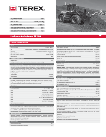 CIĘŻAR UŻYTKOWY 12,5 t MOC SILNIKA 119 kW (162 KM) 2,0-3,5 m3 POJEMNOŚĆ ŁYŻKI OBCIĄŻENIE PRZEWRACAJĄCE, PROSTO 8,7 t OBCIĄŻENIE PRZEWRACAJĄCE, POD KĄTEM 7,6 t Ładowarka kołowa TL210 Dane techniczne Silnik Parametry eksploatacyjne, wyposażenie standardowe Producent, produkt Typ Cummins, QSB 6.7 6-cylindrowy silnik wysokoprężny z turbodoładowaniem, COM III/EPA III Cykl pracy 4-suwowy, system wtryskowy Common Rail 6700 cm3 Pojemność skokowa Moc wg ISO 9249 przy 2200 min-1 119 kW (162 KM) Układ chłodzący Woda Instalacja elektryczna Napięcie robocze 24 V Ciężar użytkowy (ISO 6016) 12500 kg Obciążenie przewracające, na prosto (ISO 14397-1), montaż bezpośredni / układ szybkiej wymiany 8700 / 8340 kg Obciążenie przewracające, pod kątem (ISO 14397-1), montaż bezpośredni / układ szybkiej wymiany 7600 / 7280 kg Długość całkowita, łyżka na podłożu 7095 mm Szerokość całkowita 2500 mm Promień skrętu na zewnętrznej krawędzi łyżki standardowej 5970 mm Rozstaw osi 3100 mm Wysokość z kabiną 3260 mm Instalacja oświetleniowa zgodna z przepisami ruchu drogowego i normą europejską. Układ hydrauliczny Przeniesienie mocy Wydajność pompy maks. 160 l/min Hydrostatyczny napęd jazdy w zamkniętym obiegu, niezależny od hydrauliki ładowarki. Zaawansowana automatyka jazdy, samoczynna optymalizacja siły pociągowej i prędkości. Regulacja silnika hydraulicznego w funkcji obciążenia umożliwia wybór jednego z dwóch zakresów prędkości. Płynna regulacja prędkości do przodu i do tyłu. Napęd na wszystkie koła przekazywany z przekładni redukcyjnej na tylnej osi przez wał przegubowy na przednią oś. Pedał hamulca z funkcją pełzania. Ciśnienie robocze 270 bar 2 stopnie prędkości: „Zakres jazdy I“ 0-6 km/h „Zakres jazdy II“ 0-40 km/h Osie są sterowalne równocześnie i niezależnie. Dźwignia sterująca (uchwyt wielofunkcyjny) dla 2 siłowników podnoszących i 1 przechylającego ze zintegrowanym przełącznikiem dodatkowego obwodu sterującego i przełącznikiem kierunku jazdy. Obiegi sterujące „podnoszenie/opuszczanie“, „przechylanie do góry/do dołu“ hydraulicznie wspomagane. Pozycja pływająca w obwodzie sterującym „opuszczanie", sterowana elektrohydraulicznie. Elektrohydraulicznie uruchamiany zawór dla dodatkowego obwodu sterującego jest seryjnie wbudowany. Układ ładowania Układ ładowania z kinematyką TSP, bezpośredni montaż narzędzia. Oś przednia: Oś napędu planetarnego, połączona z samoblokującym mechanizmem różnicowym, sztywna. Oś tylna: Oś napędu planetarnego ze zintegrowaną przekładnią redukcyjną, zawieszenie wahliwe, amortyzowana poduszkami gumowym. Samoblokujący mechanizm różnicowy. Kąt wychylenia ± 12° Łyżka załadowcza (ISO 7546) 2,1 m3 Siła podnoszenia przy podłożu (ISO 14397-2) 123400 N Siła zrywająca (ISO 14397-2) 106000 N Podnośnik widłowy Opony Rozmiar standardowy 20,5-25 EM 60 12 PR Opcja 20,5 R 25 XTLA TL Michelin Opcja 20,5 R 25 XHA TL Michelin Opcja 20,5 R 25 XLDD2A Michelin Opcja 20,5 R 25 XMine D2 Michelin Opcja 20,5-25 EM 12 PR SGLD Goodyear Opcja 20,5 R 25 RL-2 Goodyear Opcja 20,5 R 25 GP-2B Goodyear Ogumienie specjalne na zapytanie Hamulce Hamulec roboczy: Hydraulicznie uruchamiany 2-obiegowy hamulec ze wspomaganiem. Lamele w kąpieli olejowej w obu osiach, działające poprzez napęd na wszystkie cztery koła. Hamulec dodatkowy: Hydrostatyczny przez zamknięty obieg napędu jezdnego. Ciężar użyteczny (łączny zakres podnoszenia i kierowania) 4500 kg Ciężar użyteczny (pozycja transportowa), ok. 300 mm nad podłożem, całkowity zakres kierowania 5000 kg Szerokość wspornika wideł 1900 mm Długość widelców (150x60 mm) 1200 mm Współczynnik stateczności 1,25 Wyznaczanie udźwigu użytecznego na równym podłożu = 80% obciążenia przewracającego pod kątem Kabina Elastycznie osadzona stalowa kabina z pełnym widokiem, kontrola ROPS (wg ISO 3471) i FOPS (wg ISO 3449). Kabina operatora wyposażona w dwoje drzwi, elektryczne wycieraczki z przełącznikiem interwałowym i spryskiwaczami z przodu i z tyłu, barwione panoramiczne przeszklenie ze szkła bezpiecznego, odsuwaną szybę z lewej strony. Fotel operatora z hydrauliczną amortyzacją, regulacją wagi i biodrowym pasem bezpieczeństwa zgodnie z ISO 7096 i ISO 6683. Ogrzewanie kabiny z 3-stopniową dmuchawą (przełączaną ze świeżego powietrza na tryb cyrkulacji powietrza) i odmrażaniem szyby przedniej i tylnej. Hamulec postojowy: Hamulec sprężynowy, działający na obie lamele osi tylnej. Układ kierowniczy Klimatronik. Sterowanie przegubowe, 2 siłowniki kierujące z obustronną amortyzacją w położeniach krańcowych, całkowicie hydrauliczne przez zawór priorytetowy Load-Sensing, szybkie i łatwe kierowanie również przy prędkości obrotowej silnika na biegu jałowym. Całkowity kąt odchylenia koła kierowanego Urządzenie sterujące: Proporcjonalny zawór hydrauliczny LUDV z 3 obiegami sterującymi. Wszystkie ruchy 80° Pojemności Pojemność zbiornika diesla 240 l Układ hydrauliczny (włącznie ze zbiornikiem) 135 l Regulacja nachylenia i wysokości kierownicy. Przygotowana do montażu radia. Poziom mocy akustycznej odpowiada dyrektywom WE Ładowarka kołowa TL210 Wymiary: Łyżka standardowa 80° 2350 40° Zawartość zgodnie z ISO 7546: 2,10 m3 Maksymalny ciężar materiału nasypanego: 1,8 t/m3 3260 51° 3010 4040 970 45° 620 30 00 25 100 00 19 35° 3100 1684 60 7° 11 5970 7095 Podnośnik widłowy Łyżka uniwersalna Zawartość zgodnie z ISO 7546: 1,80 m3 Maksymalny ciężar materiału nasypanego: 1,6 t/m3 770 2865 51° 810 500 1820 920 45° 4040 3820 1600 200 80 7580 7° 11 Ciężar użyteczny, cały zakres podnoszenia: 4500 kg Ciężar użyteczny, pozycja transportowa: 5000 kg 40? 40? Rodzaj łyżki 7280 Szerokość Wysokość warstwy nasypanej 80? nasypanego 2350 Ciężar materiału 2350 80? Pojemność 1,8 t/m3 2500 mm 2980 mm 2,00 m3 1,8 t/m3 2500 mm