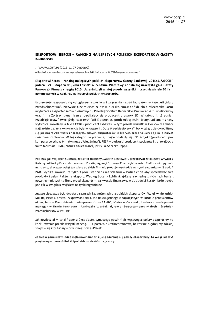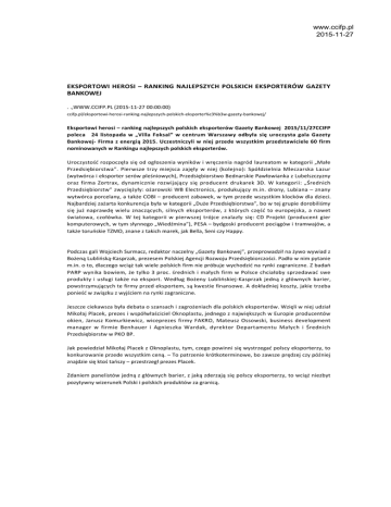 www.ccifp.pl 2015-11-27 EKSPORTOWI HEROSI – RANKING NAJLEPSZYCH POLSKICH EKSPORTERÓW GAZETY BANKOWEJ . .,WWW.CCIFP.PL (2015-11-27 00:00:00) ccifp.pl/eksportowi-herosi-ranking-najlepszych-polskich-eksporter%c3%b3w-gazety-bankowej/ Eksportowi herosi – ranking najlepszych polskich eksporterów Gazety Bankowej 2015/11/27CCIFP poleca 24 listopada w „Villa Foksal” w centrum Warszawy odbyła się uroczysta gala Gazety Bankowej- Firma z energią 2015. Uczestniczyli w niej przede wszystkim przedstawiciele 60 firm nominowanych w Rankingu najlepszych polskich eksporterów. Uroczystość rozpoczęła się od ogłoszenia wyników i wręczenia nagród laureatom w kategorii „Małe Przedsiębiorstwa”. Pierwsze trzy miejsca zajęły w niej (kolejno): Spółdzielnia Mleczarska Lazur (wytwórca i eksporter serów pleśniowych), Przedsiębiorstwo Bednarskie Pawłowianka z Lubelszczyzny oraz firma Zortrax, dynamicznie rozwijający się producent drukarek 3D. W kategorii: „Średnich Przedsiębiorstw” zwyciężyły: ożarowski WB Electronics, produkujący m.in. drony, Lubiana – znany wytwórca porcelany, a także COBI – producent zabawek, w tym przede wszystkim klocków dla dzieci. Najbardziej zażarta konkurencja była w kategorii „Duże Przedsiębiorstwa”, bo w tej grupie dorobiliśmy się już naprawdę wielu znaczących, silnych eksporterów, z których część to europejska, a nawet światowa, czołówka. W tej kategorii w pierwszej trójce znalazły się: CD Projekt (producent gier komputerowych, w tym słynnego „Wiedźmina”), PESA – bydgoski producent pociągów i tramwajów, a także toruńskie TZMO, znane z takich marek, jak Bella, Seni czy Happy. Podczas gali Wojciech Surmacz, redaktor naczelny „Gazety Bankowej”, przeprowadził na żywo wywiad z Bożeną Lublińską-Kasprzak, prezesem Polskiej Agencji Rozwoju Przedsiębiorczości. Padło w nim pytanie m.in. o to, dlaczego wciąż tak wiele polskich firm nie próbuje wychodzić na rynki zagraniczne. Z badań PARP wynika bowiem, że tylko 3 proc. średnich i małych firm w Polsce chciałoby sprzedawać swe produkty i usługi także na eksport. Według Bożeny Lublińskiej-Kasprzak jedną z głównych barier, powstrzymujących te firmy przed eksportem, są kwestie finansowe. A dokładniej koszty, jakie trzeba ponieść w związku z wyjściem na rynki zagraniczne. Jeszcze ciekawsza była debata o szansach i zagrożeniach dla polskich eksporterów. Wzięli w niej udział Mikołaj Placek, prezes i współwłaściciel Oknoplastu, jednego z największych w Europie producentów okien, Janusz Komurkiewicz, wiceprezes firmy FAKRO, Mateusz Ossowski, business development manager w firmie Benhauer i Agnieszka Wardak, dyrektor Departamentu Małych i Średnich Przedsiębiorstw w PKO BP. Jak powiedział Mikołaj Placek z Oknoplastu, tym, czego powinni się wystrzegać polscy eksporterzy, to konkurowanie przede wszystkim ceną. – To patrzenie krótkoterminowe, bo zawsze prędzej czy później znajdzie się ktoś tańszy – przestrzegł prezes Placek. Zdaniem panelistów jedną z głównych barier, z jaką zderzają się polscy eksporterzy, to wciąż niezbyt pozytywny wizerunek Polski i polskich produktów za granicą. www.ccifp.pl 2015-11-27 Głównym partnerem rankingu i gali „Firmy z energią” była Polska Grupa Energetyczna, partnerami merytorycznymi – PKO BP i Orange, partnerami honorowymi – Polsko Niemiecka Izba PrzemysłowoHandlowa i Francusko-Polska Izba Gospodarcza, a partnerami gali: Villa Foksal Restaurant & Catering oraz firma Kapsch. Więcej informacji w grudniowym i styczniowym wydaniu „Gazety Bankowej” oraz na stronie : http://www.gb.pl/firma-z-energia-2015-pproject-2.html
