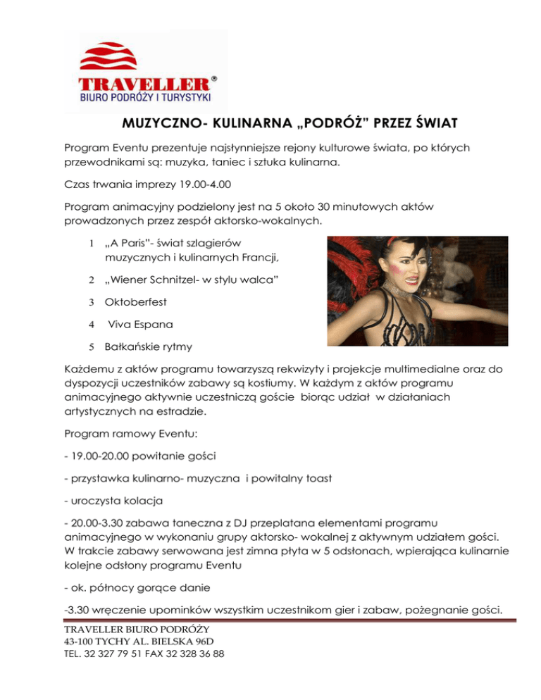 MUZYCZNO- KULINARNA „PODRÓś” PRZEZ ŚWIAT Program Eventu prezentuje najsłynniejsze rejony kulturowe świata, po których przewodnikami są: muzyka, taniec i sztuka kulinarna. Czas trwania imprezy 19.00-4.00 Program animacyjny podzielony jest na 5 około 30 minutowych aktów prowadzonych przez zespół aktorsko-wokalnych. 1 „A Paris”- świat szlagierów muzycznych i kulinarnych Francji, 2 „Wiener Schnitzel- w stylu walca” 3 Oktoberfest 4 Viva Espana 5 Bałkańskie rytmy KaŜdemu z aktów programu towarzyszą rekwizyty i projekcje multimedialne oraz do dyspozycji uczestników zabawy są kostiumy. W kaŜdym z aktów programu animacyjnego aktywnie uczestniczą goście biorąc udział w działaniach artystycznych na estradzie. Program ramowy Eventu: - 19.00-20.00 powitanie gości - przystawka kulinarno- muzyczna i powitalny toast - uroczysta kolacja - 20.00-3.30 zabawa taneczna z DJ przeplatana elementami programu animacyjnego w wykonaniu grupy aktorsko- wokalnej z aktywnym udziałem gości. W trakcie zabawy serwowana jest zimna płyta w 5 odsłonach, wpierająca kulinarnie kolejne odsłony programu Eventu - ok. północy gorące danie -3.30 wręczenie upominków wszystkim uczestnikom gier i zabaw, poŜegnanie gości. TRAVELLER BIURO PODRÓŻY 43-100 TYCHY AL. BIELSKA 96D TEL. 32 327 79 51 FAX 32 328 36 88