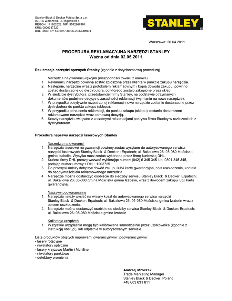 Stanley Black & Decker Polska Sp. z o.o. 02-796 Warszawa, ul. Migdałowa 4 REGON: 141602528, NIP: 9512267484 KRS: 0000317222 BRE Bank: 87114019770000592033001001 Warszawa: 20.04.2011 PROCEDURA REKLAMACYJNA NARZĘDZI STANLEY WaŜna od dnia 02.05.2011 Reklamacje narzędzi ręcznych Stanley (zgodnie z dotychczasową procedurą) Narzędzia na gwarancji/rękojmi (niezgodności towaru z umową) 1. Reklamacji narzędzi powinna zostać zgłoszona przez klienta w punkcie zakupu narzędzia. 2. Następnie, narzędzie wraz z protokołem reklamacyjnym i kopią dowodu zakupu, powinno zostać dostarczone do dystrybutora, od którego zostało zakupione przez sklep. 3. W siedzibie dystrybutora, przedstawiciel firmy Stanley, na podstawie otrzymanych dokumentów podejmie decyzje o zasadności reklamacji (wymianie na nowe narzędzie). 4. W przypadku pozytywnie rozpatrzonej reklamacji nowe narzędzie zostanie dostarczone przez dystrybutora do punktu zakupu (sklepu). 5. W przypadku odrzucenia reklamacji, do punktu zakupu (sklepu) zostanie dostarczone reklamowane narzędzie wraz odmowną decyzją. 6. Koszty narzędzia związane z zasadnymi reklamacjami pokrywa firma Stanley w rozliczeniach z dystrybutorem. Procedura naprawy narzędzi laserowych Stanley Narzędzia na gwarancji 1. Narzędzia laserowe na gwarancji powinny zostać wysyłane do autoryzowanego serwisu narzędzi laserowych Stanley Black & Decker : Erpatech; ul. Bakaliowa 26; 05-080 Mościska gmina Izabelin. Wysyłka musi zostać wykonana przez firmę kurierską DHL. 2. Kuriera firmy DHL proszę wezwać wybierając numer: (042) 6 345 345 lub 0801 345 345, podając numer umowy z DHL: 1203725. 3. Do przesyłki naleŜy dołączyć dowód zakupu lub/i kartę gwarancyjna, opis uszkodzenia, kontakt do osoby/właściciela reklamowanego narzędzia. 4. Narzędzie moŜna dostarczyć osobiście do siedziby serwisu Stanley Black & Decker: Erpatech; ul. Bakaliowa 26; 05-080 gmina Mościska gmina Izabelin, wraz z dowodem zakupu lub/i kartą gwarancyjną. Naprawy pogwarancyjne 1. Narzędzia naleŜy wysłać na własny koszt do autoryzowanego serwisu narzędzi Stanley Black & Decker: Erpatech; ul. Bakaliowa 26; 05-080 Mościska gmina Izabelin wraz z opisem uszkodzenia. 2. Narzędzie moŜna dostarczyć osobiste do siedziby serwisu Stanley Black & Decker: Erpatech; ul. Bakaliowa 26; 05-080 Mościska gmina Izabelin. Kalibracja urządzeń 1. Wszystkie urządzenia mogą być kalibrowane samodzielnie przez uŜytkownika (zgodnie z instrukcją obsługi), lub odpłatnie w autoryzowanym serwisie. Lista produktów objętych naprawami gwarancyjnymi i pogwarancyjnymi: - lasery rotacyjne - niwelatory optyczne - lasery krzyŜowe Martin i Multiline - niwelatory punktowe - detektory promienia Andrzej Mroczek Trade Marketing Manager Stanley Black & Decker, Poland +48 603 631 811