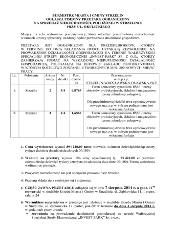 . BURMISTRZ MIASTA I GMINY STRZELIN OGŁASZA PISEMNY PRZETARG OGRANICZONY NA SPRZEDAŻ NIERUCHOMOŚCI, POŁOŻONEJ W STRZELINIE PRZY UL. OKULICKIEGO Mający na celu wyłonienie przedsiębiorcy, który nabędzie przedmiotową nieruchomość w ramach umowy sprzedaży, na której będzie prowadzona działalność gospodarcza. Lp. 1. PRZETARG JEST OGRANICZONY DLA PRZEDSIĘBIORCÓW, KTÓRZY W TERMINIE DO DNIA SKŁADANIA OFERT, UZYSKAJĄ ZEZWOLENEIE NA PROWADZENIE DZIAŁALNOŚCI GOSPODARCZEJ NA TERENIE WAŁBRZYSKIEJ SPECJALNEJ STREFY EKONOMICZNEJ „INVEST-PARK” SP. Z O.O., KTÓRZY ZAMIERZAJĄ PODJĄĆ NA WSKAZANEJ NIERUCHOMOŚCI DZIAŁALNOŚĆ GOSPODARCZĄ, POLEGAJĄCĄ NA BUDOWIE ZAKŁADU PRODUKCYJNEGO, W KTÓRYM DOCELOWO ZOSTANIE UTWORZONYCH MIN. 200 NOWYCH MIEJSC PRACY. Położenie Arkusz Nr Pow. Przeznaczenie mapy działki działki w m.p.z.p. ha STRZELIN-WROCŁAWSKA-OŁAWSKA-PKP Teren oznaczony symbolem 1P,U –tereny Strzelin 2 5/4 0,8765 obiektów produkcyjnych, składów i magazynów; tereny zabudowy usługowej 2. Strzelin 3 2/4 1,6567 Dla przedmiotowej działki trwa opracowywanie nowego m.p.z.p. w którym podtrzymana jest wskazana funkcja Teren oznaczony symbolem 1P,U –tereny obiektów produkcyjnych, składów i magazynów; tereny zabudowy usługowej Dla przedmiotowej działki trwa opracowywanie nowego m.p.z.p. w którym podtrzymana jest wskazana funkcja 1. Cena wywoławcza wynosi 894 220,00 netto (słownie: osiemset dziewięćdziesiąt cztery tysiące dwieście dwadzieścia złotych 00/100) 2. Wadium na przetarg wynosi 10% ceny wywoławczej tj. 89 422,00 zł (słownie: osiemdziesiąt dziewięć tysięcy czterysta dwadzieścia dwa złote 00/100). Formą wniesienia wadium jest pieniądz. 3. Powyższa nieruchomość nie jest obciążona prawami osób trzecich. 4. Przetarg składa się z części jawnej i niejawnej. 5. CZĘŚĆ JAWNA PRZETARGU odbędzie się w dniu 7 sierpnia 2014 r. o godz. 1100 (czwartek) w siedzibie Urzędu Miasta i Gminy w Strzelinie, ul. Ząbkowicka 11, I piętro, sala nr 24 6. Warunkiem uczestnictwa w przetargu jest złożenie w siedzibie Urzędu Miasta i Gminy w Strzelinie, ul. Ząbkowicka 11 /parter, pok.20/ w terminie do dnia 4 sierpnia 2014 r. w godzinach pracy urzędu: zezwolenia na prowadzenie działalności gospodarczej na terenie Wałbrzyskiej Specjalnej Strefy Ekonomicznej „INVEST-PARK” Sp. z o.o.; oświadczenia, że oferent zapoznał się z warunkami przetargu zawartymi w ogłoszeniu oraz w Specyfikacji istotnych warunków przetargu pisemnego ograniczonego i przyjmuje te warunki bez zastrzeżeń Ww. dokumenty powinny być umieszczone w zaklejonej kopercie z napisem „Kwalifikacja uczestnictwa w przetargu na sprzedaż nieruchomości, położonej w Strzelinie przy ul. Okulickiego) wpłacenie wadium w pieniądzu do kasy Urzędu Miasta i Gminy w Strzelinie czynnej w pn, śr. i cz. od 8.00. do 14.00, we wt. od 8.00. do 16.00 oraz w pt. od 8.00 do 13.00 lub na konto Urzędu Miasta i Gminy w Strzelinie prowadzone przez Gospodarczy Bank Spółdzielczy w Strzelinie nr 84 9588 0004 0000 7780 2000 0060. Wadium wpłacone przez oferenta, który przetarg wygra, zalicza się na poczet ceny nabycia nieruchomości. Wadium ulega przepadkowi w razie uchylenia się oferenta, który przetarg wygra od zawarcia umowy notarialnej przeniesienia prawa własności nieruchomości w terminie wyznaczonym przez Urząd Miasta i Gminy w Strzelinie. złożenie pisemnej oferty wypełnionej zgodnie ze Specyfikacją istotnych warunków przetargu pisemnego ograniczonego podpisanej przez oferenta w zamkniętej kopercie z dopiskiem „Oferta na przetarg pisemny ograniczony na sprzedaż nieruchomości, położonej w Strzelinie przy ul. Okulickiego – w dniu 7 sierpnia 2014 r.” W niniejszym przetargu obowiązuje Specyfikacja istotnych warunków przetargu pisemnego ograniczonego, którą można uzyskać w Wydziale Nieruchomości, Urbanistyki i Rolnictwa Urzędu Miasta i Gminy w Strzelinie, ul. Ząbkowicka 11, pok. nr 45 i 47 bądź jest do pobrania na stronie internetowej Biuletynu Informacji Publicznej UMiG Strzelin http://bip.gmstrzelin.finn.pl 7.Lista oferentów zakwalifikowanych do uczestnictwa w przetargu wywieszona zostanie na tablicy ogłoszeń znajdującej się w siedzibie Urzędu Miasta i Gminy w Strzelinie, ul. Ząbkowicka 11, nie później niż 1 dzień przed wyznaczonym terminem przetargu. 8.CZĘŚĆ NIEJAWNA PRZETARGU odbędzie się w terminie ustalonym przez Komisję Przetargową podczas części jawnej przetargu 9. Oferty podlegają ocenie na podstawie następujących kryteriów: zaoferowanej ceny, planowanych przedsięwzięć gospodarczych, które mają być podjęte na terenie nieruchomości inne kryteria wpływające na wybór najkorzystniejszej oferty ustalone w Specyfikacji istotnych warunków przetargu pisemnego ograniczonego 10. Burmistrz Miasta i Gminy Strzelin zastrzega sobie prawo odwołania ogłoszonego przetargu bez podania przyczyn lub zamknięcia przetargu bez wybrania którejkolwiek z ofert. 11. Gminie Strzelin przysługuje ustawowe prawo pierwokupu na warunkach określonych w art. 109 ust. 1 pkt 1 ustawy o gospodarce nieruchomościami w przypadku sprzedaży przez Nabywcę nieruchomości niezabudowanej. 12. Cudzoziemcy (w rozumieniu ustawy z dnia 24 marca 1920 r. o nabywaniu nieruchomości przez cudzoziemców – Dz. U. z 2004 r. Nr 167 poz. 1758, z poźn. zm.) w przypadku wygrania przetargu zobowiązani są przed zawarciem umowy notarialnej uzyskać zgodę Ministra Spraw Wewnętrznych i Administracji na nabycie nieruchomości w przypadkach, gdy zgoda ta jest wymagana. 13. Koszty sporządzenia umowy notarialnej oraz opłaty sądowe związane z dokonaniem wpisów w księdze wieczystej ponosi Nabywca. 14.Sprzedaż nieruchomości objęta jest 23% stawką podatku VAT na podstawie art. 41 ust. 1 w związku z art. 146a pkt 1 ustawy z dnia 11 marca 2004 r. o podatku od towarów i usług (tekst jednolity Dz. U. z 2011 r. Nr 177 poz. 1054, z poźn. zm.). 15. Ewentu