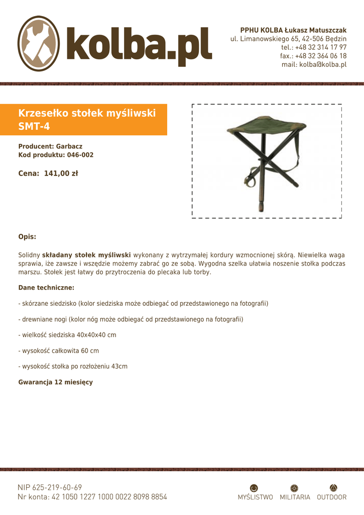 Krzesełko stołek myśliwski SMT-4 Producent: Garbacz Kod produktu: 046-002 Cena: 141,00 zł Opis: Solidny składany stołek myśliwski wykonany z wytrzymałej kordury wzmocnionej skórą. Niewielka waga sprawia, iże zawsze i wszędzie możemy zabrać go ze sobą. Wygodna szelka ułatwia noszenie stołka podczas marszu. Stołek jest łatwy do przytroczenia do plecaka lub torby. Dane techniczne: - skórzane siedzisko (kolor siedziska może odbiegać od przedstawionego na fotografii) - drewniane nogi (kolor nóg może odbiegać od przedstawionego na fotografii) - wielkość siedziska 40x40x40 cm - wysokość całkowita 60 cm - wysokość stołka po rozłożeniu 43cm Gwarancja 12 miesięcy