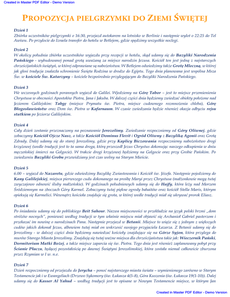 Created in Master PDF Editor - Demo Version Dzień 1 Zbiórka uczestników pielgrzymki o 16:30, przejazd autokarem na lotnisko w Berlinie i następnie wylot o 22:25 do Tel Awiwu. Po przylocie do Izraela transfer do hotelu w Betlejem, gdzie spędzimy wszystkie noclegi. Dzień 2 W okolicy południa zbiórka uczestników wyjazdu przy recepcji w hotelu, skąd udamy się do Bazyliki Narodzenia Pańskiego - wybudowanej ponad grotą uważaną za miejsce narodzin Jezusa. Kościół ten jest jedną z najstarszych chrześcijańskich świątyń, w której odprawiane są nabożeństwa. W Betlejem odwiedzimy także Grotę Mleczną, w której jak głosi tradycja znalazła schronienie Święta Rodzina w drodze do Egiptu. Tego dnia planowana jest wspólna Msza Św. w kościele Św. Katarzyny – kościele bezpośrednio przylegającym do Bazyliki Narodzenia Pańskiego. Dzień 3 We wczesnych godzinach porannych wyjazd do Galilei. Wjedziemy na Górę Tabor – jest to miejsce przemienienia Chrystusa w obecności Apostołów Piotra, Jana i Jakuba. W dalszej części dnia będziemy zwiedzać obiekty położone nad Jeziorem Galilejskim: Tabgę (miejsce Prymatu św. Piotra, miejsce cudownego rozmnożenia chleba), Górę Błogosławieństw oraz Dom św. Piotra w Kafarnaum. W czasie zwiedzania będzie również okazja odbyciu rejsu statkiem po Jeziorze Galilejskim. Dzień 4 Cały dzień zostanie przeznaczony na poznawanie Jerozolimy. Zwiedzanie rozpoczniemy od Góry Oliwnej, gdzie zobaczymy Kościół Ojcze Nasz, a także Kościół Dominus Flevit i Ogród Oliwny z Bazyliką Agonii oraz Grotą Zdrady. Dalej udamy się do starej Jerozolimy, gdzie przy Kaplicy Biczowania rozpoczniemy nabożeństwo drogi krzyżowej (wedle tradycji jest to ta sama droga, którą przeszedł Jezus Chrystus dokonując naszego odkupienia w dniu męczeńskiej śmierci na Golgocie). W trakcie drogi krzyżowej będziemy na Golgocie oraz przy Grobie Pańskim. Po zwiedzeniu Bazyliki Grobu przewidziany jest czas wolny na Starym Mieście. Dzień 5 6.00 – wyjazd do Nazaretu, gdzie odwiedzimy Bazylikę Zwiastowania i Kościół św. Józefa. Następnie pojedziemy do Kany Galilejskiej, miejsca pierwszego cudu dokonanego na prośbę Maryi przez Chrystusa (małżonkowie mogą tutaj zwyczajowo odnowić śluby małżeńskie). W godzinach południowych udamy się do Hajfy, która leży nad Morzem Śródziemnym na zboczach Góry Karmel. Zobaczymy tutaj piękne ogrody bahaitów oraz kościół Stella Maris, którym opiekują się Karmelici. Wewnątrz kościoła znajduje się grota, w której wedle tradycji miał się ukrywać prorok Eliasz. Dzień 6 Po śniadaniu udamy się do pobliskiego Beit Sahour. Nazwa miejscowości w przekładzie na język polski brzmi „dom stróżów nocnych”, ponieważ według tradycji w tym właśnie miejscu miał objawić się Archanioł Gabriel pasterzom i przekazać im nowinę o narodzinach Pana. Następnie przejazd w Betanii. Miejsce to wiąże się z jednym z większych cudów jakich dokonał Jezus, albowiem tutaj miał on wskrzesić swojego przyjaciela Łazarza. Z Betanii udamy się do Jerozolimy - w dalszej części dnia będziemy nawiedzać kościoły znajdujące się na Górze Syjon, która przylega do murów Starego Miasta Jerozolimy. Znajdują się tutaj ważne miejsca dla chrześcijaństwa takie jak: Wieczernik Pański, Dormitorium Matki Bożej, a także miejsce zaparcia się św. Piotra. Tego dnia jest również zaplanowany pobyt przy Ścianie Płaczu, będącej pozostałością po dawnej Świątyni Jerozolimskiej, która została niemal całkowicie zburzona przez Rzymian w I w. n.e. Dzień 7 Dzień rozpoczniemy od przejazdu do Jerycha – ponoć najstarszego miasta świata – wymienionego zarówno w Starym Testamencie jak i w Ewangeliach (Drzewo Sykomory (św. Łukasza 4(5-8), Góra Kuszenia (św. Łukasza 19(1-10)). Dalej udamy się do Kasser Al Yahud – według tradycji jest to opisane w Nowym Testamencie miejsce, w którym Jan Created in Master PDF Editor - Demo Version Created in Master PDF Editor - Demo Version Chrzciciel ochrzcił Jezusa Chrystusa. Po odnowieniu przyrzeczeń chrzcielnych udamy się do Qumran – zwiedzanie wykopalisk starożytnej osady zamieszkiwanej przez esseńczyków. Tego dnia nie zabraknie również chwili relaksu, albowiem jest przewidziany pobyt nad Morzem Martwym – jednym z najbardziej zasolonych akwenów wodnych na świecie. Średnie zasolenie jest ponad dziesięciokrotnie wyższe niż w Bałtyku. Dzień 8 Wyjazd z hotelu do miejscowości Ein Karem. W miejscowości tej wedle tradycji chrześcijańskiej na świat miał przyjść Jan Chrzciciel. W pierwszej kolejności udamy się do Kościoła Nawiedzenia, który został wybudowany na pamiątkę spotkania Marii ze swoją krewną Elżbietą, która już 6-sty miesiąc nosiła Jana Chrzciciela w swym łonie. Udamy się również do kościoła Jana Chrzciciela, w którym jest czczone miejsce jego narodzin. Następnie udamy się do Instytutu Męczenników i Bohaterów Holocaustu Yad Vashem. Miejsce to powstało w latach 50-tych poprzedniego wieku w celu upamiętnienia ofiar żydowskich okresu II Wojny Światowej. Według różnych szacunków w latach 1939-1945 zostało zamordowanych ponad 6 milionów żydów. Tego dnia odwiedzimy również Emaus Nikopolis. Wedle tradycji właśnie tutaj zmartwychwstały Chrystus miał spotkać swoich uczniów. Dzień 9 W okolicy 1:30 wyjazd na lotnisko do Tel – Awiwu skąd nastąpi wylot powrotny do Berlina. Z Berlina następnie autokarem transfer na miejsce zbiórki z dnia pierwszego. Cena: 2090 PLN + 380 USD Termin wyjazdu: 27.01-04.02.2017 Cena obejmuje: przelot samolotem w obie strony, tranzyt autokarem klimatyzowanym na i z lotniska oraz przejazdy autokarowe na terenie Izraela, zakwaterowanie w hotelu - pokoje 2,3 osobowe, śniadania od 2-go do 9-go dnia oraz obiadokolacje od 2-go do 8-go dnia, opieka pilota i przewodnika miejscowego, ubezpieczenie KL i NNW. Cena nie obejmuje: bakszyszu, 