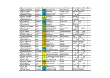nr 1 2 3 4 5 6 7 8 9 10 11 12 13 14 15 16 17 18 19 20 21 22 23 24 25 26 27 28 29 30 31 32 33 34 35 36 37 imie, nazwisko Radoslaw Schenker Michal Nowicki Pawel Switajski Waldemar Nadolny Bartek Blachowski Arkadiusz Szajek Waldek Blachowski Pawel Rybacki Dominik Nowak Tomasz Derek Adam Rzymyszkiewicz Jaroslaw Zurek Jacek Derek Piotr Nowicki Mateusz Kala Marek Slupczewski Pawel Szczepkowski Patryk Milde Pawel Szklarczuk Piotr Slupczewski Tomasz Buller Karol Bilinkiewicz Damian Nadolski Adam Trzebiatowski Marta Nowicka Sebastian Koperski Michal Szczepkowski Marek Rauchfleisz Lukasz Bilinkiewicz Kuba Nadolny Fabian Milde Dominik Ossowski Mikolaj Cieslik Damian Blaszak Piotr Lipa Igor Stasz Jakub Chomicki miasto Glogowo Suchacz Torun Bydgoszcz Torun Poznan Torun Bydgoszcz Torun Torun Torun Poznan Torun Suchacz Bydgoszcz Torun Torun Torun Elblag Torun Torun Torun Elblag Torun Suchacz Czernikowo Torun Torun Torun Bydgoszcz Torun Legionowo Torun Torun Warszawa Warszawa Warszawa klasa WRC S2000 WRC WRC N S2000 S2000 WRC WRC S2000 S2000 S2000 S2000 S2000 S1600 S1600 S2000 S1600 S1600 S1600 S1600 S1600 N WRC S1600 S1600 N N N N N WRC S1600 N S2000 WRC WRC karoseria Subaru Impreza Ford Focus Subaru Impreza 08 Ford Focus WRC Ford Fiesta Toyota Celica Ford Focus Audi quattro Lancer EVO Ford Focus Mitsubishi Evo VI Peugeot 307 WRC Subaru Impreza Lancer Evo VII Tamija Porsche 911 Ford Focus WRC2007 Subaru Impreza Nissan Fairlady Z Audi TT Lancer Evo X LANCER EVO VI HONDA S2000 Lancer Evo X Subaru Impreza 2002 Ford GT Ford Focus WRC2007 Mitsubishi LancerWRC SUBARU IMPREZA 2004 Mercedes CLK Subaru Impreza 96 Ford Fiesta WRC nissan silvia gt Lancer EVO VI Peugeot 206 WRC Ford Fiesta RS WRC podwozie Himoto Nascada Tamiya TB-02 evo 5 Team Losi XXX-S TB-02 TB evo 5 DF-03ra TB-02 Serpent S400 TF-5 losi xxx-s TB-01 Ansmann ARE-1 Himoto Team Associated TC4 TT-01 Himoto Himoto Nascada Himoto TC4 Himoto Himoto HIMOTO KYOSHO FAZER EP Himoto Nascada Tamiya TB-02 HPI E10 Himoto Nascada Himoto Nascada HIMOTO TT-01 Himoto Himoto Himoto Himoto Losi RW Losi XXX-S kwarc1 27,255 Spektrum DSM 40,715 Spektrum 40,925 Spektrum DSM spectrum spektrum 40,865 40,675 spektrum 75,93 75650 Spectrum DSM 2,4DSM 665 Spektrum 2,4DSM 2,4 27,175 2,4ghz 40,395 2,4 26,975 2,4GHz 2,4 40,715 2,4DSM Brak 2,4 2,4ghz 24 spektrum spectrum kwarc2 27,125 Spektrum DSM 40,675 DSM brak 40,885 75,45 75680 Spectrum DSM 2,4DSM 665 Spektrum 2,4DSM 2,4 27,145 40,985 2,4 27,175 2,4GHz 2,4 70,685 2,4DSM Brak 2,4 24 spektrum spectrum GR 1 2 3 1 1 3 1 2 3 1 2 3 1 2 3 2 2 3 1 2 3 1 2 3 2 2 2 3 1 1 3 2 3 1 2 3 1