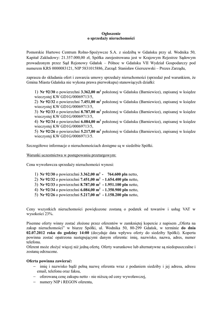Ogłoszenie o sprzedaży nieruchomości Pomorskie Hurtowe Centrum Rolno-Spożywcze S.A. z siedzibą w Gdańsku przy ul. Wodnika 50, Kapitał Zakładowy: 21.357.000,00 zł, Spółka zarejestrowana jest w Krajowym Rejestrze Sądowym prowadzonym przez Sąd Rejonowy Gdańsk – Północ w Gdańsku VII Wydział Gospodarczy pod numerem KRS 0000083121, NIP 5831015886, Zarząd: Stanisław Gierszewski – Prezes Zarządu, zaprasza do składania ofert i zawarcia umowy sprzedaży nieruchomości (sprzedaż pod warunkiem, że Gmina Miasta Gdańska nie wykona prawa pierwokupu) stanowiących działki: 1) Nr 92/30 o powierzchni 3.362,00 m2 położonej w Gdańsku (Barniewice), zapisanej w księdze wieczystej KW GD1G/00069713/5, 2) Nr 92/32 o powierzchni 7.451,00 m2 położonej w Gdańsku (Barniewice), zapisanej w księdze wieczystej KW GD1G/00069713/5, 3) Nr 92/33 o powierzchni 8.787,00 m2 położonej w Gdańsku (Barniewice), zapisanej w księdze wieczystej KW GD1G/00069713/5, 4) Nr 92/34 o powierzchni 6.084,00 m2 położonej w Gdańsku (Barniewice), zapisanej w księdze wieczystej KW GD1G/00069713/5, 5) Nr 92/26 o powierzchni 5.217,00 m2 położonej w Gdańsku (Barniewice), zapisanej w księdze wieczystej KW GD1G/00069713/5. Szczegółowe informacje o nieruchomościach dostępne są w siedzibie Spółki. Warunki uczestnictwa w postępowaniu przetargowym: Cena wywoławcza sprzedaży nieruchomości wynosi: 1) 2) 3) 4) 5) Nr 92/30 o powierzchni 3.362,00 m2 Nr 92/32 o powierzchni 7.451,00 m2 Nr 92/33 o powierzchni 8.787,00 m2 Nr 92/34 o powierzchni 6.084,00 m2 Nr 92/26 o powierzchni 5.217,00 m2 - 764.600 pln netto, - 1.654.400 pln netto, - 1.951.100 pln netto, - 1.350.900 pln netto, - 1.158.200 pln netto, Ceny wszystkich nieruchomości powiększone zostaną o podatek od towarów i usług VAT w wysokości 23%. Pisemne oferty winny zostać złożone przez oferentów w zamkniętej kopercie z napisem „Oferta na zakup nieruchomości” w biurze Spółki, ul. Wodnika 50, 80-299 Gdańsk, w terminie do dnia 02.07.2012 roku do godziny 14:00 (decyduje data wpływu oferty do siedziby Spółki). Koperta powinna zostać opatrzona następującymi danym oferenta: imię, nazwisko, nazwa, adres, numer telefonu. Oferent może złożyć więcej niż jedną ofertę. Oferty warunkowe lub alternatywne są niedopuszczalne i zostaną odrzucone. Oferta powinna zawierać: − imię i nazwisko bądź pełną nazwę oferenta wraz z podaniem siedziby i jej adresu, adresu email, telefonu oraz faksu, − oferowaną cenę zakupu netto - nie niższą od ceny wywoławczej, − numery NIP i REGON oferenta, − zobowiązanie oferenta do pokrycia wszelkich kosztów i opłat związanych z przeniesieniem − − − − prawa własności nieruchomości, wskazanie numeru rachunku bankowego oferenta, na który należy zwrócić wadium, oświadczenie oferenta o zapoznaniu się z warunkami postępowania ofertowego i ich zaakceptowaniu bez zastrzeżeń, oświadczenie oferenta o zapoznaniu się ze stanem prawnym, granicami, warunkami dojazdu do nieruchomości, jej stanem technicznym oraz postanowieniami miejscowego planu zagospodarowania przestrzennego, oferta powinna zostać podpisana przez osoby upoważnione do reprezentacji oferenta, Do oferty należy dołączyć: − w przypadku spółek prawa handlowego i spółdzielni – poświadczony przez Zarząd aktualny tekst jednolity statutu, umowy spółki, innego aktu założycielskiego, − uchwałę właściwych organów o wyrażeniu zgody na zakup nieruchomości – o ile jest wymagana, − aktualny odpis z KRS lub innych właściwych rejestrów (w oryginale) nie starszy niż 30 dni do dnia złożenia oferty, − inny dokument (oryginał lub notarialnie poświadczoną kopię), z którego wynika uprawnienie osób, które podpisały ofertę do jej złożenia w imieniu oferenta oraz dokonania innych niezbędnych do przeniesienia własności nieruchomości czynności. Warunkiem uczestnictwa w postępowaniu ofertowym jest wpłata wadium w wysokości 10% ceny wywoławczej netto, na rachunek organizatora prowadzony przez Bank Millennium S.A. nr: 84 1160 2202 0000 0000 6189 1015 najpóźniej do dnia poprzedzającego dzień otwarcia ofert (w dniu poprzedzającym dzień otwarcia ofert kwota wadium powinna wpłynąć na wskazany wyżej rachunek Spółki). Otwarcie ofert nastąpi w dniu 03.07.2012 roku o godzinie 11:00 w siedzibie Spółki. Zastrzeżenia do postepowania oraz warunki: − organizator zastrzega sobie prawo do swobodnego wyboru oferty, odwołania postępowania ofertowego bez podania przyczyn, zmiany jego warunków, unieważnienia postępowania lub odstąpienia od zamiaru zawarcia umowy sprzedaży bez podania przyczyn, − organizator może powołać Komisję do przeprowadzenia postępowania ofertowego. Organizator może podjąć dodatkowe negocjacje z oferentami, a także przeprowadzić aukcję, m.in. w przypadku złożenia ofert o zbliżonej lub identycznej treści, − wyboru ofert dokonuje organizator. Wybór stanie się prawnie skuteczny wyłącznie pod warunkiem zatwierdzenia go przez Radę Nadzorczą organizatora i wyrażenia przez nią zgody na zawarcie umowy sprzedaży. Posiedzenie Rady Nadzorczej odbędzie się nie później, niż w terminie do dnia 10.07.2012 roku. Postępowanie przetargowe kończy się z chwilą podjęcia przez Radę Nadzorczą uchwały w przedmiocie wyrażenia zgody na zawarcie umowy sprzedaży. − postępowanie ofertowe może zakończyć się bez wyboru jakiejkolwiek oferty, − oferent, którego oferta zostanie wybrana, zobowiązany będzie do zawarcia warunkowej umowy sprzedaży (pod warunkiem, że Gmina Miasta Gdańska nie wykona przysługującego jej prawa pierwokupu) w terminie wyznaczonym przez organizatora w okresie 30 dni od dnia zawiadomienia go o fakcie wyrażenia zgody na zawarcie umowy sprzedaży przez Radę Nadzorczą organizatora, o którym to terminie oferent zostanie niezwłocznie poinformowany telefonicznie lub faksem – pod numerem wskazanym przez