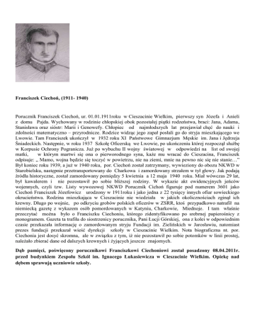 Franciszek Ciechoń, (1911- 1940) Porucznik Franciszek Ciechoń, ur. 01.01.1911roku w Cieszacinie Wielkim, pierwszy syn Józefa i Anieli z domu Pajda. Wychowany w rodzinie chłopskiej obok pozostałej piątki rodzeństwa, braci: Jana, Adama, Stanisława oraz sióstr: Marii i Genowefy. Chłopiec od najmłodszych lat przejawiał chęć do nauki i zdolności matematyczno – przyrodnicze. Rodzice widząc jego zapał posłali go do stryja mieszkającego we Lwowie. Tam Franciszek ukończył w 1932 roku XI Państwowe Gimnazjum Męskie im. Jana i Jędrzeja Śniadeckich. Następnie, w roku 1937 Szkołę Oficerską we Lwowie, po ukończeniu której rozpoczął służbę w Korpusie Ochrony Pogranicza. Już po wybuchu II wojny światowej w odpowiedzi na list od swojej matki, w którym martwi się ona o pierworodnego syna, każe mu wracać do Cieszacina, Franciszek odpisuje: „ Mamo, wojna będzie się toczyć w powietrzu, nie na ziemi, mnie na pewno nic się nie stanie…” Był koniec roku 1939, a już w 1940 roku, por. Ciechoń został zatrzymany, wywieziony do obozu NKWD w Starobielsku, następnie przetransportowany do Charkowa i zamordowany strzałem w tył głowy. Jak podają źródła historyczne, został zamordowany pomiędzy 5 kwietnia a 12 maja 1940 roku. Miał wówczas 29 lat, był kawalerem i nie pozostawił po sobie bliższej rodziny. W wykazie akt ewidencyjnych jeńców wojennych, czyli tzw. Listy wywozowej NKWD Porucznik Cichoń figuruje pod numerem 3601 jako Ciechoń Franciszek Józefowicz urodzony w 1911roku i jako jedna z 22 tysięcy innych ofiar sowieckiego okrucieństwa. Rodzina mieszkająca w Cieszacinie nie wiedziała w jakich okolicznościach zginął ich krewny. Długo po wojnie, po odkryciu grobów polskich oficerów w ZSRR, ktoś przypadkowo natrafił na niemiecką gazetę z wykazem osób pomordowanych w Katyniu, Charkowie, Miednoje. I tam właśnie przeczytać można było o Franciszku Ciechoniu, którego zidentyfikowano po srebrnej papierośnicy z monogramem. Gazeta ta trafiła do siostrzenicy porucznika, Pani Łucji Górskiej, ona z kolei w odpowiednim czasie przekazała informację o zamordowanym stryju Fundacji im. Zielińskich w Jarosławiu, natomiast prezes fundacji przekazał wieść dyrekcji szkoły w Cieszacinie Wielkim. Nota biograficzna nt. por. Ciechonia jest dosyć skromna, ale w związku z tym, iż nie pozostawił po sobie potomków w linii prostej, należało zbierać dane od dalszych krewnych i żyjących jeszcze znajomych. Dąb pamięci, poświęcony porucznikowi Franciszkowi Ciechoniowi został posadzony 08.04.2011r. przed budynkiem Zespołu Szkól im. Ignacego Łukasiewicza w Cieszacinie Wielkim. Opiekę nad dębem sprawują uczniowie szkoły.