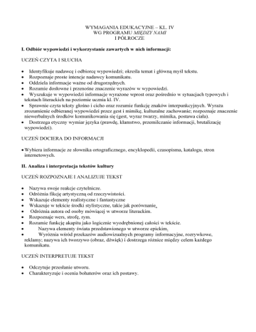 WYMAGANIA EDUKACYJNE – KL. IV WG PROGRAMU MIĘDZY NAMI I PÓŁROCZE I. Odbiór wypowiedzi i wykorzystanie zawartych w nich informacji: UCZEŃ CZYTA I SŁUCHA Identyfikuje nadawcę i odbiorcę wypowiedzi; określa temat i główną myśl tekstu. Rozpoznaje proste intencje nadawcy komunikatu. Oddziela informacje ważne od drugorzędnych. Rozumie dosłowne i przenośne znaczenie wyrazów w wypowiedzi. Wyszukuje w wypowiedzi informacje wyrażone wprost oraz pośrednio w sytuacjach typowych i tekstach literackich na poziomie ucznia kl. IV. • Sprawnie czyta teksty głośno i cicho oraz rozumie funkcję znaków interpunkcyjnych. Wyraża zrozumienie odbieranej wypowiedzi przez gest i mimikę, kulturalne zachowanie; rozpoznaje znaczenie niewerbalnych środków komunikowania się (gest, wyraz twarzy, mimika, postawa ciała). • Dostrzega etyczny wymiar języka (prawdę, kłamstwo, przemilczanie informacji, brutalizację wypowiedzi). • • • • • UCZEŃ DOCIERA DO INFORMACJI • Wybiera informacje ze słownika ortograficznego, encyklopedii, czasopisma, katalogu, stron internetowych. II. Analiza i interpretacja tekstów kultury UCZEŃ ROZPOZNAJE I ANALIZUJE TEKST • • • • • • • • • Nazywa swoje reakcje czytelnicze. Odróżnia fikcję artystyczną od rzeczywistości. Wskazuje elementy realistyczne i fantastyczne Wskazuje w tekście środki stylistyczne, takie jak porównanie. Odróżnia autora od osoby mówiącej w utworze literackim. Rozpoznaje wers, strofę, rym. Rozumie funkcję akapitu jako logicznie wyodrębnionej całości w tekście. Nazywa elementy świata przedstawionego w utworze epickim. Wyróżnia wśród przekazów audiowizualnych programy informacyjne, rozrywkowe, reklamy; nazywa ich tworzywo (obraz, dźwięk) i dostrzega różnice między celem każdego komunikatu. UCZEŃ INTERPRETUJE TEKST • • Odczytuje przesłanie utworu. Charakteryzuje i ocenia bohaterów oraz ich postawy. III. Tworzenie wypowiedzi UCZEŃ MÓWI I PISZE Dostosowuje sposób wyrażania się do oficjalnej i nieoficjalnej sytuacji komunikacyjnej, takiej jak: prośba, pytanie, odmowa, wyjaśnienie, powiadomienie, zaproszenie, przekonywanie; świadomie dobiera wypowiedzenia oznajmujące, rozkazujące, pytające. • Udziela odpowiedzi na zadane pytania w formie wypowiedzenia pojedynczego, złożonego, krótkiej wypowiedzi. • Zadaje rzeczowe pytania. • Rozmawia na tematy związane z codziennością, otaczającą rzeczywistością, przeczytaną lekturą. • Wyraża wprost i pośrednio intencje w swoich komunikatach. • Nazywa uczucia. • Gromadzi wyrazy określające i nazywające cechy charakteru bohatera na podstawie jego zachowań i postaw. • Opisuje przedmiot, miejsce, postać, zwierzę, dzieło sztuki. • Opowiada przebieg zdarzeń zgodnie z ich chronologią.. • Mówi wyraźnie, właściwie akcentuje wyrazy, wprowadza pauzę, stosuje odpowiednią intonację. • Recytuje teksty poetyckie z uwzględnieniem interpunkcji, właściwego tempa i odpowiedniej intonacji. • Tworzy wypowiedzi pisemne, takie jak: list prywatny, opis, opowiadanie, dialog, uwzględnia poznane zasady ortograficzne i interpunkcyjne. • IV. Świadomość językowa Uczeń wykazuje się sprawnością językową z zakresu: FONETYKA • • Zna alfabet i potrafi się posługiwać słownikami. Dzieli wyrazy na głoski, litery, sylaby; rozróżnia funkcję zmiękczającą i sylabotwórczą i. ORTOGRAFIA Poprawnie przenosi wyrazy do następnego wersu; w razie wątpliwości sprawdza podział wyrazu w słowniku ortograficznym. • Wykorzystuje wiedzę o wymianie głosek rz, o, ż, ch, h • Wykorzystuje wiedzę o różnicach w wymowie i pisowni spółgłosek twardych i miękkich do poprawnego zapisu wyrazów. • Stosuje zasadę zapisu wyrazów z ch i rz po spółgłoskach. • Wykorzystuje wiedzę o sylabach w zapisie wyrazów rozpoczynających się cząstkami: ża-, żo-, żu, ży-. • W razie wątpliwości związanych z zapisem wyrazów dociera do informacji w słowniku ortograficznym. • SŁOWOTWÓRSTWO • • • • Dobiera wyrazy pokrewne, tworzy rodziny wyrazów. Odróżnia wyrazy pokrewne od synonimów. Tworzy wyrazy pochodne za pomocą formantów. Analizuje znaczenia wyrazów (objaśnia ich sens, wyjaśnia podobieństwa i różnice znaczeniowe, domyśla się znaczenia na podstawie budowy słowotwórczej i kontekstu). SKŁADNIA • • Tworzy wypowiedzi ze zdań pojedynczych. Celowo używa różnych typów wypowiedzeń. INTERPUNKCJA • Łączy za pomocą spójników współrzędne związki wyrazowe w zdaniu. • Stosuje wielką literę na początku wypowiedzenia i odpowiednie znaki interpunkcyjne na jego końcu w zależności od intencji wypowiedzi. SŁOWNICTWO Dobiera wyrazy bliskoznaczne i przeciwstawne. Stosuje frazeologizmy i przysłowia związane z omawianą tematyką, objaśnia ich znaczenia dosłowne i metaforyczne. • Stosuje słownictwo, zwroty i wyrażenia służące do opisu, formułowania ocen i opinii, wyrażania intencji, emocji i uczuć. • Posługuje się słownictwem o znaczeniu dosłownym i przenośnym. • • WYMAGANIA EDUKACYJNE – KL. IV WG PROGRAMU MIĘDZY NAMI II PÓŁROCZE I. Odbiór wypowiedzi i wykorzystanie zawartych w nich informacji: UCZEŃ CZYTA I SŁUCHA • Identyfikuje nadawcę i odbiorcę wypowiedzi; określa temat i główną myśl tekstu. • Rozpoznaje proste intencje nadawcy komunikatu. • Oddziela informacje ważne od drugorzędnych. • Rozumie dosłowne i przenośne znaczenie wyrazów w wypowiedzi. • Wyszukuje w wypowiedzi informacje wyrażone wprost oraz pośrednio w sytuacjach typowych i tekstach literackich na poziomie ucznia kl. IV, a także w: słuchowisku radiowym, przedstawieniu teatralnym, filmie, komiksie, na fotografii, obrazie. • Wyróżnia części składowe wypowiedzi: tytuł, wstęp, rozwinięcie, zakończenie, akapit. • Odróżnia teksty literackie od użytkowych; rozpoznaje cechy zaproszenia, życzeń, gratulacji, zawiadomienia, ogło