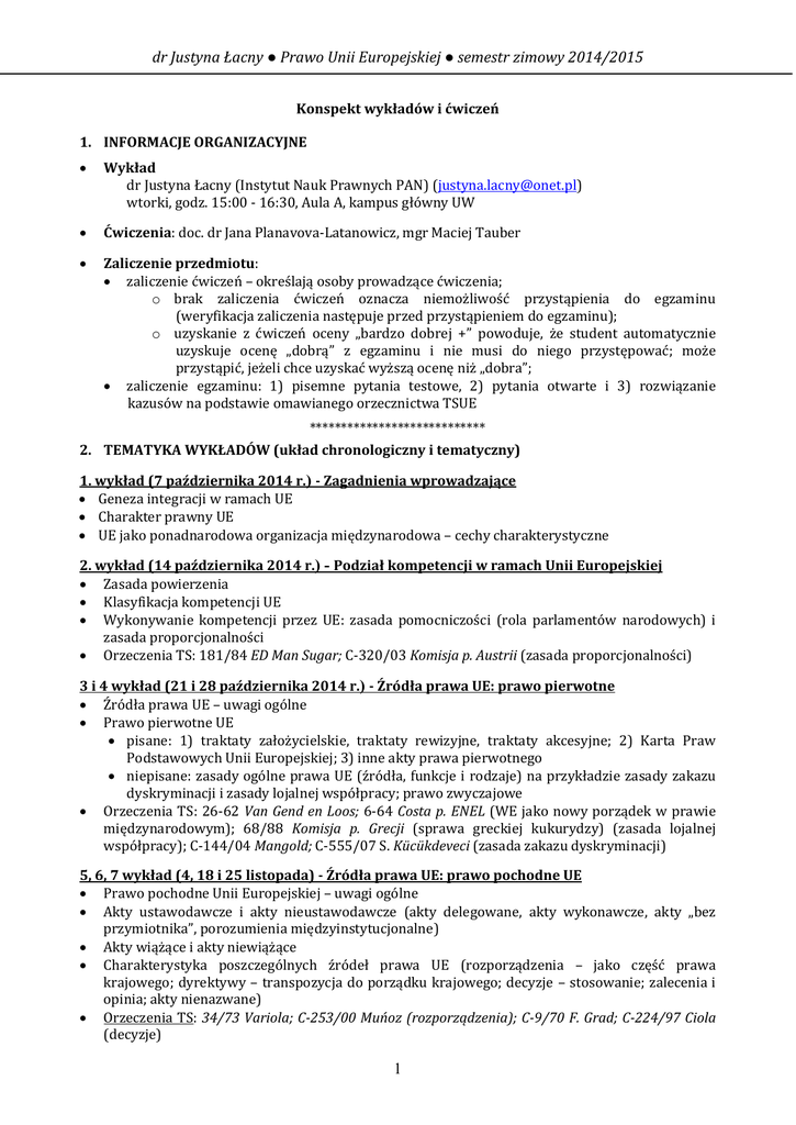 dr Justyna Łacny ● Prawo Unii Europejskiej ● semestr zimowy 2014/2015 Konspekt wykładów i ćwiczeń 1. INFORMACJE ORGANIZACYJNE Wykład dr Justyna Łacny (Instytut Nauk Prawnych PAN) ([email protected]) wtorki, godz. 15:00 - 16:30, Aula A, kampus główny UW Ćwiczenia: doc. dr Jana Planavova-Latanowicz, mgr Maciej Tauber Zaliczenie przedmiotu: zaliczenie ćwiczeń – określają osoby prowadzące ćwiczenia; o brak zaliczenia ćwiczeń oznacza niemożliwość przystąpienia do egzaminu (weryfikacja zaliczenia następuje przed przystąpieniem do egzaminu); o uzyskanie z ćwiczeń oceny „bardzo dobrej +” powoduje, że student automatycznie uzyskuje ocenę „dobrą” z egzaminu i nie musi do niego przystępować; może przystąpić, jeżeli chce uzyskać wyższą ocenę niż „dobra”; zaliczenie egzaminu: 1) pisemne pytania testowe, 2) pytania otwarte i 3) rozwiązanie kazusów na podstawie omawianego orzecznictwa TSUE **************************** 2. TEMATYKA WYKŁADÓW (układ chronologiczny i tematyczny) 1. wykład (7 października 2014 r.) - Zagadnienia wprowadzające Geneza integracji w ramach UE Charakter prawny UE UE jako ponadnarodowa organizacja międzynarodowa – cechy charakterystyczne 2. wykład (14 października 2014 r.) - Podział kompetencji w ramach Unii Europejskiej Zasada powierzenia Klasyfikacja kompetencji UE Wykonywanie kompetencji przez UE: zasada pomocniczości (rola parlamentów narodowych) i zasada proporcjonalności Orzeczenia TS: 181/84 ED Man Sugar; C-320/03 Komisja p. Austrii (zasada proporcjonalności) 3 i 4 wykład (21 i 28 października 2014 r.) - Źródła prawa UE: prawo pierwotne Źródła prawa UE – uwagi ogólne Prawo pierwotne UE pisane: 1) traktaty założycielskie, traktaty rewizyjne, traktaty akcesyjne; 2) Karta Praw Podstawowych Unii Europejskiej; 3) inne akty prawa pierwotnego niepisane: zasady ogólne prawa UE (źródła, funkcje i rodzaje) na przykładzie zasady zakazu dyskryminacji i zasady lojalnej współpracy; prawo zwyczajowe Orzeczenia TS: 26-62 Van Gend en Loos; 6-64 Costa p. ENEL (WE jako nowy porządek w prawie międzynarodowym); 68/88 Komisja p. Grecji (sprawa greckiej kukurydzy) (zasada lojalnej współpracy); C-144/04 Mangold; C-555/07 S. Kücükdeveci (zasada zakazu dyskryminacji) 5, 6, 7 wykład (4, 18 i 25 listopada) - Źródła prawa UE: prawo pochodne UE Prawo pochodne Unii Europejskiej – uwagi ogólne Akty ustawodawcze i akty nieustawodawcze (akty delegowane, akty wykonawcze, akty „bez przymiotnika”, porozumienia międzyinstytucjonalne) Akty wiążące i akty niewiążące Charakterystyka poszczególnych źródeł prawa UE (rozporządzenia – jako część prawa krajowego; dyrektywy – transpozycja do porządku krajowego; decyzje – stosowanie; zalecenia i opinia; akty nienazwane) Orzeczenia TS: 34/73 Variola; C-253/00 Muńoz (rozporządzenia); C-9/70 F. Grad; C-224/97 Ciola (decyzje) 1 dr Justyna Łacny ● Prawo Unii Europejskiej ● semestr zimowy 2014/2015 8, 9, 10, wykład (2, 9 i 16 grudnia 2014 r.) – Stosowanie prawa UE w porządkach prawnych państw członkowskich Wprowadzenie – zasada efektywności prawa Unii (effet utile) (art. 4 ust. 3 TUE) Zasada pierwszeństwa prawa Unii wobec prawa krajowego: terminologia; mechanizmy stosowania; pierwszeństwo z punktu widzenia UE i państw członkowskich Zasada bezpośredniego skutku prawa UE: terminologia; bezpośredni skutek przepisów traktatowych, rozporządzeń, dyrektyw, decyzji i umów międzynarodowych; bezpośredni skutek w relacjach wertykalnych i horyzontalnych; pojęcie emanacji państwa Zasada skutku pośredniego prawa UE i jej ograniczenia (wykładnia prounijna prawa krajowego) Odpowiedzialność państwa członkowskiego za szkody powstałe wskutek naruszenia prawa UE: geneza; przesłanki materialne i procedura dochodzenia roszczeń odszkodowawczych Orzeczenia TS: 6-64 Costa p. ENEL; 11-70 Internationale Handelsgesellschaft; 35/76 i 106/77 Simmenthal I i II; 285/98 T. Kreil; C-314/08 Filipiak (pierwszeństwo prawa UE); 26-62 Van Gend en Loos; 41/74 Y. van Duyn; 43/75 Defrenne p. SABENA; 8/81 S. Becker; 152/84; M. H. Marshall; C91/92 P. F. Dori; C-194/94 CIA Security International (bezpośredni skutek prawa UE); 14/83 von Colson, Kamann; 80/86 Kolpinghuis (prounijna wykładnia); C-6/90 i C-9/90 Francovich, Bonifaci; C-46/93 i C-48/93 Brasserie du Pêcheur/Factortame (odpowiedzialność odszkodowawcza) 11, 12 wykład (13 i 20 stycznia 2015 r.) - Sądowa kontrola przestrzegania prawa UE Skarga o stwierdzenie nieważności aktu prawa UE (art. 263 TFUE): podmioty posiadające czynną i bierną legitymację procesową; zaskarżalne akty; przesłanki stwierdzenia nieważności; terminy na złożenie skargi; zarzut bezprawności (art. 277 TfUE); skutki prawne orzeczenia (art. 264 TFUE); obowiązki instytucji UE której akt został unieważniony (art. 266 TfUE) Skargi o stwierdzenie uchybienia prawu UE przez państwo członkowskie (art. 258 i 260 TfUE): znaczenie skarg dla zapewnienia przestrzegania prawa UE; przedmiot i tryb postępowania; rodzaje sankcji finansowych; charakter wyroków Trybunału Postępowanie prejudycjalne (art. 267 TfUE): kompetencja do orzekania w trybie prejudycjalnym; zakres przedmiotowy (ważność i wykładnia prawa UE); wystąpienie z wnioskiem o wydanie orzeczenia („sąd” w rozumieniu art. 267 TfUE, prawo a obowiązek do złożenia wniosku o wydanie orzeczenia oraz konsekwencje zaniechania); doktryna act claire i acte eclairé; przebieg postępowania prejudycjalnego; skutki wyroku Trybunału Orzeczenia TS: 265/95 Komisja p. Francji (sprawa truskawek) (uchybienie prawu UE przez państwo członkowskie); 314/85 Foto-Frost; 283/81 CILFIT (pytanie prejudycjalne) 13 wykład (27 stycznia 2015 r.) – egzamin przedterminowy **************************** 3. TEMATYKA ĆWICZEŃ (układ tematyczny) 1. Orzecznictwo TSUE omawiane podczas wykładów, a także 2. Członkostwo w Unii Europejskiej Akcesja do UE, zawieszenie praw c