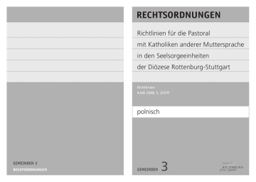3 Richtlinien für die Pastoral mit Katholiken anderer Muttersprache in den Seelsorgeeinheiten der Diözese Rottenburg-Stuttgart Richtlinien KABl 2008, S. 253 ff polnisch Gemeinden 3 Gemeinden Amtliche Übersetzung Rechtsverbindlichkeit besitzt nur der deutsche Text Herausgeber: Bischöfliches Ordinariat der Diözese Rottenburg-Stuttgart Gestaltung des Umschlags: Christoph Lang, Studio für Buch- und MedienDesign, Rottenburg Umschlagdruck: Druckerei Maier, Rottenburg Druck: Bischöfliches Ordinariat Zentrale Verwaltung Hausdruckerei Bestelladresse: Bischöfliches Ordinariat Expedition Postfach 9, 72101 Rottenburg a.N. Fax 07472 169-561 2 Przedmowa Ponad trzy lata temu zostały utworzone pierwsze z 98 parafii dla katolików innych narodowości. Od tego czasu dzięki zaangażowaniu wielu ludzi, którzy w tych wspólnotach, jak i w miejscowych parafiach i dekanatach aktywnie pracowali, dokonano cennej pionierskiej pracy. Należy docenić dobrą współpracę pomiędzy lokalnymi parafiami, jak i nowo powstałymi wspólnotami używającymi języka ojczystego, pomimo odmienności kulturowej, religijnej i pochodzenia i różnorodności form pobożności . Z całego serca chciałbym podziękować tym wszystkim, którzy przyczynili się do do powstania tego nowego konceptu interkulturalnego duszpasterstwa. Z wyczuciem, cierpliwością i wytrwałością próbowali oni przez wiele spotkań i rozmów znaleźć odpowiedź na pastoralne, organizacyjne i finasowe pytania oraz znaleźć rozwiązania zaistniałych trudności. Na podstawie tych doświadczeń można było ocenić i opracować wydane w 2005 r., początkowo w pierwotnej wersji roboczej, Wskazania dla duszpasterstwa katolików innych narodowości w jednostkach duszpasterskich diecezji Rottenburg-Stuttgart. Przedstawione Wskazania zawierają wiążące prawne ramy dla dalszej współpracy pomiędzy miejscowymi parafiami a wspólnotami katolików innych narodowości. Chociaż został uczyniony pierwszy krok, przed nami jest jeszcze wiele etapów. Dotychczasowe doświadczenia zachęcają nas do kontynuowania rozpoczętej drogi. W minionych latach mogłem doświadczyć podczas wielu spotkań, że wielość kultur i narodowości jest drogocennym skarbem, który ubogaca i obdarowuje życie religijne naszej diecezji. Mam nadzieję i życzę nam wszystkim, aby podczas naszych spotkań z ludźmi, jeszcze bardziej była żywotna Dobra Nowina, którą Jezus Chrystus nam powierzył i polecił dalej przekazywać, nam wszystkim, obojętnie jakiego jesteśmy pochodzenia, języka lub narodowości. Dr. Gebhard Fürst Biskup diecezji Rottenburg-Stuttgart 3 Wskazania duszpasterskie dla katolików innych narodowości w jednostkach duszpasterskich diecezji Rottenburg-Stuttgart Podstawowe wskazania 5 1. 7 7 7 8 8 Parafie (wspólnoty) dla katolików obcojęzycznych 1.1 Erekcja (Utworzenie) 1.2 Forma prawna 1.3 Przynależność 1.4 Rada duszpasterska 1.5 Współpraca z innymi wspólnotami w ramach jednostki duszpasterskiej 1.6 Uczestnictwo w gremiach 1.7 Przyporządkowanie do parafii pełniącej funkcję podmiotu prawnego 1.8 Przydział środków finansowych z diecezji 1.9 Używanie pomieszczeń 1.10 Kolekty / Zbiórki 1.11 Współpraca pastoralna 1.12 Mieszkania księdza 10 10 12 12 12 13 2. Księża, diakoni i osoby zakonne w parafiach dla katolików obcojęzycznych 2.1 Zatrudnienie, przeniesienie, zwolnienie z obowiązków 2.2 Podstawy prawne 2.3 Prawa 2.4 Obowiązki 2.5 Jurysdykcja 13 13 14 15 17 18 3. Zawodowi i honorowi współpracownicy/-czki parafii obcojęzycznych 19 4. Zobowiązania diecezji 21 5. Oczekiwania wobec wszystkich odpowiedzialnych we wspólnotach parafialnych w ramach jednostki duszpasterskiej 22 4 8 9 Wskazania duszpasterskie dla katolików innych narodowości w jednostkach duszpasterskich diecezji Rottenburg-Stuttgart Ksiądz Biskup – po wysłuchaniu i przy współudziale diecezjalnej Rady kapłańskiej (zgodnie z § 1 ust. 2 Statutu dla Diecezjalnej Rady Kapłańskiej Diecezji Rottenburg-Stuttgart) oraz po wysłuchaniu Rady diecezjalnej (zgodnie z § 1 Statutu Rady Diecezjalnej Diecezji Rottenburg-Stuttgart) – wydał dekretem nr A 2241 z dnia 17 września 2008 poniższe regulacje, które mają wejść w życie z dniem 1 stycznia 2009. W niniejszych instrukcjach chodzi o szczegółowe zasady w myśl § 2 ust. 2 zd. 2 KGO, w których przez biskupa zostają uregulowane kwestie dotyczące kierownictwa, zadań oraz sposobu pracy parafii (wspólnot) dla katolików obcojęzycznych. Myśli przewodnie „Do nowego Ludu Bożego powołani są wszyscy ludzie. Toteż Lud ten, pozostając ciągle jednym i jedynym, winien się rozszerzać na świat cały i przez wszystkie wieki... To znamię powszechności, które zdobi Lud Boży, jest darem samego Pana... Dzięki tej katolickości, poszczególne części przynoszą innym częściom i całemu Kościołowi właściwe sobie dary, tak iż całość i poszczególne części doznają wzrostu na skutek tej wzajemnej łączności wszystkich oraz dążenia do pełni w jedności” (KK 13). Od przeszło 50 lat naturalną praktyką diecezji Rottenburg-Stuttgart jest stawanie po stronie migrantów oraz świadczenie im pomocy, żeby w naszej diecezji mogli oni odnaleźć ojczyznę. Katolicy obcojęzyczni wnoszą do nowej ojczyzny swoje dziedzictwo, swoją kulturalną i religijną tożsamość, swoje formy pobożności i świadectwa wiary. Jest to wartościowe ubogacenie, które pozwala naszemu Kościołowi lokalnemu doświadczyć podstawowego strukturalnego wymiaru Kościoła katolickiego, a mianowicie tego, iż ogarnia on cały świat i łączy narody. Ustawicznym zadaniem i wyzwaniem naszego Kościoła lokalnego jest łączenie bogactwa kulturowych i religijnych przeżyć w taki sposób, by Kościół katolicki w swojej różnorodności i jedności był rozpoznawalny. 5 Już dziś 11 % katolików diecezji Rottenburg-Stuttgart pochodzi z ponad 160 różnych krajów świata. „Migracja daje poszczególnym Kościo