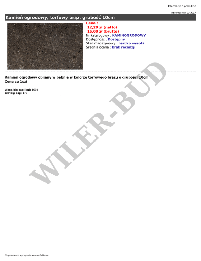 Informacje o produkcie Utworzono 04-03-2017 Kamień ogrodowy, torfowy brąz, grubość 10cm Cena : 12,20 zł (netto) 15,00 zł (brutto) U D Nr katalogowy : KAMINOGRODOWY Dostępność : Dostępny Stan magazynowy : bardzo wysoki Średnia ocena : brak recenzji Kamień ogrodowy obijany w bębnie w kolorze torfowego brązu o grubości 10cm Cena za 1szt W IL ER -B Waga big bag [kg]: 1610 szt/ big bag: 175 Wygenerowano w programie www.oscGold.com