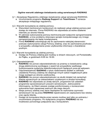 Ogólne warunki zdalnego świadczenia usług serwisowych RADWAG § 1. Akceptacja Regulaminu zdalnego świadczenia usługi serwisowej RADWAG. a. Uruchomienie programu Radwag Support lub TeamViewer 7 oznacza akceptacje niniejszego regulaminu. § 2. Warunki korzystania ze zdalnej pomocy . a. Warunkiem technicznym koniecznym do realizacji usługi zdalnej pomocy jest dostęp do internetu. Firma RADWAG nie odpowiada za wolne działanie internetu po stronie Klienta. b. W zakresie wykonywanej pomocy technicznej jest wyłącznie oprogramowanie RADWAG, a inne problemy dotyczące sprzętu komputerowego czy innego oprogramowania nie będą rozwiązywane. c. Firma RADWAG zobowiązuje się do zachowania należytej staranności podczas wykonywania usługi Pomocy Zdalnej, oraz do zachowania poufności w przypadku udostępniania przez użytkownika informacji o charakterze poufnym. § 3. Warunki korzystania ze zdalnej pomocy . a. Dostęp do Pomocy Zdalnej jest możliwy w dniach roboczych, od Poniedziałku do Piątku, w godzinach 8:00 do 16:00. § 4. Odpowiedzialność . a. RADWAG nie ponosi odpowiedzialności za przerwy w świadczeniu usług drogą elektroniczną wynikające z awarii lub przypadków wadliwego funkcjonowania systemów teleinformatycznych będących poza jej wpływem. b. Odpowiedzialność RADWAG z tytułu realizowania działań w zakresie udzielenia Pomocy Zdalnej nie obejmuje innych szkód majątkowych jakie mogą wystąpić po stronie użytkownika, c. RADWAG nie ponosi odpowiedzialności za skutki działań lub zaniechań Klienta sprzecznych ze wskazówkami uzyskanymi w drodze konsultacji, d. RADWAG nie odpowiada za utratę danych, programów lub ustawień programów spowodowanych pracami serwisowymi. Jednocześnie informujemy, że Klient zawsze zostaje poinformowany o konieczności wykonania kopii zapasowej ważnych dla niego danych, e. Sesje pomocy zdalnej oraz dane niezbędne do wykonania czynności serwisowych nie są przez RADWAG rejestrowane ani zapisywane bez wiedzy oraz zgody klienta, f. Dostęp do komputera klienta przez serwis możliwy jest tylko po pobraniu i uruchomieniu programu. Po wyłączeniu programu RADWAG nie ma możliwości ponownego połączenia się z komputerem.