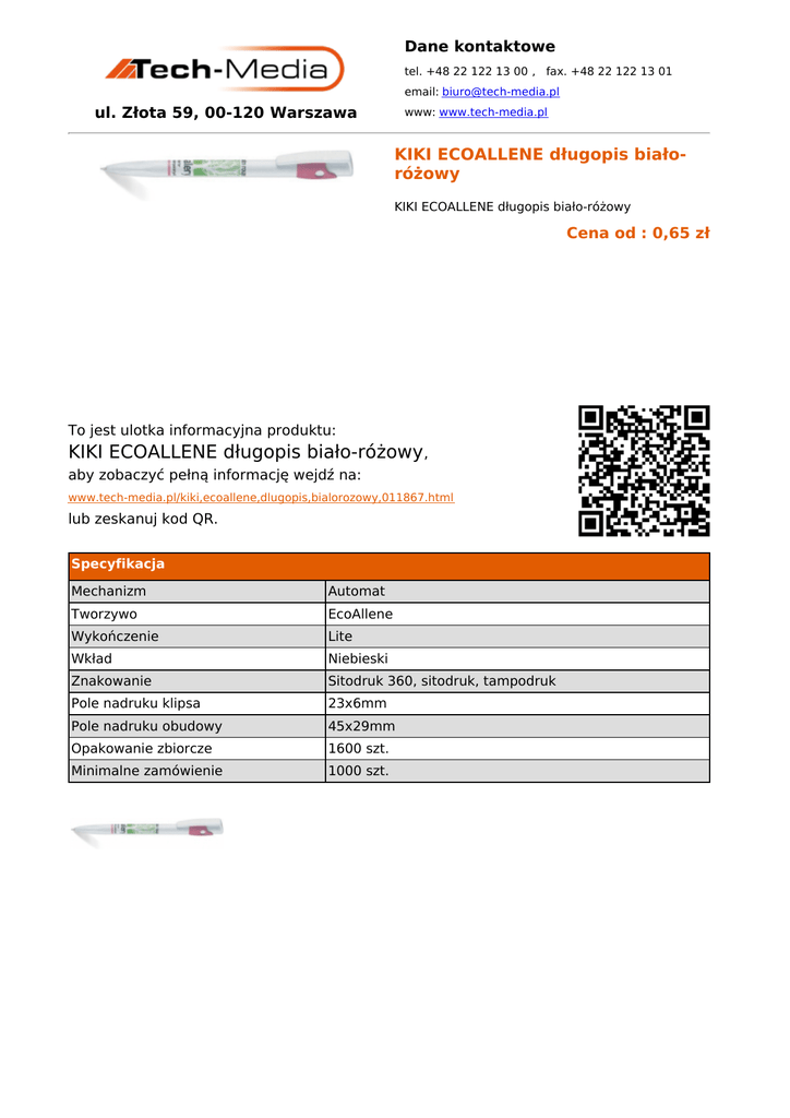 KIKI ECOALLENE długopis biało-różowy - ulotka - Tech