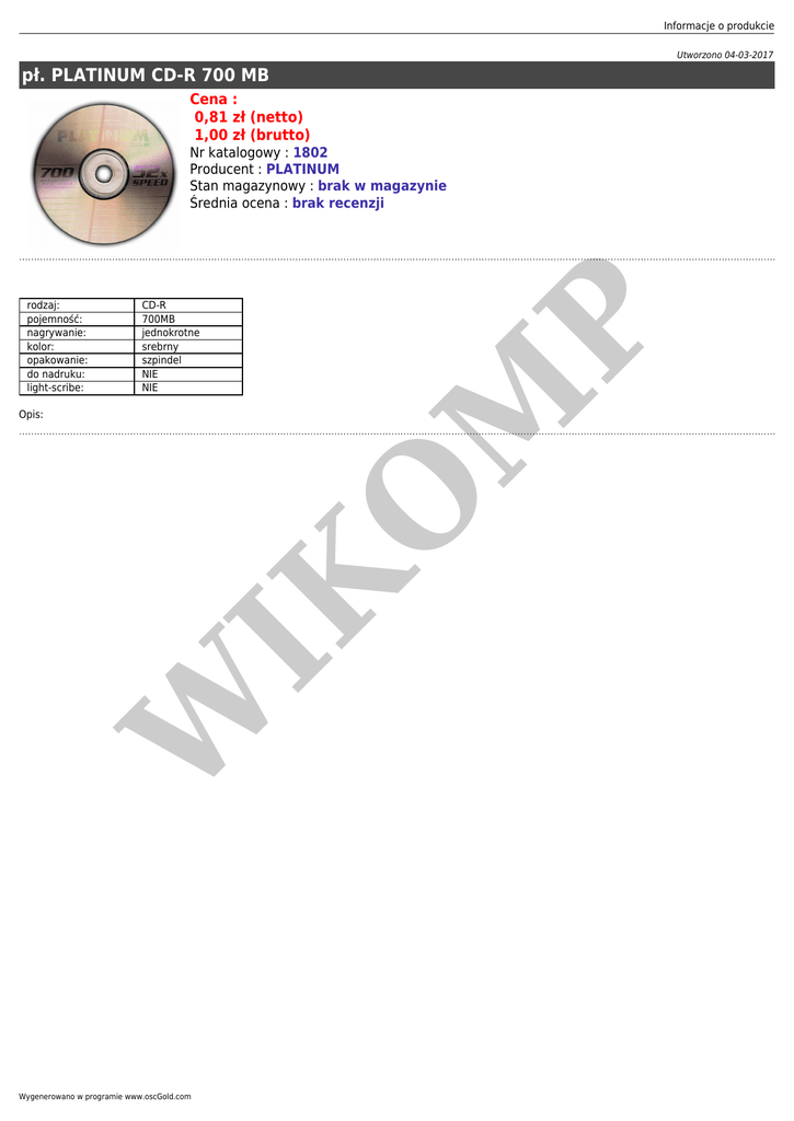 Informacje o produkcie Utworzono 04-03-2017 pł. PLATINUM CD-R 700 MB Cena : 0,81 zł (netto) 1,00 zł (brutto) CD-R 700MB jednokrotne srebrny szpindel NIE NIE W IK Opis: O M rodzaj: pojemność: nagrywanie: kolor: opakowanie: do nadruku: light-scribe: P Nr katalogowy : 1802 Producent : PLATINUM Stan magazynowy : brak w magazynie Średnia ocena : brak recenzji Wygenerowano w programie www.oscGold.com