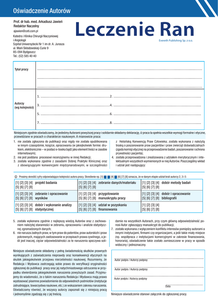 Oświadczenie Autorów Prof. dr hab. med. Arkadiusz Jawień Redaktor Naczelny [email protected] Katedra i Klinika Chirurgii Naczyniowej i Angiologii Szpital Uniwersytecki Nr 1 im dr. A. Jurasza ul. Marii Skłodowskiej-Curie 9 85-094 Bydgoszcz Tel.: (52) 585 40 40 Tytuł pracy Leczenie Ran Evereth Publishing Sp. z o.o. ................................................................................................................................................................................... ................................................................................................................................................................................... ................................................................................................................................................................................... 1. ...........................................................................2. ............................................................................................... Autorzy (wg kolejności) 3. ...........................................................................4. ............................................................................................... 5. ...........................................................................6. ............................................................................................... 7. ...........................................................................8. ............................................................................................... Niniejszym zgodnie oświadczamy, że jesteśmy Autorami powyższej pracy i solidarnie składamy deklarację, iż praca ta spełnia wszelkie wymogi formalne i etyczne, przewidziane w pracach o charakterze naukowym. A mianowicie praca: 1. nie została zgłoszona do publikacji oraz nigdy nie została opublikowana z Helsińską Konwencją Praw Człowieka; została wykonana z należytą w innym czasopiśmie, książce, opracowaniu (w jakiejkolwiek formie: drutroską o poszanowanie praw pacjentów i praw zwierząt doświadczalnych kiem, elektronicznie – w postaci e-booka bądź jako element treści w zasobie (zgoda komisji etycznej na przeprowadzenie badań, poszanowanie i ochrona internetowym); prywatności pacjenta); 2. nie jest poddana procesowi recenzyjnemu w innej Redakcji; 4. została przeprowadzona i zrealizowana z udziałem merytorycznym i inte3. została wykonana zgodnie z zasadami Dobrej Praktyki Klinicznej oraz lektualnym wszystkich wymienionych w niej Autorów. Poszczególny wkład z obowiązującymi konwencjami międzynarodowymi, w szczególności i udział jest następujący: i Prosimy skreślić cyfry odpowiadające kolejności autora pracy. Skreślenie np. [1] [2] [3] [4] [5] [6] [7] [8] oznacza, że w danym etapie udział brali autorzy 2, 3 i 5 [1] [2] [3] [4] projekt badania [5] [6] [7] [8] [1] [2] [3] [4] zebranie danych/materiału [5] [6] [7] [8] [1] [2] [3] [4] dobór metody badań [5] [6] [7] [8] [1] [2] [3] [4] zebranie i opracowanie [5] [6] [7] [8] wyników [1] [2] [3] [4] przygotowanie [5] [6] [7] [8] manuskryptu pracy [1] [2] [3] [4] dobór i opracowanie [5] [6] [7] [8] bibliografii [1] [2] [3] [4] dobór i wykonanie analizy [5] [6] [7] [8] statystycznej [1] [2] [3] [4] udział w pozyskaniu [5] [6] [7] [8] finansowania [1] [2] [3] [4] [5] [6] [7] [8] 5. została wykonana zgodnie z najlepszą wiedzą Autorów oraz z zachowaniem należytej staranności w zebraniu, opracowaniu i analizie statystycznej zgromadzonych danych; 6. nie narusza żadnych praw, w tym praw do patentów, praw autorskich i praw pokrewnych, mających zastosowanie w przepisach prawa cywilnego, a jeśli jest inaczej, ciężar odpowiedzialności za te naruszenia spoczywa soliNiniejsze oświadczenie składamy z pełną świadomością skutków prawnych wynikających z zaświadczenia nieprawdy oraz konsekwencji etycznych na skutek jakiegokolwiek przejawu nierzetelności naukowej. Rozumiemy, że Redakcja i Wydawca zastrzegają sobie prawo do weryfikacji oryginalności zgłoszonej do publikacji pracy oraz jej natychmiastowego odrzucenia w przypadku stwierdzenia jakiegokolwiek naruszenia powyższych zasad. Przyjmujemy do wiadomości, że o takim naruszeniu Redakcja i Wydawca mają prawo wystosować pisemne powiadomienie do odpowiednich podmiotów (instytucje zatrudniające, towarzystwa naukowe, etc.) ze wskazaniem zakresu naruszenia. Oświadczamy również, że wszyscy autorzy zapoznali się z niniejszą pracą i jednomyślnie zgadzają się z jej treścią. darnie na wszystkich Autorach, przy czym główną odpowiedzialność ponosi Autor zgłaszający manuskrypt do publikacji; 7. została wykonana z wyłączeniem konfliktu interesów pomiędzy autorami a innymi instytucjami, firmami czy organizacjami, a jeśli takie miały miejsce (np. współpraca z instytucjami komercyjnymi w zakresie finansowania, honoraria), oświadczenie takie zostało zamieszczone w pracy w sposób widoczny i jednoznaczny. ................................................................................................. Autor podpis / Autorzy podpisy ................................................................................................. Autor podpis / Autorzy podpisy .................................................................................................. Autor podpis / Autorzy podpisy ........................................ Data Niniejsze oświadczenie stanowi załącznik do zgłoszonej pracy.