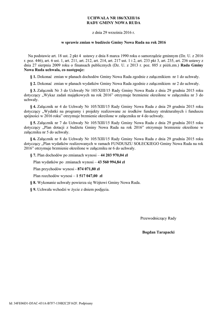 UCHWAŁA NR 186/XXIII/16 RADY GMINY NOWA RUDA z dnia 29 września 2016 r. w sprawie zmian w budżecie Gminy Nowa Ruda na rok 2016 Na podstawie art. 18 ust. 2 pkt 4 ustawy z dnia 8 marca 1990 roku o samorządzie gminnym (Dz. U. z 2016 r. poz. 446), art. 6 ust. 1, art. 211, art. 212, art. 214, art. 217 ust. 1 i 2, art. 233 pkt 3, art. 235, art. 236 ustawy z dnia 27 sierpnia 2009 roku o finansach publicznych (Dz. U. z 2013 r. poz. 885 z późń.zm.) Rada Gminy Nowa Ruda uchwala, co następuje: § 1. Dokonać zmian w planach dochodów Gminy Nowa Ruda zgodnie z załącznikiem nr 1 do uchwały. § 2. Dokonać zmian w planach wydatków Gminy Nowa Ruda zgodnie z załącznikiem nr 2 do uchwały. § 3. Załącznik Nr 3 do Uchwały Nr 105/XIII/15 Rady Gminy Nowa Ruda z dnia 29 grudnia 2015 roku dotyczący „Wykaz zadań majątkowych na rok 2016” otrzymuje brzmienie określone w załączniku nr 3 do uchwały. § 4. Załącznik nr 4 do Uchwały Nr 105/XIII/15 Rady Gminy Nowa Ruda z dnia 29 grudnia 2015 roku dotyczący „Wydatki na programy i projekty realizowane ze środków funduszy strukturalnych i funduszu spójności w 2016 roku” otrzymuje brzmienie określone w załączniku nr 4 do uchwały. § 5. Załącznik nr 7 do Uchwały Nr 105/XIII/15 Rady Gminy Nowa Ruda z dnia 29 grudnia 2015 roku dotyczący „Plan dotacji z budżetu Gminy Nowa Ruda na rok 2016” otrzymuje brzmienie określone w załączniku nr 5 do uchwały. § 6. Załącznik nr 8 do Uchwały Nr 105/XIII/15 Rady Gminy Nowa Ruda z dnia 29 grudnia 2015 roku dotyczący „Plan wydatków realizowanych w ramach FUNDUSZU SOŁECKIEGO Gminy Nowa Ruda na rok 2016” otrzymuje brzmienie określone w załączniku nr 6 do uchwały. § 7. Plan dochodów po zmianach wynosi – 44 203 970,04 zł Plan wydatków po zmianach wynosi – 43 560 994,84 zł Plan przychodów wynosi - 874 071,80 zł Plan rozchodów wynosi – 1 517 047,00 zł § 8. Wykonanie uchwały powierza się Wójtowi Gminy Nowa Ruda. § 9. Uchwała wchodzi w życie z dniem podjęcia. Przewodniczący Rady Bogdan Tarapacki Id: 34FE06D1-D5AC-431A-B7F7-138B2C2F162F. Podpisany Załącznik nr 1 do Uchwały nr 186/XXIII/16 Rady Gminy Nowa Ruda z dnia 29 września 2016 roku Zmiany planu dochodów Gminy Nowa Ruda na rok 2016 Dział Rozdział Paragraf 010 Treść Przed zmianą Rolnictwo i łowiectwo 01010 Infrastruktura wodociągowa i sanitacyjna wsi 0970 01095 Wpływy z różnych dochodów 600 60016 Po zmianie 1 249 529,00 551,94 1 250 080,94 15 261,37 443,22 15 704,59 261,37 443,22 704,59 680 931,63 108,72 681 040,35 346,00 108,72 454,72 Transport i łączność 740 559,00 - 95 400,34 645 158,66 Drogi publiczne gminne 178 360,00 - 177 136,34 1 223,66 Pozostała działalność 0920 Zmiana Wpływy z pozostałych odsetek 0970 Wpływy z różnych dochodów 0,00 1 223,66 1 223,66 6257 Dotacje celowe w ramach programów finansowych z udziałem środków europejskich oraz środków, o których mowa w art. 5 ust. 3 pkt 5 lit. a i b ustawy, lub płatności w ramach budżetu środków europejskich, realizowanych przez jednostki samorządu terytorialnego 178 360,00 - 178 360,00 0,00 Usuwanie skutków klęsk żywiołowych 562 199,00 81 736,00 643 935,00 Dotacje celowe otrzymane z budżetu państwa na realizację inwestycji i zakupów inwestycyjnych własnych gmin (związków gmin, związków powiatowo-gminnych) 562 199,00 81 736,00 643 935,00 Turystyka 68 610,11 - 10 000,00 58 610,11 Pozostała działalność 68 610,11 - 10 000,00 58 610,11 Wpływy z najmu i dzierżawy składników majątkowych Skarbu Państwa, jednostek samorządu terytorialnego lub innych jednostek zaliczanych do sektora finansów publicznych oraz innych umów o podobnym charakterze 10 000,00 - 10 000,00 0,00 Gospodarka mieszkaniowa 3 484 044,22 850,00 3 484 894,22 Gospodarka gruntami i nieruchomościami 3 484 000,00 850,00 3 484 850,00 Wpływy z pozostałych odsetek 25 000,00 850,00 25 850,00 Działalność usługowa 23 581,09 1 500,00 25 081,09 Cmentarze 23 581,09 1 500,00 25 081,09 914,13 1 500,00 2 414,13 156 825,25 402,10 157 227,35 65 151,85 3,10 65 154,95 10,85 3,10 13,95 60078 6330 630 63095 0750 700 70005 0920 710 71035 0970 750 Wpływy z różnych dochodów Administracja publiczna 75011 Urzędy wojewódzkie 2360 Dochody jednostek samorządu terytorialnego związane z realizacją zadań z zakresu administracji rządowej oraz innych zadań zleconych ustawami Strona 1 z 3 Id: 34FE06D1-D5AC-431A-B7F7-138B2C2F162F. Podpisany Dział Rozdział Paragraf 75023 Treść Przed zmianą Urzędy gmin (miast i miast na prawach powiatu) Zmiana Po zmianie 26 145,76 399,00 26 544,76 536,00 399,00 935,00 11 637 863,04 - 55 149,19 11 582 713,85 1 943 774,00 - 7 366,83 1 936 407,17 109 128,00 15 600,00 124 728,00 25 000,00 150,00 3 000,00 - 24 000,00 12,40 1 020,77 1 000,00 162,40 4 020,77 2 358 400,00 24 000,00 2 382 400,00 Wpływy z podatku od czynności cywilnoprawnych 147 131,00 24 000,00 171 131,00 Wpływy z innych opłat stanowiących dochody jednostek samorządu terytorialnego na podstawie ustaw 892 682,04 - 71 782,36 820 899,68 0460 Wpływy z opłaty eksploatacyjnej 700 000,00 - 71 923,41 628 076,59 0490 Wpływy z innych lokalnych opłat pobieranych przez jednostki samorządu terytorialnego na podstawie odrębnych ustaw 3 301,00 141,05 3 442,05 0920 Wpływy z pozostałych odsetek Dochody od osób prawnych, od osób fizycznych i od innych jednostek nieposiadających osobowości prawnej oraz wydatki związane z ich poborem Wpływy z podatku rolnego, podatku leśnego, podatku od czynności cywilnoprawnych, podatków i opłat lokalnych od osób prawnych i innych jednostek organizacyjnych 756 75615 0330 Wpływy z podatku leśnego 0500 0690 0910 Wpływy z podatku od czynności cywilnoprawnych Wpływy z różnych opłat Wpływy z odsetek od nieterminowych wpłat z tytułu podatków i opłat Wpływy z podatku rolnego, podatku leśnego, podatku od spadków i darowizn, podatku od czynności cywilno-prawnych oraz podatków i opłat lokalnych od 