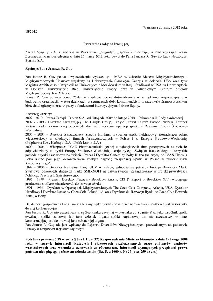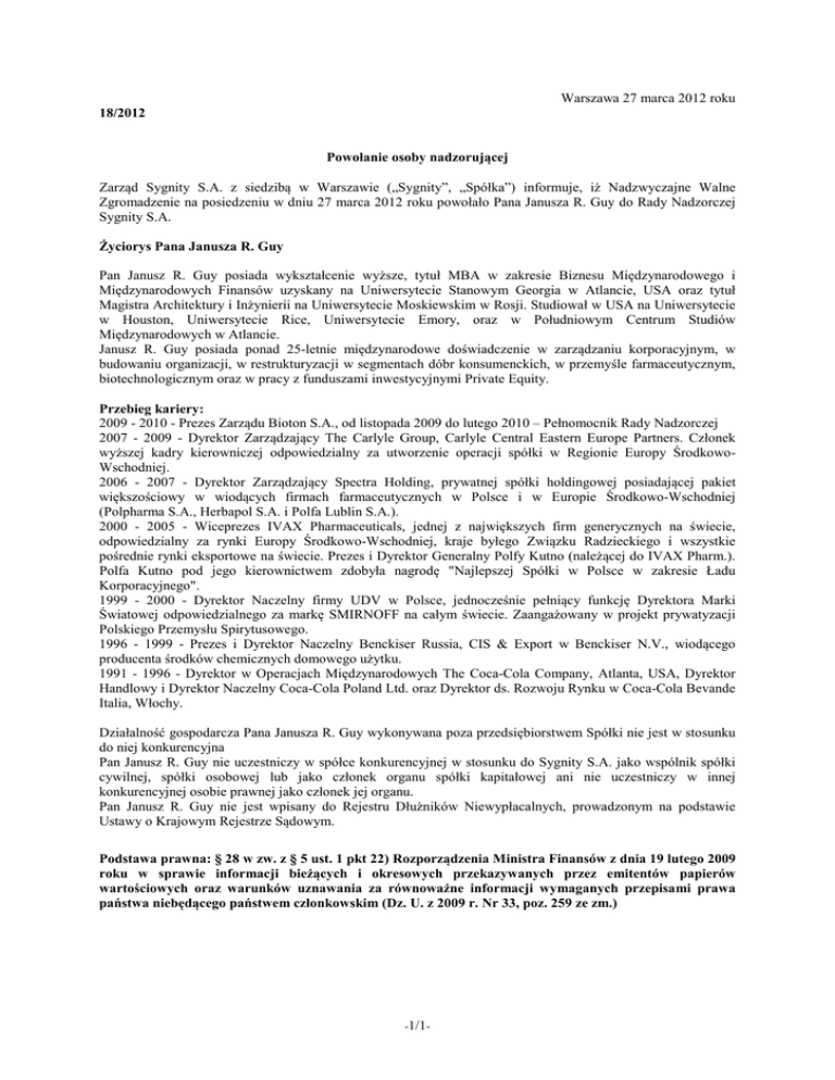 Warszawa 27 marca 2012 roku 18/2012 Powołanie osoby nadzorującej Zarząd Sygnity S.A. z siedzibą w Warszawie („Sygnity”, „Spółka”) informuje, iż Nadzwyczajne Walne Zgromadzenie na posiedzeniu w dniu 27 marca 2012 roku powołało Pana Janusza R. Guy do Rady Nadzorczej Sygnity S.A. Życiorys Pana Janusza R. Guy Pan Janusz R. Guy posiada wykształcenie wyższe, tytuł MBA w zakresie Biznesu Międzynarodowego i Międzynarodowych Finansów uzyskany na Uniwersytecie Stanowym Georgia w Atlancie, USA oraz tytuł Magistra Architektury i Inżynierii na Uniwersytecie Moskiewskim w Rosji. Studiował w USA na Uniwersytecie w Houston, Uniwersytecie Rice, Uniwersytecie Emory, oraz w Południowym Centrum Studiów Międzynarodowych w Atlancie. Janusz R. Guy posiada ponad 25-letnie międzynarodowe doświadczenie w zarządzaniu korporacyjnym, w budowaniu organizacji, w restrukturyzacji w segmentach dóbr konsumenckich, w przemyśle farmaceutycznym, biotechnologicznym oraz w pracy z funduszami inwestycyjnymi Private Equity. Przebieg kariery: 2009 - 2010 - Prezes Zarządu Bioton S.A., od listopada 2009 do lutego 2010 – Pełnomocnik Rady Nadzorczej 2007 - 2009 - Dyrektor Zarządzający The Carlyle Group, Carlyle Central Eastern Europe Partners. Członek wyższej kadry kierowniczej odpowiedzialny za utworzenie operacji spółki w Regionie Europy ŚrodkowoWschodniej. 2006 - 2007 - Dyrektor Zarządzający Spectra Holding, prywatnej spółki holdingowej posiadającej pakiet większościowy w wiodących firmach farmaceutycznych w Polsce i w Europie Środkowo-Wschodniej (Polpharma S.A., Herbapol S.A. i Polfa Lublin S.A.). 2000 - 2005 - Wiceprezes IVAX Pharmaceuticals, jednej z największych firm generycznych na świecie, odpowiedzialny za rynki Europy Środkowo-Wschodniej, kraje byłego Związku Radzieckiego i wszystkie pośrednie rynki eksportowe na świecie. Prezes i Dyrektor Generalny Polfy Kutno (należącej do IVAX Pharm.). Polfa Kutno pod jego kierownictwem zdobyła nagrodę "Najlepszej Spółki w Polsce w zakresie Ładu Korporacyjnego". 1999 - 2000 - Dyrektor Naczelny firmy UDV w Polsce, jednocześnie pełniący funkcję Dyrektora Marki Światowej odpowiedzialnego za markę SMIRNOFF na całym świecie. Zaangażowany w projekt prywatyzacji Polskiego Przemysłu Spirytusowego. 1996 - 1999 - Prezes i Dyrektor Naczelny Benckiser Russia, CIS & Export w Benckiser N.V., wiodącego producenta środków chemicznych domowego użytku. 1991 - 1996 - Dyrektor w Operacjach Międzynarodowych The Coca-Cola Company, Atlanta, USA, Dyrektor Handlowy i Dyrektor Naczelny Coca-Cola Poland Ltd. oraz Dyrektor ds. Rozwoju Rynku w Coca-Cola Bevande Italia, Włochy. Działalność gospodarcza Pana Janusza R. Guy wykonywana poza przedsiębiorstwem Spółki nie jest w stosunku do niej konkurencyjna Pan Janusz R. Guy nie uczestniczy w spółce konkurencyjnej w stosunku do Sygnity S.A. jako wspólnik spółki cywilnej, spółki osobowej lub jako członek organu spółki kapitałowej ani nie uczestniczy w innej konkurencyjnej osobie prawnej jako członek jej organu. Pan Janusz R. Guy nie jest wpisany do Rejestru Dłużników Niewypłacalnych, prowadzonym na podstawie Ustawy o Krajowym Rejestrze Sądowym. Podstawa prawna: § 28 w zw. z § 5 ust. 1 pkt 22) Rozporządzenia Ministra Finansów z dnia 19 lutego 2009 roku w sprawie informacji bieżących i okresowych przekazywanych przez emitentów papierów wartościowych oraz warunków uznawania za równoważne informacji wymaganych przepisami prawa państwa niebędącego państwem członkowskim (Dz. U. z 2009 r. Nr 33, poz. 259 ze zm.) -1/1-