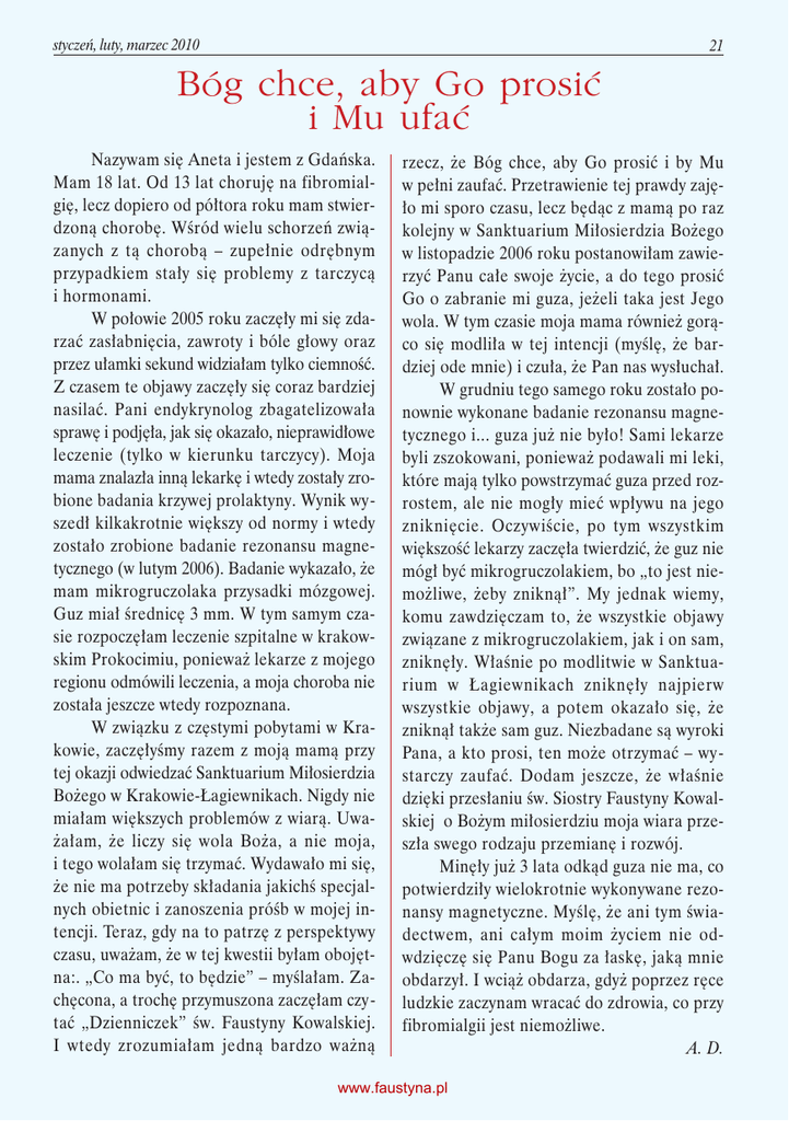 styczeń, luty, marzec 2010 21 Bóg chce, aby Go prosić i Mu ufać Nazywam się Aneta i jestem z Gdańska. Mam 18 lat. Od 13 lat choruję na fibromialgię, lecz dopiero od półtora roku mam stwierdzoną chorobę. Wśród wielu schorzeń związanych z tą chorobą – zupełnie odrębnym przypadkiem stały się problemy z tarczycą i hormonami. W połowie 2005 roku zaczęły mi się zdarzać zasłabnięcia, zawroty i bóle głowy oraz przez ułamki sekund widziałam tylko ciemność. Z czasem te objawy zaczęły się coraz bardziej nasilać. Pani endykrynolog zbagatelizowała sprawę i podjęła, jak się okazało, nieprawidłowe leczenie (tylko w kierunku tarczycy). Moja mama znalazła inną lekarkę i wtedy zostały zrobione badania krzywej prolaktyny. Wynik wyszedł kilkakrotnie większy od normy i wtedy zostało zrobione badanie rezonansu magnetycznego (w lutym 2006). Badanie wykazało, że mam mikrogruczolaka przysadki mózgowej. Guz miał średnicę 3 mm. W tym samym czasie rozpoczęłam leczenie szpitalne w krakowskim Prokocimiu, ponieważ lekarze z mojego regionu odmówili leczenia, a moja choroba nie została jeszcze wtedy rozpoznana. W związku z częstymi pobytami w Krakowie, zaczęłyśmy razem z moją mamą przy tej okazji odwiedzać Sanktuarium Miłosierdzia Bożego w Krakowie-Łagiewnikach. Nigdy nie miałam większych problemów z wiarą. Uważałam, że liczy się wola Boża, a nie moja, i tego wolałam się trzymać. Wydawało mi się, że nie ma potrzeby składania jakichś specjalnych obietnic i zanoszenia próśb w mojej intencji. Teraz, gdy na to patrzę z perspektywy czasu, uważam, że w tej kwestii byłam obojętna:. „Co ma być, to będzie” – myślałam. Zachęcona, a trochę przymuszona zaczęłam czytać „Dzienniczek” św. Faustyny Kowalskiej. I wtedy zrozumiałam jedną bardzo ważną rzecz, że Bóg chce, aby Go prosić i by Mu w pełni zaufać. Przetrawienie tej prawdy zajęło mi sporo czasu, lecz będąc z mamą po raz kolejny w Sanktuarium Miłosierdzia Bożego w listopadzie 2006 roku postanowiłam zawierzyć Panu całe swoje życie, a do tego prosić Go o zabranie mi guza, jeżeli taka jest Jego wola. W tym czasie moja mama również gorąco się modliła w tej intencji (myślę, że bardziej ode mnie) i czuła, że Pan nas wysłuchał. W grudniu tego samego roku zostało ponownie wykonane badanie rezonansu magnetycznego i... guza już nie było! Sami lekarze byli zszokowani, ponieważ podawali mi leki, które mają tylko powstrzymać guza przed rozrostem, ale nie mogły mieć wpływu na jego zniknięcie. Oczywiście, po tym wszystkim większość lekarzy zaczęła twierdzić, że guz nie mógł być mikrogruczolakiem, bo „to jest niemożliwe, żeby zniknął”. My jednak wiemy, komu zawdzięczam to, że wszystkie objawy związane z mikrogruczolakiem, jak i on sam, zniknęły. Właśnie po modlitwie w Sanktuarium w Łagiewnikach zniknęły najpierw wszystkie objawy, a potem okazało się, że zniknął także sam guz. Niezbadane są wyroki Pana, a kto prosi, ten może otrzymać – wystarczy zaufać. Dodam jeszcze, że właśnie dzięki przesłaniu św. Siostry Faustyny Kowalskiej o Bożym miłosierdziu moja wiara przeszła swego rodzaju przemianę i rozwój. Minęły już 3 lata odkąd guza nie ma, co potwierdziły wielokrotnie wykonywane rezonansy magnetyczne. Myślę, że ani tym świadectwem, ani całym moim życiem nie odwdzięczę się Panu Bogu za łaskę, jaką mnie obdarzył. I wciąż obdarza, gdyż poprzez ręce ludzkie zaczynam wracać do zdrowia, co przy fibromialgii jest niemożliwe. A. D. www.faustyna.pl