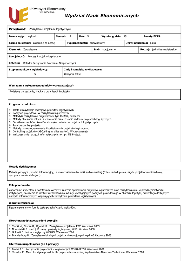 Wydział Nauk Ekonomicznych Przedmiot: Forma zajęć: Zarządzanie projektami logistycznymi wykład Semestr: 9 Forma zaliczenia: zaliczenie na ocenę Rok: 5 Typ przedmiotu: obowiązkowy Kierunek: Zarządzanie Specjalność: Katedra: Wymiar godzin: 15 Tryb: stacjonarne Punkty ECTS: Język nauczania: polski Rodzaj: jednolite magisterskie Procesy i projekty logistyczne Katedra Zarządzania Procesami Gospodarczymi Stopień naukowy wykładowcy: dr Imię i nazwisko wykładowcy: Grzegorz Jokiel Wymagania wstępne (przedmioty wprowadzające): Podstawy zarządzania, Nauka o organizacji, Logistyka Program przedmiotu: 1. 2. 3. 4. 5. 6. 7. 8. 9. Istota i klasyfikacja rodzajowa projektów logistycznych. Podejście projektowe w zarządzaniu logistycznym. Metodyki zarządzania i projektami (w tym PMBOK, Prince 2) Metody określania zakresu i szacowania czasu trwania zadań w projektach logistycznych. Określanie zasobów i kosztów ich wykorzystania w projektach logistycznych Rola kierownika projektu. Metody harmonogramowania i budŜetowania projektów logistycznych. Controlling projektów (ABCosting, Analiza Wartości Wypracowanej) Wykorzystanie narzędzi informatycznych jak np.: MS Project, Metody dydaktyczne: Metoda podająca , wykład informacyjny, z wykorzystaniem techniki audiowizualnej (folie - rzutnik pisma, slajdy -projektor multimedialny, oprogramowanie MsProject) Cele przedmiotu: Zapoznanie studentów z podstawami wiedzy w zakresie opracowania projektów logistycznych oraz zarządzania nimi w przedsiębiorstwach i instytucjach, nauczenie studentów rozpoznawania sytuacji wymagających podejścia projektowego w obszarze logistyki, prezentacja dostępnych narzędzi informatycznych wspierających zarządzanie projektami logistycznymi, Warunki zaliczenia: Egzamin pisemny w formie testu po zakończeniu wykładów. Literatura podstawowa (do 4 pozycji): 1. 2. 3. 4. Trocki M., Grucza B., Ogonek K.: Zarządzanie projektami PWE Warszawa 2003 Nowosielski S., (red.), Procesy i projekty logistyczne, WUE Wrocław 2008 Goldratt E. Łańcuch krytyczny WERBEL Warszawa 2000 Brandenburg H.: Zarządzanie lokalnymi projektami rozwojowymi Wyd. AE Katowice 2003 Literatura uzupełniająca (do 4 pozycji): 1. Frame J.D.: Zarządzanie projektami w organizacjach WIGG-PRESS Warszawa 2001 2. Yourdon E.: Marsz ku klęsce poradnik dla projektanta systemów, Wydawnictwo Naukowo Techniczne, Warszawa 2000