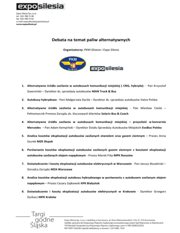 Debata na temat paliw alternatywnych Organizatorzy: PKM Gliwice i Expo Silesia 1. Alternatywne źródła zasilania w autobusach komunikacji miejskiej ( CNG, hybryda) - Pan Krzysztof Gawroński – Dyrektor ds. sprzedaży autobusów MAN Truck & Bus 2. Autobusy hybrydowe - Pani Małgorzata Dyrda – Dyrektor ds. sprzedaży autobusów Volvo Polska 3. Alternatywne źródła zasilania w autobusach komunikacji miejskiej - Pan Wiesław Cieśla – Pełnomocnik Prezesa Zarządu ds. kluczowych klientów Solaris Bus & Coach 4. Alternatywne źródła zasilania w autobusach komunikacji miejskiej – przyszłość w koncernie Mercedes – Pan Adam Kempiński – Dyrektor Działu Sprzedaży Autobusów Miejskich EvoBus Polska 5. Analiza kosztów eksploatacji autobusów zasilanych etanolem oraz gazem ziemnym – Prezes Anna Szurek MZK Słupsk 6. Porównanie kosztów eksploatacji autobusów zasilanych gazem ziemnym z kosztami eksploatacji autobusów zasilanych olejem napędowym - Prezes Marek Filip MPK Rzeszów 7. Doświadczenie i koszty eksploatacji autobusów elektrycznych w Warszawie - Pan Janusz Bosakirski – Doradca Zarządu MZA Warszawa 8. Analiza kosztów eksploatacji autobusu hybrydowego w porównaniu z autobusem zasilanym olejem napędowym – Prezes Cezary Zajkowski KPK Białystok 9. Doświadczenie i koszty eksploatacji autobusów elektrycznych w Krakowie - Dyrektor Grzegorz Dyrkacz MPK Kraków