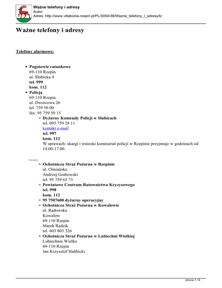 Ważne telefony i adresy Autor: Adres: http://www.villabonia.rzepin.pl/PL/3054/38/Wazne_telefony_i_adresy/k/ Ważne telefony i adresy Telefony alarmowe: Pogotowie ratunkowe 69-110 Rzepin ul. Słubicka 4 tel. 999 kom. 112 Policja 69-110 Rzepin ul. Dworcowa 26 tel. 759 50 00 fax: 95 759 50 15 Dyżurny Komendy Policji w Słubicach tel. 095 759 28 11 kontakt e-mail tel. 997 kom. 112 W sprawach: skargi i wnioski komisariat policji w Rzepinie przyjmuje w godzinach od 14.00-17.00. Straż pożarna Ochotnicza Straż Pożarna w Rzepinie ul. Ośniańska Andrzej Grabowski tel. 95 759 63 73 Powiatowe Centrum Ratownictwa Kryzysowego tel. 998 kom. 112 95 7507600 dyżurny operacyjny Ochotnicza Straż Pożarna w Kowalowie ul. Radowska Kowalów 69-110 Rzepin Marek Radzik tel. 603 803 326 Ochotnicza Straż Pożarna w Lubiechni Wielkiej Lubiechnia Wielka 69-110 Rzepin Jan Krzysztof Hańbicki strona 1 / 6 Ważne telefony i adresy Autor: Adres: http://www.villabonia.rzepin.pl/PL/3054/38/Wazne_telefony_i_adresy/k/ Pogotowie Gazowe EWE: tel. 800 111 992 Banki: Bank Spółdzielczy 69-110 Rzepin ul. Dworcowa 9 - Zarząd – Centrala 95 759 63 45 - Główny Księgowy 95 759 74 48 - Sala Obsługi Klientów 95 759 63 46 Bank PKO S.A. Oddział Sulęcin 69-110 Rzepin ul. Bolesława Chrobrego 19 tel. 95 759 61 41 faks 95 759 61 39 Poczta: Kod Pocztowy: 69-110 Rzepin ul. Wojska Polskiego 25 tel. 095 759 64 52 Parafie: Parafia Rzymsko – Katolicka p.w. Św. Katarzyny 69-110 Rzepin ul. Bolesława Chrobrego tel. 95 759 77 73 Parafia Rzymsko – Katolicka p. w. Najświętszego Serca Pana Jezusa 69-110 Rzepin Plac Kościelny 4 tel. 95 759 62 25 strona 2 / 6 Ważne telefony i adresy Autor: Adres: http://www.villabonia.rzepin.pl/PL/3054/38/Wazne_telefony_i_adresy/k/ tel. 95 759 82 50 tel. 95 759 67 59 Filie Gajec Lubiechnia Wielka Lubiechnia Mała Starościn Drzeńsko Przedsiębiorstwo Wodno – Kanalizacyjne "EKO": 69-110 Rzepin ul. Mickiewicza 79 kontakt e-mail NIP: 598-15-30-880, regon: 211247929 tel/fax (0-95) 7597-672 Osoba związana z jednostką: Bogumiła Urbanek - Dyrektor tel.: 095/7597672 fax: 095/7597672 kontakt e-mail Zakład Administracji Mieniem Komunalnym: H. Sienkiewicza 20 69-110 Rzepin telefon: 95/7596264 fax: 95/7596579 kontakt e-mail NIP: 598-14-13-542, regon: 210437065 Ośrodek Pomocy Społecznej: 69-110 Rzepin Plac Ratuszowy 1 tel. 95 759 65 90 tel. 95 759 64 90 Kierownik Sławomir Karatysz strona 3 / 6 Ważne telefony i adresy Autor: Adres: http://www.villabonia.rzepin.pl/PL/3054/38/Wazne_telefony_i_adresy/k/ Informacja Autobusowa: Gorzów Wlkp., tel. 95 93 16 Słubice, tel. 95 93 16 Sulęcin, tel. 95 755 23 53 Pomoc Drogowa: Słubice ul. Transportowa 2 tel. 095 758 33 45 Pogotowie Energetyczne: Cybinka, "Enea" Grupa energetyczna S.A., tel. 95 391 11 01 Torzym, "Enea" Grupa energetyczna S.A., Pogotowie energetyczne, tel. 95 341 31 72 Powiatowe Centrum Pomocy Rodzinie w Słubicach: 95 758 21 40 kontakt e-mail www.centrumslubice.pl Telefony Zaufania: strona 4 / 6 Ważne telefony i adresy Autor: Adres: http://www.villabonia.rzepin.pl/PL/3054/38/Wazne_telefony_i_adresy/k/ "Itaka" Fundacja Pomocy Ludziom Dotkniętym problemem zaginięcia, www.zaginieni.pl, tel. 22 654 70 70 "Niebieska Linia" Ogólnopolskie Pogotowie dla Ofiar Przemocy w Rodzinie, dla Osób Krzywdzonych przez Najbliższych, Centrum Informacyjne, www.niebieskalinia.pl, kontakt e-mail, tel. 801 120 002 Ogólnopolski Telefon Zaufania AIDS. "Bądź z Nami" Stowarzyszenie Wolontariuszy Wobec AIDS, tel. 22 622 50 01 Ogólnopolski Telefon Zaufania dla Osób z Problemem Narkotykowym, tel. 801 199 990 Policyjny Telefon Zaufania Ogólnoproblemowy. Komenda Stołeczna Policji, tel. 800 120 226 Rodzinny Telefon Zaufania "Ruch Pomocy Rodzinie" Fundacja, tel. 22 621 03 67 Telefon Wsparcia dla Matek Fundacji "Rodzić po Ludzku", tel. 022 635 10 11 Telefon Zaufania – Adopcyjny. Towarzystwo Przyjaciół Dzieci, tel. 22 827 50 23 Telefon Zaufania dla Kobiet, Fundacja na Rzecz Kobiet i Planowania Rodziny, tel. 22 635 93 92 Telefon Zaufania dla Kobiet w Ciąży i Matek Małych Dzieci – Biuro Informacji i Interwencji Fundacji "Rodzić po Ludzku", tel. 22 635 30 92 Telefon Zaufania dla Osób Uzależnionych od Choroby Alkoholowej i ich Rodzin Fundacji "Klucz", tel. 22 628 75 26 Telefon Zaufania dla Osób Z Problemem Alkoholowym, Instytut Psychiatrii i Neurologii, tel. 22 842 26 00 Telefon Zaufania dla Osób z Problemem Choroby Alkoholowej i ich Rodzin. "Klucz" Fundacja Trzeźwościowa, tel. 22 869 02 86 Telefon Zaufania dla osób z Problemem Narkotykowym i Pomoc Rodzinie. "Powrót z U" Towarzystwo Rodzin i Przyjaciół Dzieci Uzależnionych, tel. 801 109 696 Telefon Zaufania "La Strada" – Prewencja Handlu Kobietami, tel. 22 628 99 99 Telefon Zaufania Onkologiczny. Obywatelski Komitet Zwalczania Raka, tel. 22 822 56 94 Telefon Zaufania Pomocy Osobom z Chorobom Alzheimera Polskiej Fundacji Alzheimerowskiej, tel. 22 827 35 86 Telefon Zaufania Uzależnień "Monar". Stowarzyszenie, tel. 22 823 65 31 Telefon Zaufania w Sprawach Adopcyjnych, Katolicki Ośrodek Adopcyjno-Opiekuńczy, tel. 22 619 63 95 strona 5 / 6 Ważne telefony i adresy Autor: Adres: http://www.villabonia.rzepin.pl/PL/3054/38/Wazne_telefony_i_adresy/k/ Telefon Zaufania "Zatrzymaj Przemoc". Komenda Stołeczna Policji, tel. 0 800 120 148 Telefon Zaufania – Zgłaszanie Informacji o Przestępczości Zorganizowanej. Komenda Stołeczna Policji, tel. 22 619 91 49 Trzeźwościowy Telefon Zaufania. Fundacja "Dominik", tel. 22 853 52 22 "Zielona Linia" Telefon Zaufania HIV i AIDS, tel. 22 621 33 67 strona 6 / 6 Powered by TCPDF (www.tcpdf.org)