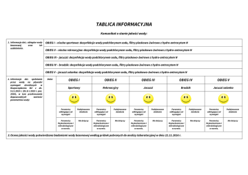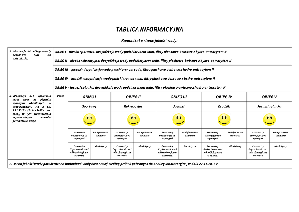 TABLICA INFORMACYJNA Komunikat o stanie jakości wody: 1. Informacja dot.: obiegów wody basenowej oraz ich uzdatniania. OBIEG I – niecka sportowa: dezynfekcja wody podchlorynem sodu, filtry piaskowo-żwirowe z hydro-antracytem N OBIEG II – niecka rekreacyjna: dezynfekcja wody podchlorynem sodu, filtry piaskowo-żwirowe z hydro-antracytem N OBIEG III – jacuzzi: dezynfekcja wody podchlorynem sodu, filtry piaskowo-żwirowe z hydro-antracytem N OBIEG IV – brodzik: dezynfekcja wody podchlorynem sodu, filtry piaskowo-żwirowe z hydro-antracytem N OBIEG V – jacuzzi solanka: dezynfekcja wody podchlorynem sodu, filtry piaskowo-żwirowe z hydro-antracytem N 2. Informacja dot. spełniania przez wodę na pływalni wymagań określonych w Rozporządzeniu MZ z dn. 9.11.2015 r. (Dz.U z 2015 r. poz. 2016), w tym przekroczenia dopuszczalnych wartości parametrów wody: Data: OBIEG I OBIEG II OBIEG III OBIEG IV OBIEG V Sportowy Rekreacyjny Jacuzzi Brodzik Jacuzzi solanka Parametry odbiegające od wymagań Podejmowane działania Parametry odbiegające od wymagań Podejmowane działania Parametry odbiegające od wymagań Podejmowane działania Parametry odbiegające od wymagań Podejmowane działania Parametry odbiegające od wymagań Podejmowane działania Parametry fizykochemiczne i mikrobiologiczne w normie. Nie dotyczy Parametry fizykochemiczne i mikrobiologiczne w normie. Nie dotyczy Parametry fizykochemiczne i mikrobiologiczne w normie. Nie dotyczy Parametry fizykochemiczne i mikrobiologiczne w normie. Nie dotyczy Parametry fizykochemiczne i mikrobiologiczne w normie. Nie dotyczy 3. Ocena jakości wody potwierdzona badaniami wody basenowej według próbek pobranych do analizy laboratoryjnej w dniu 22.11.2016 r.