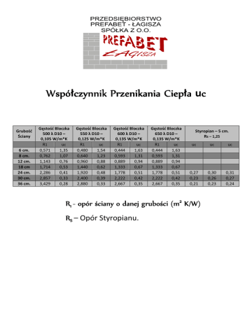 Współczynnik Wspó czynnik Przenikania Ciepła Ciep a ucc Grubość Ściany 6 cm. 8 cm. 12 cm. 18 cm 24 cm. 30 cm. 36 cm. Gęstość Bloczka 500 λ D10 – 0,105 W/m*K R1 uc 0,571 1,35 0,762 1,07 1,143 0,76 1,714 0,53 2,286 0,41 2,857 0,33 3,429 0,28 Gęstość Bloczka 550 λ D10 – 0,125 W/m*K R1 uc 0,480 1,54 0,640 1,23 0,960 0,88 1,440 0,62 1,920 0,48 2,400 0,39 2,880 0,33 Gęstość Bloczka 600 λ D10 – 0,135 W/m*K R1 uc 0,444 1,63 0,593 1,31 0,889 0,94 1,333 0,67 1,778 0,51 2,222 0,42 2,667 0,35 Gęstość Bloczka 650 λ D10 – 0,135 W/m*K R1 uc 0,444 1,63 0,593 1,31 0,889 0,94 1,333 0,67 1,778 0,51 2,222 0,42 2,667 0,35 Styropian – 5 cm. Rs – 1,25 uc uc uc 0,27 0,23 0,21 0,30 0,26 0,23 0,31 0,27 0,24 R1 - opór ściany o danej grubości (m2 K/W) RS – Opór Styropianu.