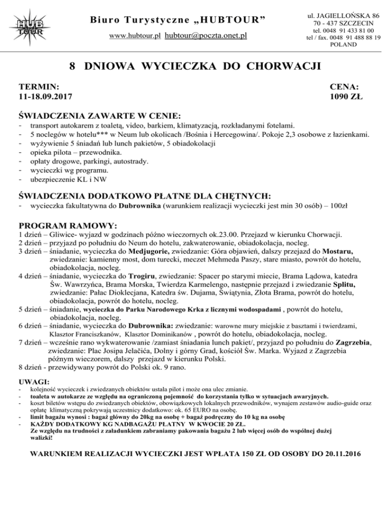 Biuro Turystyczne „HUBTOUR” ul. JAGIELLOŃSKA 86 70 - 437 SZCZECIN www.hubtour.pl [email protected] tel. 0048 91 433 81 00 tel / fax. 0048 91 488 88 19 POLAND 8 DNIOWA WYCIECZKA DO CHORWACJI TERMIN: 11-18.09.2017 CENA: 1090 ZŁ ŚWIADCZENIA ZAWARTE W CENIE: - transport autokarem z toaletą, video, barkiem, klimatyzacją, rozkładanymi fotelami. 5 noclegów w hotelu*** w Neum lub okolicach /Bośnia i Hercegowina/. Pokoje 2,3 osobowe z łazienkami. wyżywienie 5 śniadań lub lunch pakietów, 5 obiadokolacji opieka pilota – przewodnika. opłaty drogowe, parkingi, autostrady. wycieczki wg programu. ubezpieczenie KL i NW ŚWIADCZENIA DODATKOWO PŁATNE DLA CHĘTNYCH: - wycieczka fakultatywna do Dubrownika (warunkiem realizacji wycieczki jest min 30 osób) – 100zł PROGRAM RAMOWY: 1 dzień – Gliwice- wyjazd w godzinach późno wieczornych ok.23.00. Przejazd w kierunku Chorwacji. 2 dzień – przyjazd po południu do Neum do hotelu, zakwaterowanie, obiadokolacja, nocleg. 3 dzień – śniadanie, wycieczka do Medjugorie, zwiedzanie: Góra objawień, dalszy przejazd do Mostaru, zwiedzanie: kamienny most, dom turecki, meczet Mehmeda Paszy, stare miasto, powrót do hotelu, obiadokolacja, nocleg. 4 dzień – śniadanie, wycieczka do Trogiru, zwiedzanie: Spacer po starymi miecie, Brama Lądowa, katedra Św. Wawrzyńca, Brama Morska, Twierdza Karmelengo, następnie przejazd i zwiedzanie Splitu, zwiedzanie: Pałac Dioklecjana, Katedra św. Dujama, Świątynia, Złota Brama, powrót do hotelu, obiadokolacja, powrót do hotelu, nocleg. 5 dzień – śniadanie, wycieczka do Parku Narodowego Krka z licznymi wodospadami , powrót do hotelu, obiadokolacja, nocleg. 6 dzień – śniadanie, wycieczka do Dubrownika: zwiedzanie: warowne mury miejskie z basztami i twierdzami, Klasztor Franciszkanów, Klasztor Dominikanów , powrót do hotelu, obiadokolacja, nocleg. 7 dzień – wcześnie rano wykwaterowanie /zamiast śniadania lunch pakiet/, przyjazd po południu do Zagrzebia, zwiedzanie: Plac Josipa Jelačića, Dolny i górny Grad, kościół Św. Marka. Wyjazd z Zagrzebia późnym wieczorem, dalszy przejazd w kierunku Polski. 8 dzień - przewidywany powrót do Polski ok. 9 rano. UWAGI: - kolejność wycieczek i zwiedzanych obiektów ustala pilot i może ona ulec zmianie. toaleta w autokarze ze względu na ograniczoną pojemność do korzystania tylko w sytuacjach awaryjnych. koszt biletów wstępu do zwiedzanych obiektów, obowiązkowych lokalnych przewodników, wynajem zestawów audio-guide oraz opłatę klimatyczną pokrywają uczestnicy dodatkowo: ok. 65 EURO na osobę. limit bagażu wynosi : bagaż główny do 20kg na osobę + bagaż podręczny do 10 kg na osobę KAŻDY DODATKOWY KG NADBAGAŻU PŁATNY W KWOCIE 20 ZŁ. Ze względu na trudności z załadunkiem zabraniamy pakowania bagażu 2 lub więcej osób do wspólnej dużej walizki! WARUNKIEM REALIZACJI WYCIECZKI JEST WPŁATA 150 ZŁ OD OSOBY DO 20.11.2016
