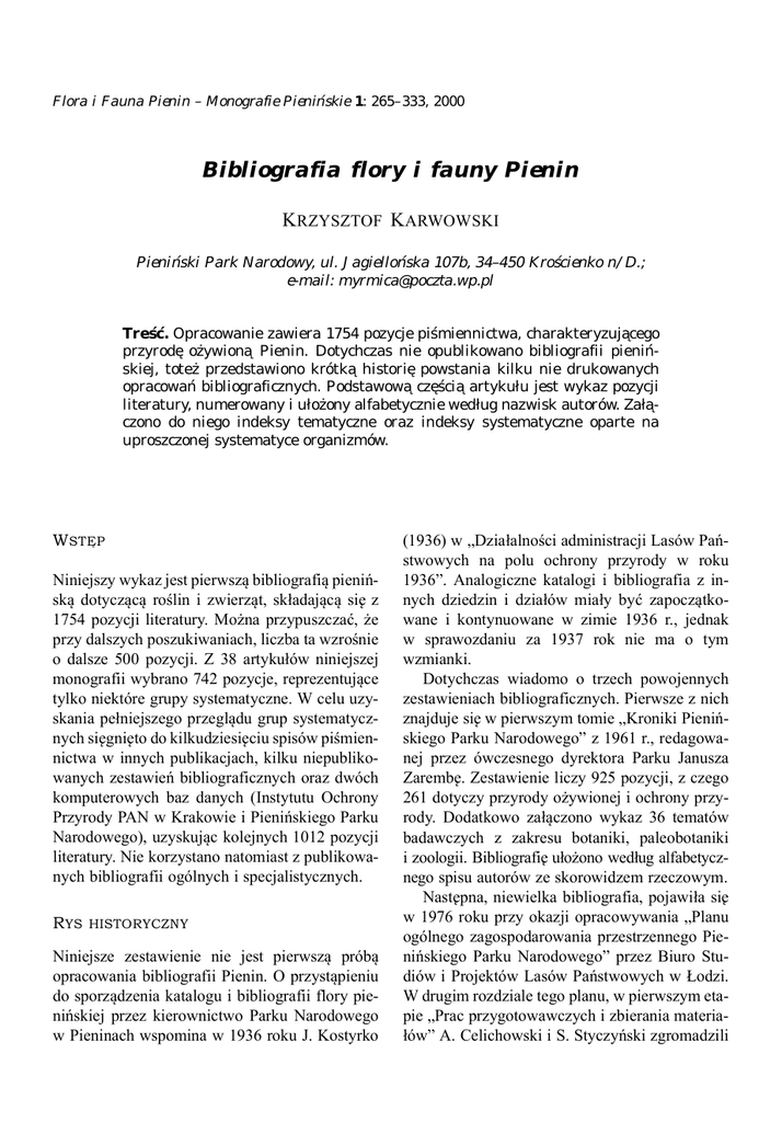 Flora i Fauna Pienin – Monografie Pienińskie 1: 265–333, 2000 Bibliografia flory i fauny Pienin KRZYSZTOF KARWOWSKI Pieniński Park Narodowy, ul. Jagiellońska 107b, 34–450 Krościenko n/D.; e-mail: [email protected] Treść. Opracowanie zawiera 1754 pozycje piśmiennictwa, charakteryzuja˛cego przyrode˛ ożywiona˛ Pienin. Dotychczas nie opublikowano bibliografii pienińskiej, toteż przedstawiono krótka˛ historie˛ powstania kilku nie drukowanych opracowań bibliograficznych. Podstawowa˛ cze˛ścia˛ artykułu jest wykaz pozycji literatury, numerowany i ułożony alfabetycznie według nazwisk autorów. Zała˛czono do niego indeksy tematyczne oraz indeksy systematyczne oparte na uproszczonej systematyce organizmów. WSTE˛P Niniejszy wykaz jest pierwsza˛ bibliografia˛ pienińska˛ dotycza˛ca˛ roślin i zwierza˛t, składaja˛ca˛ sie˛ z 1754 pozycji literatury. Można przypuszczać, że przy dalszych poszukiwaniach, liczba ta wzrośnie o dalsze 500 pozycji. Z 38 artykułów niniejszej monografii wybrano 742 pozycje, reprezentuja˛ce tylko niektóre grupy systematyczne. W celu uzyskania pełniejszego przegla˛du grup systematycznych sie˛gnie˛to do kilkudziesie˛ciu spisów piśmiennictwa w innych publikacjach, kilku niepublikowanych zestawień bibliograficznych oraz dwóch komputerowych baz danych (Instytutu Ochrony Przyrody PAN w Krakowie i Pienińskiego Parku Narodowego), uzyskuja˛c kolejnych 1012 pozycji literatury. Nie korzystano natomiast z publikowanych bibliografii ogólnych i specjalistycznych. RYS HISTORYCZNY Niniejsze zestawienie nie jest pierwsza˛ próba˛ opracowania bibliografii Pienin. O przysta˛pieniu do sporza˛dzenia katalogu i bibliografii flory pienińskiej przez kierownictwo Parku Narodowego w Pieninach wspomina w 1936 roku J. Kostyrko (1936) w „Działalności administracji Lasów Państwowych na polu ochrony przyrody w roku 1936”. Analogiczne katalogi i bibliografia z innych dziedzin i działów miały być zapocza˛tkowane i kontynuowane w zimie 1936 r., jednak w sprawozdaniu za 1937 rok nie ma o tym wzmianki. Dotychczas wiadomo o trzech powojennych zestawieniach bibliograficznych. Pierwsze z nich znajduje sie˛ w pierwszym tomie „Kroniki Pienińskiego Parku Narodowego” z 1961 r., redagowanej przez ówczesnego dyrektora Parku Janusza Zarembe˛. Zestawienie liczy 925 pozycji, z czego 261 dotyczy przyrody ożywionej i ochrony przyrody. Dodatkowo zała˛czono wykaz 36 tematów badawczych z zakresu botaniki, paleobotaniki i zoologii. Bibliografie˛ ułożono według alfabetycznego spisu autorów ze skorowidzem rzeczowym. Naste˛pna, niewielka bibliografia, pojawiła sie˛ w 1976 roku przy okazji opracowywania „Planu ogólnego zagospodarowania przestrzennego Pienińskiego Parku Narodowego” przez Biuro Studiów i Projektów Lasów Państwowych w Łodzi. W drugim rozdziale tego planu, w pierwszym etapie „Prac przygotowawczych i zbierania materiałów” A. Celichowski i S. Styczyński zgromadzili 266 F LORA I F AUNA P IENIN – Monografie Pienińskie, t.1 bibliografie˛ licza˛ca˛ 307 pozycji, w której tylko 66 pozycji dotyczyło przyrody ożywionej. Ostatnia, najobszerniejsza „Bibliografia pienińska za okres do końca 1975 r.”, została opracowana przez Rajmunda Bartyzela – pracownika naukowego Parku w latach 1969–85. Opracowanie było specjalnie przygotowane do druku z okazji 50-lecia Pienińskiego Parku Narodowego w 1982 r., ale nie została jednak wydrukowana i, podobnie jak powyższe, znajduje sie˛ w bibliotece Parku w postaci maszynopisu. Zawiera ona 1366 pozycji, w tym 502 pozycje z zakresu przyrody ożywionej. Obie ostatnie bibliografie skonstruowano w podobny sposób – podzielono je na działy tematyczne (np. turystyka, klimat, osadnictwo), a w nich wypisano literature˛ z zachowaniem alfabetycznej kolejności nazwisk autorów. Podsumowuja˛c – plany opracowania bibliografii pienińskiej zrodziły sie˛ już w cztery lata po powstaniu Parku Narodowego w Pieninach, ich realizacja (w postaci maszynopisów) nasta˛piła dopiero w latach 1961–1982, natomiast druk pierwszej bibliografii nasta˛pił dopiero teraz. Słowacy także opracowywali bibliografie˛ pienińska˛. W 1967 roku D. Janota napisał „Systematicko-chronologická bibliografia Pienin do roku 1966” a w 1983 roku A. Marček opublikował: „Bibliografia o Pieninách (Pieninský národný park a Pieninski Park Narodowy)”. TECHNIKA OPISU Niniejsza bibliografia jest bibliografia˛ specjalna˛ treściowa˛ (zakres ograniczony jest do zagadnień zwia˛zanych z przyroda˛ ożywiona˛), przedmiotowa˛ (dotyczy przede wszystkim Pienin oraz Pienińskiego Parku Narodowego), podmiotowa˛ (zawiera m.in. pozycje wytworzone w regionie pienińskim) oraz pochodna˛ (zawiera opisy zaczerpnie˛te z innych bibliografii). Posiada charakter bibliografii mie˛dzynarodowej (wyste˛puja˛ wydawnictwa austriackie, niemieckie, rosyjskie, słowackie i czeskie). Układ bibliografii oparty jest na kryteriach wydawniczo-formalnych o układzie alfabetycznym, autorsko-tytułowym. W obre˛bie jednego autora pozycje uporza˛dkowano chronologicznie. Każda˛ pozycje˛ ponumerowano w celu umożliwienia pracy z indeksami. Na końcu zestawienia doła˛czono indeks tematyczny, oparty na podziale wg działów i dyscyplin naukowych oraz indeks systematyczny oparty na uproszczonej systematyce organizmów. Indeks tematyczny zestawiony jest w siedmiu działach obejmuja˛cych: 1 – botanike˛, 2 – zoologie˛ (podzielone na 14 dyscyplin, na przykład faunistyke˛, fitosocjologie˛, zoogeografie˛), 3 – ogólne opisy przyrody, 4 – hydrobiologie˛, 5 – sozologie˛, 6 – parazytologie˛ i 7 – leśnictwo. Zastosowano bardzo uproszczony podział indeksów na grupy tematyczne, kieruja˛c sie˛ jedynie kryterium liczby opracowań w danym temacie (zagadnieniu) – powyżej 20 pozycji piśmiennictwa wydzielano kolejna˛ grupe˛ indeksów. Tak wie˛c paleozoologia, systematyka roślin czy f