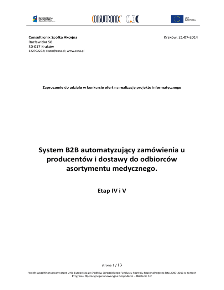 Consultronix Spółka Akcyjna Racławicka 58 30-017 Kraków Kraków, 21-07-2014 122902222; [email protected]; www.cxsa.pl Zaproszenie do udziału w konkursie ofert na realizację projektu informatycznego System B2B automatyzujący zamówienia u producentów i dostawy do odbiorców asortymentu medycznego. Etap IV i V strona 1 / 13 Projekt współfinansowany przez Unię Europejską ze środków Europejskiego Funduszu Rozwoju Regionalnego na lata 2007-2013 w ramach Programu Operacyjnego Innowacyjna Gospodarka – Działanie 8.2 1. Zamawiający Consultronix Spółka Akcyjna Racławicka 58 30-017 Kraków NIP: 676-01-15-479 2. Opis oraz zakres zamówienia Zamówienie dotyczy dostarczenia i uruchomienia systemu B2B zintegrowanego z posiadanym przez Zamawiającego systemem ERP Enova. Realizacja projektu została podzielona na 5 etapów. Niniejszy konkurs ofert dotyczy Etapu IV i V łącznie. Zamawiający nie dopuszcza składania ofert częściowych! Zakres ofert: Etap IV obejmuje dostarczenie i wdrożenie: o Serwerów - 2 szt. o Macierzy – 1 szt. o Szafy serwerowej 42U z wyposażeniem o Oprogramowania do wirtualizacji Etap V obejmuje dostarczenie i wdrożenie: o Napędu i kaset do archiwizacji o Oprogramowania do archiwizacji. o Oprogramowania serwerowego. Szczegółowe warunki wdrożenia opisano w Załączniku 1. Warunki wsparcia posprzedażnego opisano w Załączniku 2. Zamawiający dopuszcza składanie ofert wariantowych na serwery pod następującymi warunkami: 1. Konieczne jest przedstawienie oferty na urządzenie w konfiguracji minimalnej oraz urządzenie rozbudowane. 2. Różnica cen oferowanych urządzeń nie może przekroczyć 35% wartości urządzenia tańszego. 3. Terminy realizacji Termin realizacji etapu IV zamówienia upływa dnia 31-08-2014. Okres realizacji etapu V: od dnia 1-09-2014 do dnia 31-10-2014. strona 2 / 13 Projekt współfinansowany przez Unię Europejską ze środków Europejskiego Funduszu Rozwoju Regionalnego na lata 2007-2013 w ramach Programu Operacyjnego Innowacyjna Gospodarka – Działanie 8.2 4. Szczegółowa konfiguracja minimalna 4.1. Serwery (2 sztuki) Parametr Obudowa Procesory Ilość procesorów Sloty pamięci RAM Pamięci RAM Pamięć zainstalowana Sloty rozszerzeń Interfejs sieciowy 1GBase-T Interfejs sieciowy 10GBase-T, lub 10GB SFP+ (takie jak w switchu!) Interfejs FC 8GB Dyski i napędy optyczne Zasilacz redundantny 650W Wyposażenie dodatkowe Zarządzanie serwerem Gwarancja Certyfikat kompatybilności VMWare Wartość Rack, 2U Xeon E5-26xx v2, 2GHz, 6 core 2 24 16GB 1600MHz ECC Dual Rank Serwer 1: 128 GB, Serwer 2: 160 GB 144 GB średnia…. 2 x PCIe 3.0 x8; 1 x PCIe 3.0 x16 2 porty 2 Porty 2 porty Bezdyskowy, bootowanie z karty flash 1 kpl. Prowadnica rack, prowadnica kabli, panel czołowy Zdalny dostęp do konsoli serwera po IP na poziomie BIOS Oprogramowanie do monitorowania parametrów serwera 3 lata, NBD TAK 4.2. Macierz (1 sztuka) – parametry minimalne Parametr Obudowa Pólka dyskowa Poziomy RAID Obsługiwane dyski Interfejs dysków Dyski zainstalowane Maksymalna ilość obsługiwanych dysków Reduntantny kontroler RAID Cache macierzy Interfejsy FC 8GB Wbudowany port 1GBase-T Możliwość instalacji dodatkowych portów (FC, sieciowych) bez wymiany kontrolera Zasilacz redundantny Deduplikacja Wartość Rack 2,5” 0, 1, 5, 6, 10 SAS, SSD, NL-SAS/SATA SAS 6Gb 16 x 2,5” 600GB 10k Powyżej 100 1 kpl. 16 GB 6 portów 2 szt. TAK 1 kpl. Nie wymagana strona 3 / 13 Projekt współfinansowany przez Unię Europejską ze środków Europejskiego Funduszu Rozwoju Regionalnego na lata 2007-2013 w ramach Programu Operacyjnego Innowacyjna Gospodarka – Działanie 8.2 Thin provisioning Funkcjonalności dodatkowe (opcjonalne) dostępne bez rozbudowy sprzętowej macierzy po zakupieniu licencji Utrzymanie cen licencji (w walucie zakupu, ±15%) funkcjonalności wymienionych w p. 11.E w czasie trwania gwarancji System zbierania i prezentowania parametrów w czasie rzeczywistym, oraz danych historycznych Zarządzanie zdalne po IP Komplet kabli FC OM3, zasilających, LC-LC Szyna rack Prowadnica (wspornik) kabli Panel czołowy Gwarancja Certyfikat kompatybilności VMWare TAK Cache na dyskach SSD Kompresja w czasie rzeczywistym Replikacja po iSCSI Tiering na wszystkich typach dysków TAK TAK TAK TAK TAK TAK TAK 5 lat, NBD TAK 4.3. Szafa rack z wyposażeniem pasywnym Parametr Wysokość Szerokość Głębokość Rama kompatybilna z prowadnicami czołowych producentów sprzętu, np.: HP, IBM, Fujitsu, Dell, Cisco, EMC+… Drzwi przednie i tylne Boki Cokół nieruchomy Listwa zasilająca standardowa Listwa zasilająca inteligentna Wieszak kabli 1U (patchcordów) Kieszeń na dokumenty Półka nieruchoma Uchwyty i prowadnice pionowe kabli, zaślepki, itp… Wartość 42 U 600 mm 1000 mm TAK Z siatką Demontowane TAK 7 – 9 gniazd typu E lub E/F (z bolcem lub Schuko z bolcem) 5+ gniazd IEC C13, Watchdog i Sheduler dla każdego gniazda, zarządzanie po IP 1 szt. 1 szt. 2 szt. Minimalna ilość zapewniająca funkcjonalność i ergonomię rozwiązania strona 4 / 13 Projekt współfinansowany przez Unię Europejską ze środków Europejskiego Funduszu Rozwoju Regionalnego na lata 2007-2013 w ramach Programu Operacyjnego Innowacyjna Gospodarka – Działanie 8.2 4.4. Wyposażenie aktywne szafy rack (switch’e) – 2 sztuki (parametry minimalne) Parametr Obudowa Zarządzanie zdalne Porty 1GBase-T Porty 10GBase-T, lub 10GB SFP (typ taki jak w serwerach!) Porty do stackowania Kabel do stackowania Tablica MAC Przepustowość Gwarancja Wartość 1U L2, L3 24 szt. 4 szt. 2 szt. 1 szt. 8000 90 Mpps 3 lata NBD 4.5. Napęd i kasety do backup’u Parametr Napęd RDx Kasety 2TB Kasety 1TB Wartość Zewnętrzny, USB 3.0 4 szt. 6 szt. 4.6. Oprogramowanie Parametr Oprogramowanie do wirtualizacji Oprogramowanie do archiwizacji Oprogramowanie serwerowe Licencje dostępowe Wartość VMWare Essential Kit Plus (6 socket), 3 years subscription Veeam Backup Essentials Enterpise (6 socket), 
