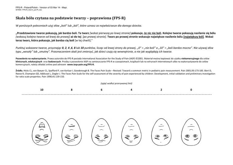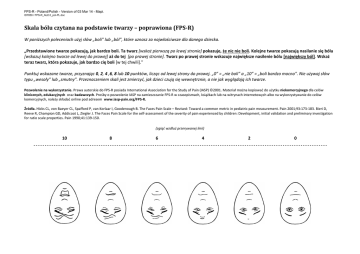 FPS-R - Poland/Polish - Version of 03 Mar 14 - Mapi. ID7858 / FPS-R_AU2.0_pol-PL.doc Skala bólu czytana na podstawie twarzy – poprawiona (FPS-R) W poniższych poleceniach użyj słów „boli” lub „ból”, które uznasz za najwłaściwsze dla danego dziecka. „Przedstawione twarze pokazują, jak bardzo boli. Ta twarz [wskaż pierwszą po lewej stronie] pokazuje, że nic nie boli. Kolejne twarze pokazują nasilanie się bólu [wskazuj kolejno twarze od lewej do prawej] aż do tej [po prawej stronie]. Twarz po prawej stronie wskazuje największe nasilenie bólu [największy ból]. Wskaż teraz twarz, która pokazuje, jak bardzo cię boli [w tej chwili].” Punktuj wskazane twarze, przyznając 0, 2, 4 ,6, 8 lub 10 punktów, licząc od lewej strony do prawej. „0” = „nie boli” a „10” = „boli bardzo mocno”. Nie używaj słów typu „wesoły” lub „smutny”. Przeznaczeniem skali jest zmierzyć, jak dzieci czują się wewnętrznie, a nie jak wyglądają ich twarze. Pozwolenie na wykorzystanie. Prawa autorskie do FPS-R posiada International Association for the Study of Pain (IASP) ©2001. Materiał można kopiować do użytku niekomercyjnego dla celów klinicznych, edukacyjnych oraz badawczych. Prośby o pozwolenie IASP na zamieszczanie FPS-R w czasopismach, książkach lub na witrynach internetowych albo na wykorzystywanie do celów komercyjnych, należy składać online pod adresem www.iasp-pain.org/FPS-R. Źródła. Hicks CL, von Baeyer CL, Spafford P, van Korlaar I, Goodenough B. The Faces Pain Scale – Revised: Toward a common metric in pediatric pain measurement. Pain 2001;93:173-183. Bieri D, Reeve R, Champion GD, Addicoat L, Ziegler J. The Faces Pain Scale for the self-assessment of the severity of pain experienced by children: Development, initial validation and preliminary investigation for ratio scale properties. Pain 1990;41:139-150. (zgiąć wzdłuż przerywanej linii) 10 8 6 4 2 0