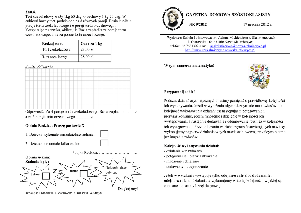 Zad.6. Tort czekoladowy waży 1kg 60 dag, orzechowy 1 kg 20 dag. W cukierni każdy tort podzielono na 8 równych porcji. Basia kupiła 4 porcje tortu czekoladowego i 6 porcji tortu orzechowego. Korzystając z cennika, oblicz, ile Basia zapłaciła za porcje tortu czekoladowego, a ile za porcje tortu orzechowego. Rodzaj tortu Tort czekoladowy Cena za 1 kg 23,00 zł Tort orzechowy 28,00 zł GAZETKA DOMOWA SZÓSTOKLASISTY NR 9/2012 17 grudnia 2012 r. Wydawca: Szkoła Podstawowa im. Adama Mickiewicza w Skalmierzycach ul. Ostrowska 16; 63-460 Nowe Skalmierzyce tel/fax: 62 7621302 e-mail: [email protected] http://www.spskalmierzyce.noweskalmierzyce.pl W tym numerze matematyka! Zapisz obliczenia. Przypomnij sobie! Odpowiedź: Za 4 porcje tortu czekoladowego Basia zapłaciła ......... zł, a za 6 porcji tortu orzechowego .............. zł. Opinia Rodzica: Proszę postawić X 1. Dziecko wykonało samodzielnie zadania: 2. Dziecko nie umiało kilku zadań: Podpis Rodzica: ……………………...…. Opinia ucznia: Zadania były: Łatwe Trudne Najtrudniejsze były zad: Dziękujemy! Redakcja: J. Krawczyk, J. Małkowska, K. Onisczuk, A. Stryjak Podczas działań arytmetycznych musimy pamiętać o prawidłowej kolejności ich wykonywania. Jeżeli w wyrażeniu algebraicznym nie ma nawiasów, to kolejność wykonywania działań jest następująca: potęgowanie i pierwiastkowanie, potem mnożenie i dzielenie w kolejności ich występowania, a następnie dodawanie i odejmowanie również w kolejności ich występowania. Przy obliczaniu wartości wyrażeń zawierających nawiasy, wykonujemy najpierw działania w tych nawiasach, wewnątrz których nie ma już innych nawiasów. Kolejność wykonywania działań: - działania w nawiasach - potęgowanie i pierwiastkowanie - mnożenie i dzielenie - dodawanie i odejmowanie Jeżeli w wyrażeniu występuje tylko odejmowanie albo dodawanie i odejmowanie, to działania te wykonujemy w takiej kolejności, w jakiej są zapisane, od strony lewej do prawej. Przykłady: 56 - 14 - 15 - 13 = 42 - 15 - 13 = 27 - 13 = 14 33 - 12 + 7 - 20 + 5 = 21 + 7 - 20 + 5 = 28 - 20 + 5 = 8 + 5 = 13 Jeżeli w wyrażeniu występuje tylko dzielenie albo mnożenie i dzielenie, to działania te wykonujemy w takiej kolejności, w jakiej są zapisane, od strony lewej do prawej. Przykłady: 100 : 5: 5 : 2 = 20 : 5: 2 = 4 : 2 = 2 10 · 6: 5 : 4 · 15 = 60 : 5: 4 · 15 = 12 : 4 · 15 = 3 · 15 = 45 Jeżeli w wyrażeniu występuje kilka działań i nie ma nawiasów, to jako pierwsze wykonujemy mnożenie i dzielenie w kolejności ich występowania, a następnie wykonujemy dodawanie i odejmowanie w kolejności ich występowania. Zadania z matematyki - na podstawie materiałów OKE w Krakowie Wykres do zadań od 1. do 3. o Zad.2. W którym okresie czasu wzrost temperatury był największy? A. B. C. D. Od 5 do 10 minuty. Od 10 do 15 minuty. Od 15 do 20 minuty. Od 20 do 25 minuty. Zad.3. W którym okresie czasu różnica temperatur była najmniejsza? Przykłady: 50 - 5 · 7 + 16 = 50 - 35 + 16 = 15 + 16 = 31 4 · 7 - 13 + 15 : 3 = 28 - 13 + 5 = 15 + 5 = 20 Temeratura w C Zad.1. Wykres przedstawia zmiany temperatury w piekarniku w zależności od czasu. Wpisz P jeśli zdanie jest prawdziwe lub F jeśli zdanie jest fałszywe. a) W 15 minucie temperatura w piekarniku wynosiła 120oC. .............. b) Do temperatury 150C piekarnik nagrzał się po 25 minutach. ............... c) W piekarniku temperatura 180C utrzymywała się przez 65 minut. ……….... d) Od 75 minuty do 80 minuty temperatura w piekarniku spadła o 10oC …………. A. B. C. D. Między 15 a 25 minutą. Między 20 a 30 minutą. Między 65 a 75 minutą. Między 70 a 80 minutą. Zad.4. W spotkaniu imieninowym wzięło udział 12 osób. Dzieci było 2 razy więcej niż dorosłych. Na spotkaniu było: 200 180 160 140 120 100 80 60 40 20 0 A. B. C. D. 9 dzieci i 3 dorosłych. 8 dzieci i 4 dorosłych. 7 dzieci i 5 dorosłych. 4 dzieci i 8 dorosłych. Zad.5. W jednej szklance mieści się około 24 dag orzeszków. Półtorej szklanki to około: 0 5 10 15 20 25 30 35 40 45 50 55 60 65 70 75 80 Czas w minutach A. 12 dag orzeszków. B. 24 dag orzeszków. C. 36 dag orzeszków. D. 48 dag orzeszków.