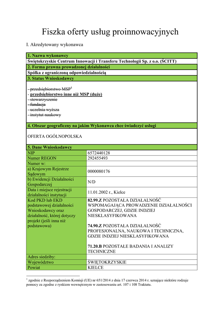 Fiszka oferty usług proinnowacyjnych I. Akredytowany wykonawca 1. Nazwa wykonawcy Świętokrzyskie Centrum Innowacji i Transferu Technologii Sp. z o.o. (ŚCITT) 2. Forma prawna prowadzonej działalności Spółka z ograniczoną odpowiedzialnością 3. Status Wnioskodawcy - przedsiębiorstwo MSP1 - przedsiębiorstwo inne niż MSP (duże) - stowarzyszenie - fundacja - uczelnia wyższa - instytut naukowy 4. Obszar geograficzny na jakim Wykonawca chce świadczyć usługi OFERTA OGÓLNOPOLSKA 5. Dane Wnioskodawcy NIP Numer REGON Numer w: a) Krajowym Rejestrze Sądowym b) Ewidencji Działalności Gospodarczej Data i miejsce rejestracji działalności instytucji Kod PKD lub EKD podstawowej działalności Wnioskodawcy oraz działalność, której dotyczy projekt (jeśli inna niż podstawowa) 6572440128 292455493 0000080176 N/D 11.01.2002 r., Kielce 82.99.Z POZOSTAŁA DZIAŁALNOŚĆ WSPOMAGAJĄCA PROWADZENIE DZIAŁALNOŚCI GOSPODARCZEJ, GDZIE INDZIEJ NIESKLASYFIKOWANA 74.90.Z POZOSTAŁA DZIAŁALNOŚĆ PROFESJONALNA, NAUKOWA I TECHNICZNA, GDZIE INDZIEJ NIESKLASYFIKOWANA 71.20.B POZOSTAŁE BADANIA I ANALIZY TECHNICZNE Adres siedziby: Województwo Powiat 1 ŚWIĘTOKRZYSKIE KIELCE zgodnie z Rozporządzeniem Komisji (UE) nr 651/2014 z dnia 17 czerwca 2014 r. uznające niektóre rodzaje pomocy za zgodne z rynkiem wewnętrznym w zastosowaniu art. 107 i 108 Traktatu. Gmina Miejscowość Ulica Nr budynku Nr lokalu Kod pocztowy Numer telefonu Numer faksu Adres poczty elektronicznej Adres strony internetowej KIELCE KIELCE AL. SOLIDARNOŚCI 34 N/D 25-323 41 34 32 910 41 34 32 912 [email protected] WWW.IT.KIELCE.PL II. Potencjał Wykonawcy 6. Krótka historia działalności Wykonawcy Celem statutowym ŚCITT jest wsparcie rozwoju przedsiębiorczości i innowacyjności, a jego działalność jest prowadzona nie dla zysku. Zyski z działalności, o ile występują, są wykorzystywane na realizację celów statutowych ośrodka. Świętokrzyskie Centrum Innowacji i Transferu Technologii Sp. z o.o. jest instytucją otoczenia biznesu, która posiada ponad 10 letnie doświadczenie z zakresu animowania transferu wiedzy i technologii, rozwoju przedsiębiorczości, innowacji oraz podejmuje wiele inicjatyw wspierających rozwój podmiotów na rynkach regionalnych, krajowych i międzynarodowych. Zostało założone 18 grudnia 2001 roku, jako instytucja non-profit, przez: Województwo Świętokrzyskie, Miasto Kielce, Politechnikę Świętokrzyską, Staropolską Izbę Przemysłowo-Handlową. Aktualnie udziałowcami ŚCITT są: Województwo Świętokrzyskie (81,43% udziałów), Politechnika Świętokrzyska (18,57% udziałów). Misją ŚCITT jest: wspieranie przedsiębiorczości oraz stymulowanie rozwoju regionu świętokrzyskiego poprzez: transfer osiągnięć naukowo – badawczych, informację gospodarczą dla Małych i Średnich Przedsiębiorstw, systemy jakości ISO, targi i konferencje, obsługa zadań dla jednostek samorządu terytorialnego. Działania ŚCITT to przede wszystkim realizacja aktywności gospodarczej w sferze nowych technologii i innowacji, realizacja założeń strategii rozwoju regionalnego, wspieranie dużych, małych i średnich przedsiębiorstw w zakresie ich konkurencyjności, wspieranie samorządu lokalnego w zakresie nowoczesnych form inwestowania, współpraca z samorządem lokalnym w sferze procesów innowacyjno-wdrożeniowych, pośredniczenie w przekazywaniu informacji pomiędzy przemysłem a placówkami badawczo-wdrożeniowymi, wsparcie i obsługa firm i jednostek badawczych w zakresie ochrony własności intelektualnej, propagowanie wiedzy technicznej i innowacyjnej poprzez organizowanie szkoleń i doradztwo. Wszystkie te działania wdrażane są poprzez realizację licznych projektów o zasięgu regionalnym, krajowym i międzynarodowym. W celu systematycznej realizacji założonych celów Spółka oferuje: Usługi szkoleniowe w obszarach tematycznych: efektywna gospodarka energetyczna, zarządzanie energią w przedsiębiorstwie, projektowanie innowacyjnych budynków energooszczędnych, efektywność energetyczna w użytkowaniu obiektów budowlanych, cykliczne spotkania tematyczne w obszarze EWE, branżowe Fora Innowacji, partner Search. Eksperckie usługi doradcze i informacyjne dla firm z regionu świętokrzyskiego: audyty technologiczne, strategie wdrażania innowacji w firmach, świadectwa charakterystyki energetycznej. Eksperckie usługi doradcze i informacyjne w zakresie realizacji projektów energetycznych w formule Partnerstwa Publiczno – Prywatnego: opracowanie analiz wykonalności i rentowności inwestycji w oparciu o PPP dla przedsiębiorstw, koncepcje usługi kompleksowego wdrożenia inwestycji w formule PPP. Wyjazdy studyjne i misje branżowe. Zakres wyjazdów odpowiada tematycznie kluczowym specjalizacjom regionu. 7. Rodzaj usług, jakie Wykonawca oferuje w ramach systemu 1) usługi doradcze w zakresie innowacji – doradztwo, pomoc i szkolenia w zakresie transferu wiedzy, 2) usługi doradcze w zakresie innowacji - doradztwo, pomoc i szkolenia w zakresie nabywania i ochrony wartości niematerialnych i prawnych oraz korzystania z nich, 3) usługi doradcze w zakresie innowacji – doradztwo, pomoc i szkolenia w zakresie korzystania z norm i regulacji, w których są one osadzone, 4) usługi wsparcia innowacji – udostępnienie przestrzeni biurowej, banków danych, zasobów bibliotecznych, badań rynku, laboratoriów, 5) usługi wsparcia innowacji – znakowanie, testowanie i certyfikację jakości w celu opracowania bardziej efektywnych produktów procesów i usług. Nazwa usługi (Uwaga: Pozycje 1-3 mogą zaznaczyć jedynie ośrodki posiadające akredytację w zakresie świadczenia usług doradczych w zakresie innowacji, zaś pozycje 4-5 ośrodki posiadające także akredytację w zakresie świadczenia usług wsparcia innowacji). 8.2 Zakres szczegółowy oferowanej usługi Przegląd energetyczny wraz z identyfikacją miejsc znaczącego zużycia energii polegający na analizie