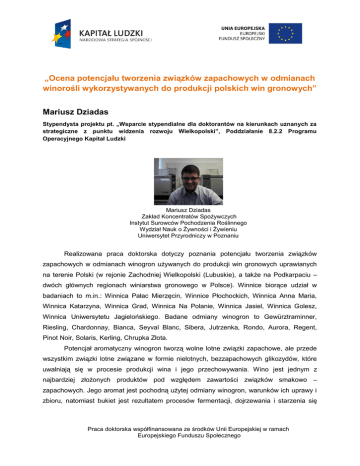 „Ocena potencjału tworzenia związków zapachowych w odmianach winorośli wykorzystywanych do produkcji polskich win gronowych” Mariusz Dziadas Stypendysta projektu pt. „Wsparcie stypendialne dla doktorantów na kierunkach uznanych za strategiczne z punktu widzenia rozwoju Wielkopolski”, Poddziałanie 8.2.2 Programu Operacyjnego Kapitał Ludzki Mariusz Dziadas Zakład Koncentratów Spożywczych Instytut Surowców Pochodzenia Roślinnego Wydział Nauk o Żywności i Żywieniu Uniwersytet Przyrodniczy w Poznaniu Realizowana praca doktorska dotyczy poznania potencjału tworzenia związków zapachowych w odmianach winogron używanych do produkcji win gronowych uprawianych na terenie Polski (w rejonie Zachodniej Wielkopolski (Lubuskie), a także na Podkarpaciu – dwóch głównych regionach winiarstwa gronowego w Polsce). Winnice biorące udział w badaniach to m.in.: Winnica Pałac Mierzęcin, Winnice Płochockich, Winnica Anna Maria, Winnica Katarzyna, Winnica Grad, Winnica Na Polanie, Winnica Jasiel, Winnica Golesz, Winnica Uniwersytetu Jagielońskiego. Badane odmiany winogron to Gewürztraminner, Riesling, Chardonnay, Bianca, Seyval Blanc, Sibera, Jutrzenka, Rondo, Aurora, Regent, Pinot Noir, Solaris, Kerling, Chrupka Złota. Potencjał aromatyczny winogron tworzą wolne lotne związki zapachowe, ale przede wszystkim związki lotne związane w formie nielotnych, bezzapachowych glikozydów, które uwalniają się w procesie produkcji wina i jego przechowywania. Wino jest jednym z najbardziej złożonych produktów pod względem zawartości związków smakowo – zapachowych. Jego aromat jest pochodną użytej odmiany winogron, warunków ich uprawy i zbioru, natomiast bukiet jest rezultatem procesów fermentacji, dojrzewania i starzenia się Praca doktorska współfinansowana ze środków Unii Europejskiej w ramach Europejskiego Funduszu Społecznego wina. W gotowym winie przywiązuje się głównie uwagę do wolnych związków zapachowych, odgrywających kluczową rolę w kształtowaniu jego aromatu. Część związków zapachowych przechodzących do wina z winogron zawarta jest w postaci bezzapachowych glikozydów. W ten sposób związane są m.in. monoterpeny, izoprenoidy, lotne fenole, benzeny, alkohole. Określenie zawartości związków zapachowych związanych w postaci glikozydów pozwala określić ile związków aromatycznych można „wydobyć” z winogron w procesie produkcji wina poprzez działanie pH, temperatury i endo- lub egzogennych enzymów o aktywności glikozydaz. O ile w literaturze istniej bardzo dużo prac poświęconych oznaczaniu związków zapachowych wina w formie wolnej, to prace poświęcone prekursorom tych związków stanowią kilka procent (<5) wszystkich publikacji. Nigdy nie badano pod tym względem odmian rodzimych uprawianych w Polsce, które krzyżowane przez lata są bardziej odporne na choroby i chłodniejszy klimat z uwagi na ich pochodzenie. Metody analityczne stosowane w tych badaniach to m.in. ekstrakcja do fazy stałej (C18) (rys.1), chromatografia gazowa i spektrometria mas oraz kompletna dwuwymiarowa chromatografia gazowa (rys.2). Ekstrakcja do fazy stałej jest jednym ze sposobów izolowania analitu. Mechanizm rozdziału odbywa się w układzie ciecz-ciało stałe przy zastosowaniu zmodyfikowanych materiałów krzemionkowych. Rozdział związków zachodzi tylko wtedy, kiedy wiązanie między sorbentem, a analitem jest silniejsze niż oddziaływanie między analitem i matrycą próbki. Etapy SPE to: 1. Kondycjonowanie złoża 2. Wprowadzenie próbki 3. Wymywanie zanieczyszczeń 4. Elucja analitu 5. Zatężenie ekstraktu do analizy GC/MS. Do szacowania zawartości aromatu: wolnych związków aromatycznych zsyntetyzowano znakowane izotopowo alkohole [2H7] – geraniol, [2H7] – nerol, [2H3] – β jonon oraz [2H8] – naftalen, oraz do szacowania aromatycznych aglikonów zwianych glikozydowo zsyntetyzowano znakowane izotopowo glikozydy [2H7] - geraniolu oraz [2H7] – nerolu połączone z β-D-glukozą. Praca doktorska współfinansowana ze środków Unii Europejskiej w ramach Europejskiego Funduszu Społecznego Rysunek 1. Ekstrakcja do fazy stałej na kolumnach z wypełnieniem C18 za pomoca stacji SUPELCO (autor Mariusz Dziadas). Rysunek 2. Chromatogram uzyskany po rozdziale mieszaniny występujących w surowcu Vitis vinifera (autor Mariusz Dziadas). Jak wynika z wstępnych badań (sezon 1), związków aromatycznych surowiec roślinny (jest bardzo zróżnicowany pod względem zawartości związków zapachowych skumulowanych w postaci Praca doktorska współfinansowana ze środków Unii Europejskiej w ramach Europejskiego Funduszu Społecznego nielotnych glikozydów, przez co istotne staje się zastosowanie technik pozwalających na wzbogacenie matrycy wina rys.2. Aurora Katarzyna Bianca Na Polanie ilość µg/kg ilość µg/kg 16000 10000 9000 8000 7000 6000 5000 4000 3000 2000 1000 0 14000 12000 10000 8000 6000 4000 2000 0 Monoterpeny zw.zapach. po h.kwas. Lotne fenole C13 norizoprenoidy zw.zapach. po h.enzymat. wolne zw. zapachowe Monoterpeny Lotne fenole zw.zapach. po h.kwas. C13 norizoprenoidy zw.zapach. po h.enzymat. wolne zw. zapachowe Rysunek 3. Porównanie zawartości wybranych związków zapachowych w dwóch białych odmianach winogron Aurora i Bianca. Na rys.1 przedstawiono wybrane odmiany średniej klasy, które są wykorzystywane do wyrobu białego wina gronowego. Odmiana Aurora z winnicy Katarzyna cechuje się typowym aromatem win półwytrawnych. Potencjał aromatyczny w tej odmianie w stosunku do zawartości wolnych związków jest niewielki, co wpłynie na niewielkie zmiany w bukiecie podczas dojrzewania wina. Nawet w przypadku zastosowania specyficznych hydrolaz efekt uwolnienia potencjału aromatycznego nie wpłynie znacząco na poprawę aromatu. W porównaniu z odmianą Bianca z winnicy Na Polanie, która cechuje się słabym aromatem kształtowanym przez wolne związki zapachowe, potencjał aromatyczny tej odmiany 