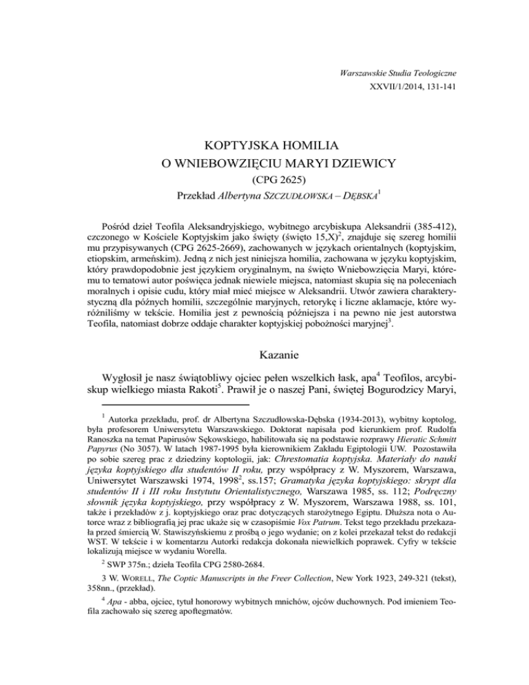 Warszawskie Studia Teologiczne XXVII/1/2014, 131-141 KOPTYJSKA HOMILIA O WNIEBOWZIĘCIU MARYI DZIEWICY (CPG 2625) Przekład Albertyna SZCZUDŁOWSKA – DĘBSKA1 Pośród dzieł Teofila Aleksandryjskiego, wybitnego arcybiskupa Aleksandrii (385-412), czczonego w Kościele Koptyjskim jako święty (święto 15,X)2, znajduje się szereg homilii mu przypisywanych (CPG 2625-2669), zachowanych w językach orientalnych (koptyjskim, etiopskim, armeńskim). Jedną z nich jest niniejsza homilia, zachowana w języku koptyjskim, który prawdopodobnie jest językiem oryginalnym, na święto Wniebowzięcia Maryi, któremu to tematowi autor poświęca jednak niewiele miejsca, natomiast skupia się na poleceniach moralnych i opisie cudu, który miał mieć miejsce w Aleksandrii. Utwór zawiera charakterystyczną dla późnych homilii, szczególnie maryjnych, retorykę i liczne aklamacje, które wyróŜniliśmy w tekście. Homilia jest z pewnością późniejsza i na pewno nie jest autorstwa Teofila, natomiast dobrze oddaje charakter koptyjskiej poboŜności maryjnej3. Kazanie Wygłosił je nasz świątobliwy ojciec pełen wszelkich łask, apa4 Teofilos, arcybiskup wielkiego miasta Rakoti5. Prawił je o naszej Pani, świętej Bogurodzicy Maryi, 1 Autorka przekładu, prof. dr Albertyna Szczudłowska-Dębska (1934-2013), wybitny koptolog, była profesorem Uniwersytetu Warszawskiego. Doktorat napisała pod kierunkiem prof. Rudolfa Ranoszka na temat Papirusów Sękowskiego, habilitowała się na podstawie rozprawy Hieratic Schmitt Papyrus (No 3057). W latach 1987-1995 była kierownikiem Zakładu Egiptologii UW. Pozostawiła po sobie szereg prac z dziedziny koptologii, jak: Chrestomatia koptyjska. Materiały do nauki języka koptyjskiego dla studentów II roku, przy współpracy z W. Myszorem, Warszawa, Uniwersytet Warszawski 1974, 19982, ss.157; Gramatyka języka koptyjskiego: skrypt dla studentów II i III roku Instytutu Orientalistycznego, Warszawa 1985, ss. 112; Podręczny słownik języka koptyjskiego, przy współpracy z W. Myszorem, Warszawa 1988, ss. 101, takŜe i przekładów z j. koptyjskiego oraz prac dotyczących staroŜytnego Egiptu. DłuŜsza nota o Autorce wraz z bibliografią jej prac ukaŜe się w czasopiśmie Vox Patrum. Tekst tego przekładu przekazała przed śmiercią W. Stawiszyńskiemu z prośbą o jego wydanie; on z kolei przekazał tekst do redakcji WST. W tekście i w komentarzu Autorki redakcja dokonała niewielkich poprawek. Cyfry w tekście lokalizują miejsce w wydaniu Worella. 2 SWP 375n.; dzieła Teofila CPG 2580-2684. 3 W. WORELL, The Coptic Manuscripts in the Freer Collection, New York 1923, 249-321 (tekst), 358nn., (przekład). 4 Apa - abba, ojciec, tytuł honorowy wybitnych mnichów, ojców duchownych. Pod imieniem Teofila zachowało się szereg apoftegmatów. 132 PS. TEOFIL ALEKSANDRYJSKI umiłowanej BoŜej Rodzicielce6 16 mesore7, podczas obchodzonego święta Wniebowzięcia. Wygłosił je takŜe z powodu Hebrajczyka, przebywającego w Rakoti – ów uwierzył w Chrystusa dzięki wizerunkowi na drewnianej desce naszej Pani, świętej Maryi, wiszącemu w pewnym pomieszczeniu. Wypowiedział je takŜe z powodu wielkiej ludzkiej nędzy. W pokoju BoŜym. (61, I) Amen. 998. Oto powraca do nas dzisiaj wspomnienie o świętej Bogurodzicy Maryi, Matce Chrystusa. Słyszę bowiem świętego proroka Dawida śpiewającego psalm tymi słowy: (61, II) „Wypowiadane są słowa pełne czci z powodu ciebie, wielkie miasto królewskie”9. O moi ukochani, czy nasza Pani, święta Maryja, nie jest Tą, która przyjęła do siebie Słowo, Jezusa Chrystusa, naszego Pana? CzyŜ to nie jest wielkie miasto królewskie? (62, I) UwaŜam, Ŝe to łono Maryi Dziewicy stało się miejscem pobytu Słowa Ojca. Wszak wyszło od Ojca і przebywało w Jej łonie dziewięć miesięcy, і ona porodziła je na ziemi. Chrystus przyjął wszystko, tak jak my, poza naszym grzechem; nie popełnił grzechu ani skryta, zła myśl nie wyszła z Jego ust. Zstąpił z nieba, siedząc po prawicy swego Ojca, і przybył w chwale, (62, II) aby sądzić Ŝywych і umarłych, aby dać kaŜdemu według jego uczynków dobrych albo złych. Teraz więc, о moi ukochani, zajmijmy się łaskami, jakimi obdarzono Dziewicę. Ona bowiem stała się brzemienną bez obcowania z męŜczyzną porodziła bez bólu, piastowała swego syna pierworodnego, zawinęła go w pieluszki, połoŜyła w Ŝłobie. Zaprawdę, on jest Synem (63,I) BoŜym, błogosławionym na wieki. О święta Dziewico Maryjo, opowiedz mi о Twym rodzie, о domu Twego ojca і Twej słuŜbie BoŜej. Ja sam bowiem uwaŜam, Ŝe dom, w którym teraz jesteś, to Jeruzalem Niebieskie przy Twym Synu. Proś zawsze swego Syna za nami grzesznymi, aby ulitował się nad nami – jesteś bowiem w stanie prosić za cały ród (63, II) Adama. Bądź pozdrowiona Ту, о święta Dziewico Maryjo, bowiem wykarmiłaś Chrystusa, karmiącego nas wszystkich swą dobrocią і niezmierzonym miłosierdziem. Bądź pozdrowiona, о Dziewico, nosiłaś bowiem w swych ramionach Tego, który uwolnił nas od grzechu і występku diabła. Błogosławionaś Ту, która Go nosiłaś, 5 Eg. „zbudowana dla boga Râ”, nazwa, którą w okresie koptyjskim określano Aleksandrię, zob. E. AMÉLINEAU, La Geographie de l’Egypte Copte, Paris 1893, 24 i n. 6 Theotokos - tytuł broniony przez Cyryla na Soborze Efeskim, szczególnie drogi egipskiej poboŜności maryjnej. 7 Dwunasty miesiąc w kalendarzu koptyjskim (dzień narodzin potomków boga Re), przypadający, wg kalendarza gregoriańskiego od 25 VII do 24 VIII, zob. A. DEMBSKA, Gramatyka koptyjska, Warszawa 1985, 55. 8 9 Kryptogram wyrazu amen. Ps. 86, 42, 2; cytaty wg Pismo Święte Starego i Nowego Testamentu, wyd. 2. Pallotinum, Poznań –Warszawa 1971. HOMILIA O WNIEBOWZIĘCIU MARYI DZIEWICY 133 błogosławionaś Ту, która z Nim rozmawiałaś, błogosławionaś Ту, która Go karmiłaś swym mlekiem, (64, I) о Królowo miejsca і spoczy