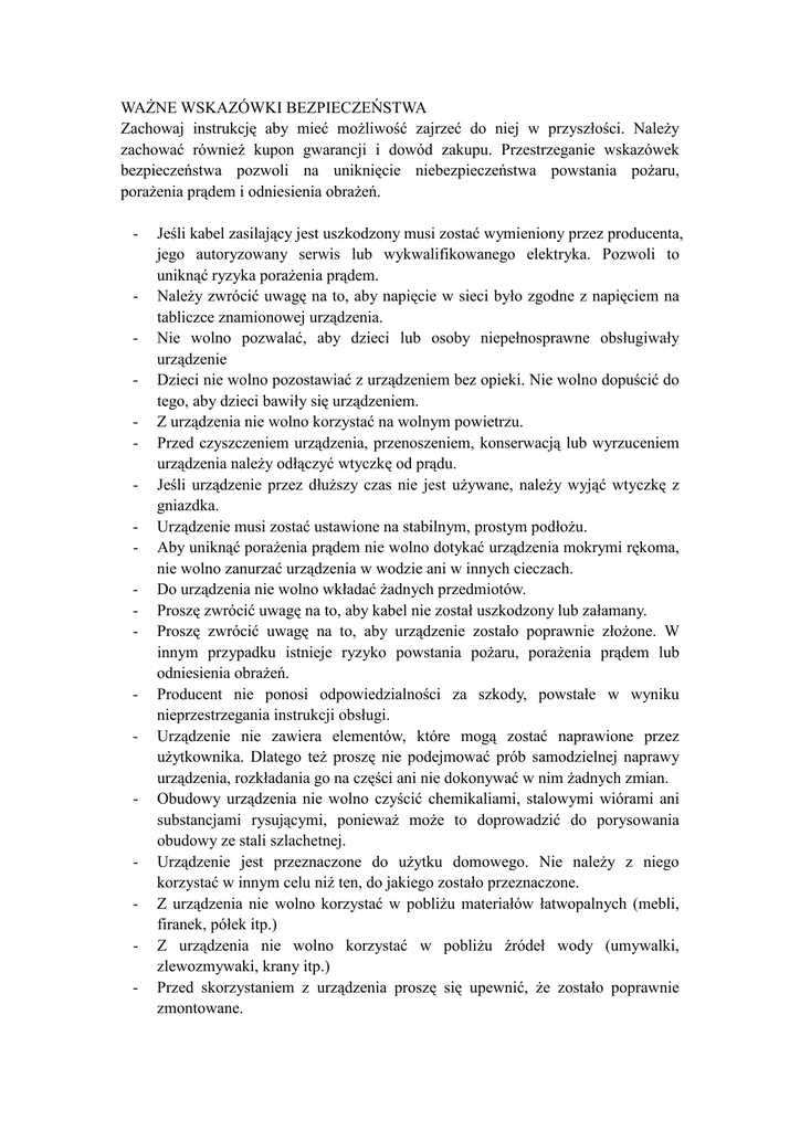 WAŻNE WSKAZÓWKI BEZPIECZEŃSTWA Zachowaj instrukcję aby