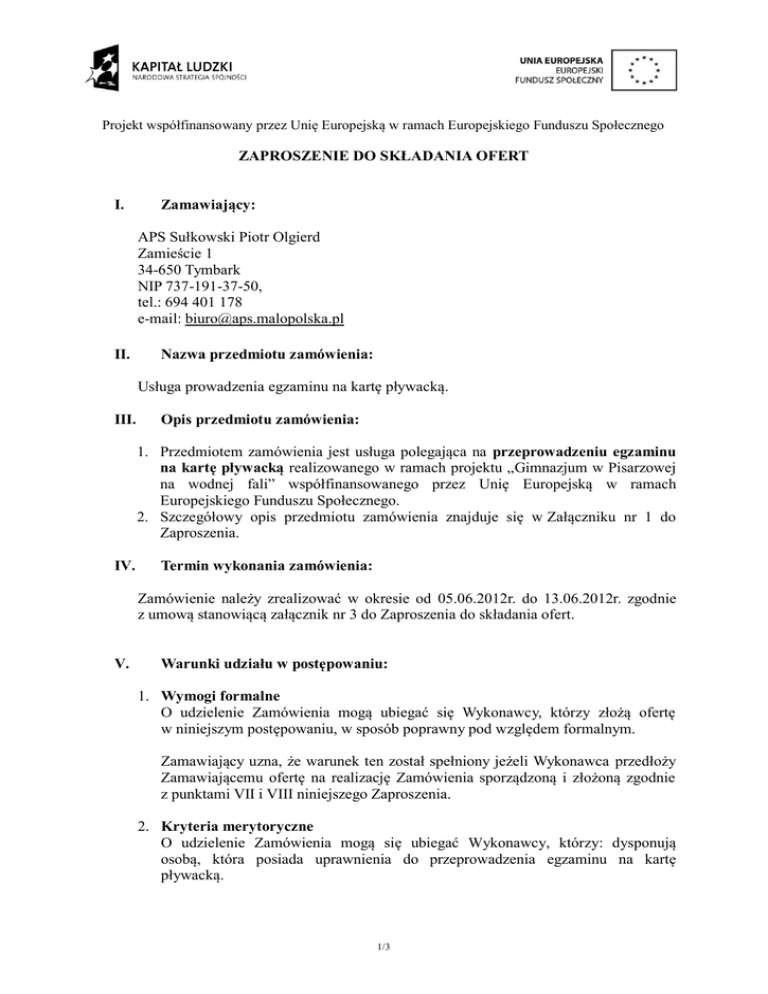 Projekt współfinansowany przez Unię Europejską w ramach Europejskiego Funduszu Społecznego ZAPROSZENIE DO SKŁADANIA OFERT I. Zamawiający: APS Sułkowski Piotr Olgierd Zamieście 1 34-650 Tymbark NIP 737-191-37-50, tel.: 694 401 178 e-mail: [email protected] II. Nazwa przedmiotu zamówienia: Usługa prowadzenia egzaminu na kartę pływacką. III. Opis przedmiotu zamówienia: 1. Przedmiotem zamówienia jest usługa polegająca na przeprowadzeniu egzaminu na kartę pływacką realizowanego w ramach projektu „Gimnazjum w Pisarzowej na wodnej fali” współfinansowanego przez Unię Europejską w ramach Europejskiego Funduszu Społecznego. 2. Szczegółowy opis przedmiotu zamówienia znajduje się w Załączniku nr 1 do Zaproszenia. IV. Termin wykonania zamówienia: Zamówienie należy zrealizować w okresie od 05.06.2012r. do 13.06.2012r. zgodnie z umową stanowiącą załącznik nr 3 do Zaproszenia do składania ofert. V. Warunki udziału w postępowaniu: 1. Wymogi formalne O udzielenie Zamówienia mogą ubiegać się Wykonawcy, którzy złożą ofertę w niniejszym postępowaniu, w sposób poprawny pod względem formalnym. Zamawiający uzna, że warunek ten został spełniony jeżeli Wykonawca przedłoży Zamawiającemu ofertę na realizację Zamówienia sporządzoną i złożoną zgodnie z punktami VII i VIII niniejszego Zaproszenia. 2. Kryteria merytoryczne O udzielenie Zamówienia mogą się ubiegać Wykonawcy, którzy: dysponują osobą, która posiada uprawnienia do przeprowadzenia egzaminu na kartę pływacką. 1/3 Projekt współfinansowany przez Unię Europejską w ramach Europejskiego Funduszu Społecznego Zamawiający uzna, że warunek ten został spełniony jeżeli Wykonawca przedłoży Zamawiającemu Curriculum Vitae egzaminatora, potwierdzające w/w wymagania wraz ze wskazaniem kosztu świadczenia usługi, a także zgodę na przetwarzanie danych osobowych zgodnie z Ustawą z dnia 29 sierpnia 1997 r. o ochronie danych osobowych (Dz.U. z 2002 r. Nr 101, poz. 926 z późniejszymi zmianami). Sposób porozumiewania się Zamawiającego z Wykonawcami: VI. 1. Wykonawca może zwrócić się do Zamawiającego o wyjaśnienie treści Zaproszenia. Zamawiający udzieli wyjaśnień niezwłocznie i przekaże treść wyjaśnienia jednocześnie wszystkim Wykonawcom. 2. Osoba uprawniona do kontaktu z Wykonawcami: Piotr Sułkowski tel. 694 401 178 email: [email protected] VII. Informacja o dokumentach jakie należy załączyć do oferty: 1. Aktualny odpis z właściwego rejestru/ewidencji działalności gospodarczej lub inny dokument potwierdzający prowadzoną działalność – kserokopia poświadczona za zgodność z oryginałem przez Wykonawcę. 2. Wypełniony formularz oferty – Załącznik nr 2 do Zaproszenia. 3. Oświadczenie Wykonawcy o spełnianiu warunków udziału w postępowaniuZałącznik nr 4 do Zaproszenia. 4. Curriculum Vitae prowadzących. 5. Wyrażenie zgody na przetwarzanie danych osobowych. VIII. Opis sposobu przygotowania oferty: 1. Oferta może być sporządzona według wzoru formularza oferty stanowiącego Załącznik nr 2 do Zaproszenia. 2. Oferta winna być kompletna tzn. ma zawierać wszystkie dokumenty wymagane w Zaproszeniu. 3. Wszystkie poprawki lub zmiany w tekście oferty muszą być parafowane przez osobę (osoby) podpisującą ofertę. 4. Wszystkie dokumenty wymagane w zaproszeniu muszą być załączone do oferty w oryginale i podpisane przez osobę upoważnioną do podpisania oferty. W przypadku załączenia kopii musi znaleźć się na nich napis „potwierdzam za zgodność z oryginałem” lub równoważny i podpis osoby uprawnionej do podpisania oferty. 5. Wykonawca w ofercie winien zaoferować cenę kompletną, jednoznaczną i ostateczną. 6. Cenę ofertową netto i brutto należy podać cyfrowo i słownie w formularzu ofertowym (Załącznik nr 2 do Zaproszenia). 7. Stawkę podatku VAT określa Wykonawca według obowiązujących stawek. 8. Cena oferty winna być wartością wyrażoną w jednostkach pieniężnych, w walucie polskiej z dokładnością do dwóch miejsc po przecinku. 2/3 Projekt współfinansowany przez Unię Europejską w ramach Europejskiego Funduszu Społecznego IX. Kryteria oceny ofert: Zamawiający wybierze najkorzystniejszą ofertę kierując się: a) ceną 100% X. Informacje dotyczące miejsca i terminu składania ofert: Oferty należy przesyłać na wskazany adres drogą pocztową lub składać osobiście w siedzibie Zamawiającego, , APS Sułkowski Piotr Olgierd, ul. J. Marka 4, 34-600 Limanowa do dnia 04.06.2012 do godz. 12.00 Oferty otrzymane przez Zamawiającego po terminie składania ofert nie będą rozpatrywane. XI. Postanowienia końcowe: 1. Zamawiający zawiadomi Wykonawcę, który złożył najkorzystniejszą ofertę. Informacja o wyborze najkorzystniejszej oferty zostanie umieszczona w siedzibie Zamawiającego z podaniem nazwy i adresu wyłonionego Wykonawcy. 2. Załącznikami do niniejszego Zaproszenia są: a) Opis przedmiotu zamówienia – Załącznik nr 1, b) Wzór formularza oferty – Załącznik nr 2, c) Wzór umowy o wykonanie usługi – Załącznik nr 3, d) Oświadczenie wykonawcy o spełnianiu warunków udziału w postępowaniu Załącznik nr 4. ZATWIERDZAM …………………………………… Zamieście, 24.05.2012 Podpis 3/3