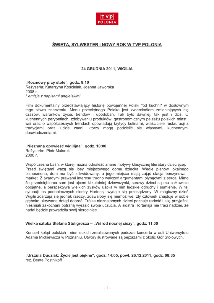ŚWIĘTA, SYLWESTER i NOWY ROK W TVP POLONIA 24 GRUDNIA 2011, WIGILIA „Rozmowy przy stole”, godz. 8:10 Reżyseria: Katarzyna Kościelak, Joanna Jaworska 2008 r. * emisja z napisami angielskimi Film dokumentalny przedstawiający historię powojennej Polski "od kuchni" w dosłownym tego słowa znaczeniu. Menu przeciętnego Polaka jest zwierciadłem zmieniających się czasów, warunków życia, trendów i upodobań. Tak było dawniej, tak jest i dziś. O kuchennych perypetiach, zdobywaniu produktów, gastronomicznym pejzażu polskich miast i wsi oraz o współczesnych trendach opowiadają krytycy kulinarni, właściciele restauracji z tradycjami oraz ludzie znani, którzy mogą podzielić się własnymi, kuchennymi doświadczeniami. „Nieznana opowieść wigilijna”, godz. 10:00 Reżyseria: Piotr Mularuk 2000 r. Współczesna baśń, w której można odnaleźć znane motywy klasycznej literatury dziecięcej. Przed świętami ważą się losy miejscowego domu dziecka. Wedle planów lokalnego biznesmena, dom ma być zlikwidowany, a jego miejsce mają zająć stacja benzynowa i market. Z twardymi prawami interesu trudno walczyć argumentami płynącymi z serca. Mimo że przedsiębiorca sam jest ojcem kilkuletniej dziewczynki, sprawy dzieci są mu całkowicie obojętne, a perspektywa wielkich zysków uśpiła w nim ludzkie odruchy i sumienie. W tej sytuacji los podopiecznych siostry Hortensji wydaje się przesądzony. W magiczny dzień Wigilii zdarzają się jednak rzeczy, zdawałoby się niemożliwe: zły człowiek znajduje w sobie głęboko ukrywaną dotąd dobroć. Trójka nieznajomych dzieci poznaje radość i siłę przyjaźni, nieśmiali zakochani potrafią wyrazić swoje uczucia. A siostra Hortensja nie traci nadziei, że nadal będzie prowadziła swój sierociniec. Wielka sztuka Stefana Stuligrosza – „Wśród nocnej ciszy”, godz. 11.00 Koncert kolęd polskich i niemieckich zrealizowanych podczas koncertu w auli Uniwersytetu Adama Mickiewicza w Poznaniu. Utwory ilustrowane są pejzażami z okolic Gór Stołowych. „Urszula Dudziak: Życie jest piękne”, godz. 14:05, powt. 26.12.2011, godz. 08:35 reż. Beata Postnikoff -1- Dokument przedstawiający legendę polskiego i światowego jazzu. Film opowiada o jej karierze, rodzinie, gwiazdach z którymi występowała na scenie, Ameryce i powrocie do Polski. Świąteczne „Smaki czasu z Karolem Okrasą”, godz. 14.50 Wydanie świąteczne programu. Tym razem do wspólnego przyrządzenia smakowitych dań Karol Okrasa zaprosił Kamilę i Andrzeja Łapickich. W programie prowadzący i goście poszukują ulubionego smaku - czasem to smak przeszłości, smak regionu, smak dzieciństwa, fascynacja kuchnią poznaną w podróży lub związana z najważniejszą osobą w życiu. Andrzej Łapicki opowie o swoim dzieciństwie spędzonym w Warszawie i o świątecznych zwyczajach kulinarnych bogatego przedwojennego domu. Daniem o jakie poprosi Andrzej Łapicki będzie śledź w śmietanie od takiego dania rozpoczynała się przedwojenna wigilia. Druga potrawa pierogi z pieczoną jagnięciną z sosem żurkowo ogórkowym powstanie specjalnie dla Kamili - żony Andrzeja Łapickiego. Kolęda w Pałacu Prezydenckim, godz. 15.35 Scenariusz i realizacja – Elżbieta Ruman Prowadzenie: Anna Czartoryska. W grudniowe popołudnie w pałacu prezydenckim spotkają się gwiazdy śpiewające kolędy, rodziny z dziećmi, wolontariusze Szlachetnej Paczki i dzieci z rodzinnych domów dziecka. Organizatorami i Gospodarzami wieczoru jest para Prezydencka we współpracy ze stowarzyszeniem Szlachetna Paczka – w finale koncertu Prezydent RP podziękuje wolontariuszom za pomoc dla tysięcy rodzin w Polsce i złoży świąteczne życzenia widzom i gościom zebranym w Sali kolumnowej Pałacu. Występują: Kayah, Piasek, Patrycja Markowska, Grzegorz Markowski, Halinka Młynkowa i Natalia Kukulska. Kulturalni PL, godz. 16:00 Autorzy: Anna Karna, Artur Orzech Karolina Bendera Specjalne wigilijne wydanie interaktywnego programu, w którym w lekkiej formie prowadzący rozmawiają z gośćmi i widzami na tematy interesujące wszystkich. Goście to odkrywcy, naukowcy, artyści, intelektualiści, ludzie z pierwszych stron gazet, a także najbardziej znane gwiazdy polskiej sceny muzycznej. Program informuje o wydarzeniach kulturalnych, artystycznych i społecznych z życia Polonii, zaprasza do udziału w imprezach rozrywkowych i sportowych, rekomenduje spektakle, wystawy i koncerty z udziałem polskich artystów. „Święta, święta”, godz. 18:05 Koncert świąteczny, w którym znani polscy wokaliści śpiewają świąteczne przeboje wybrane z repertuaru polskiego i światowego (te - z polskimi tekstami). W części pierwszej koncertu znajdą się m.in. przeboje Paula Mc Cartneya, Vanessy Williams, Franka Sinatry, Mariah Carey , Dolly Parton. Gospodarzem wieczoru jest Piotr Adamczyk, który będzie też rozmawiał z artystami na temat ich najciekawszych świątecznych wspomnień. -2- Dobranocka „Wigilia w lesie”, godz. 19:05/Dobranocka za oceanem, godz. 02:05 Polska 1996 Reżyseria: Stanisław Lenartowicz Scenariusz: Jarosław Hess, Maciej Pisuk, Ryszard M.Okuński W Wigilię Świąt Bożego Narodzenia mały Tomek wybiera się z dziadkiem do lasu. Oczarowany opowieściami leśnika chłopiec przenosi się w bajeczny świat, w którym wieczerzę wigilijną przygotowują zwierzęta. W trakcie tej fantastycznej wigilii w lesie dzieje się wiele tajemniczych i emocjonujących wydarzeń. Tomek ratuje bobra, który wpadł w pułapkę zastawioną przez ludzi. Jest także świadkiem odwiedzin króla zwierząt, lwa, przybywającego ze swoją świtą i prezentami z Afryki. Na koniec uczestniczy w uroczystej wieczerzy leśnych zwierząt. Gdy po przebudzeniu wraca do świata realnego, akurat rozpoczyna się wieczerza wigilijna u dziadków. W filmie połączono grę aktorską z animacją w scenach rozgrywających się w planie realnym występują aktorzy, sekwencje fantastyczne 