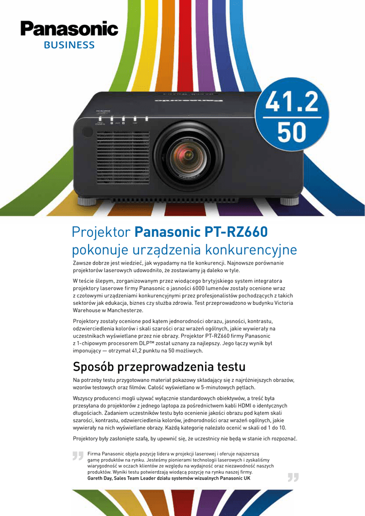 Projektor Panasonic PT-RZ660 pokonuje urządzenia konkurencyjne Zawsze dobrze jest wiedzieć, jak wypadamy na tle konkurencji. Najnowsze porównanie projektorów laserowych udowodniło, że zostawiamy ją daleko w tyle. W teście ślepym, zorganizowanym przez wiodącego brytyjskiego system integratora projektory laserowe firmy Panasonic o jasności 6000 lumenów zostały ocenione wraz z czołowymi urządzeniami konkurencyjnymi przez profesjonalistów pochodzących z takich sektorów jak edukacja, biznes czy służba zdrowia. Test przeprowadzono w budynku Victoria Warehouse w Manchesterze. Projektory zostały ocenione pod kątem jednorodności obrazu, jasności, kontrastu, odzwierciedlenia kolorów i skali szarości oraz wrażeń ogólnych, jakie wywierały na uczestnikach wyświetlane przez nie obrazy. Projektor PT-RZ660 firmy Panasonic z 1-chipowym procesorem DLP™ został uznany za najlepszy. Jego łączy wynik był imponujący — otrzymał 41,2 punktu na 50 możliwych. Sposób przeprowadzenia testu Na potrzeby testu przygotowano materiał pokazowy składający się z najróżniejszych obrazów, wzorów testowych oraz filmów. Całość wyświetlano w 5-minutowych pętlach. Wszyscy producenci mogli używać wyłącznie standardowych obiektywów, a treść była przesyłana do projektorów z jednego laptopa za pośrednictwem kabli HDMI o identycznych długościach. Zadaniem uczestników testu było ocenienie jakości obrazu pod kątem skali szarości, kontrastu, odzwierciedlenia kolorów, jednorodności oraz wrażeń ogólnych, jakie wywierały na nich wyświetlane obrazy. Każdą kategorię należało ocenić w skali od 1 do 10. „ Projektory były zasłonięte szafą, by upewnić się, że uczestnicy nie będą w stanie ich rozpoznać. Firma Panasonic objęła pozycję lidera w projekcji laserowej i oferuje najszerszą gamę produktów na rynku. Jesteśmy pionierami technologii laserowych i zyskaliśmy wiarygodność w oczach klientów ze względu na wydajność oraz niezawodność naszych produktów. Wyniki testu potwierdzają wiodącą pozycję na rynku naszej firmy. Gareth Day, Sales Team Leader działu systemów wizualnych Panasonic UK ” Istotne rezultaty Po zagorzałej debacie ogłoszono, że zdecydowanym zwycięzcą został projektor PT-RZ660 firmy Panasonic. Przedstawione poniżej rezultaty pokazują, że pokonał on nawet swoich najbliższych rywalami. Tym sposobem jeszcze raz udowodniliśmy wysoką jakość naszej technologii projekcyjnej. Skala szarości 8.1 6.9 4.8 A B Kontrast / jasność PT-RZ660 8.3 Odzwierciedlenie kolorów 8.2 6.8 5.4 A B 7.4 6.9 A B PT-RZ660 7.7 6.5 A B Jednorodność PT-RZ660 8.2 PT-RZ660 Ocena łączna Wrażenia ogólne 8.4 7.4 5.8 A B 41.2 PT-RZ660 Wyniki testów przykuwają uwagę również na wydajność systemów DLP w porównaniu z technologią LCD. Zarówno pod względem odzwierciedlenia kolorów, jak i jednorodności obrazu, projektory DLP wypały lepiej niż urządzenia LCD. PT-RZ660 36.2 29.4 A B Konkurent A Konkurent B Zwycięski projektor Projektor PT-RZ660 został opracowany pod kątem intensywnej eksploatacji i długotrwałej jasności z myślą o sektorze edukacyjnym, muzealniczym i wystawienniczym oraz zastosowaniach Digital Signage. Ten model stanowi kontynuację dążenia firmy Panasonic do doskonalszego odwzorowywania kolorów przy jednoczesnym minimalizowaniu efektów cieniowania. Wyświetla on obrazy wysokiej jakości i zapewnia jasność na poziomie 6000 lumenów (ANSI). Ponadto wyposażyliśmy go w podwójny moduł lasera, odporny na pył blok optyczny i mechanizm laserowy o dużej żywotności, dzięki czemu może pracować nawet przez 20 000 godzin bez potrzeby konserwacji. Chcesz poznać możliwości modelu PT-RZ660 na własne oczy? Szczegółowe informacje o teście porównawczym projektorów znajdziesz na stronie www.pureav.co.uk/laser-showcase Aby porozmawiać z przedstawicielem firmy Panasonic, zadzwoń pod numer +48 222112681, wyślij wiadomość e-mail na adres [email protected] lub odwiedź stronę business.panasonic.pl/systemy-wizualne/solid-shine-projekcja-laserowa