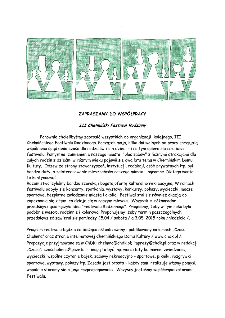 ZAPRASZAMY DO WSPÓŁPRACY III Chełmiński Festiwal Rodzinny Ponownie chcielibyśmy zaprosić wszystkich do organizacji kolejnego, III Chełmińskiego Festiwalu Rodzinnego. Początek maja, kilka dni wolnych od pracy sprzyjają wspólnemu spędzeniu czasu dla rodziców i ich dzieci - i na tym opiera sie cała idea festiwalu. Pomysł na zamienienie naszego miasta "plac zabaw" z licznymi atrakcjami dla całych rodzin z dziećmi w różnym wieku pojawił się dwa lata temu w Chełmińskim Domu Kultury. Odzew ze strony stowarzyszeń, instytucji, redakcji, osób prywatnych itp. był bardzo duży, a zainteresowanie mieszkańców naszego miasta - ogromne. Dlatego warto to kontynuować. Razem stworzyliśmy bardzo szeroką i bogatą ofertę kulturalno rekreacyjną. W ramach festiwalu odbyły się koncerty, spotkania, wystawy, konkursy, pokazy, wycieczki, mecze sportowe, bezpłatne zwiedzanie miasta i okolic. Festiwal stał się również okazją do zapoznania się z tym, co dzieje się w naszym mieście. Wszystkie różnorodne przedsięwzięcia łączyła idea “Festiwalu Rodzinnego". Pragniemy, żeby w tym roku było podobnie wesoło, rodzinnie i kolorowo. Proponujemy, żeby termin poszczególnych przedsięwzięć zawierał sie pomiędzy 25.04 / sobota / a 3.05. 2015 roku /niedziela /. Program festiwalu będzie na bieżąco aktualizowany i publikowany na łamach „Czasu Chełmna” oraz stronie internetowej Chełmińskiego Domu Kultury / www.chdk.pl /. Propozycje przyjmowane są w ChDK: [email protected]; [email protected] oraz w redakcji „Czasu”: czaschelmna@gazeta. - mogą to być np. warsztaty kulinarne, zwiedzanie, wycieczki, wspólne czytanie bajek, zabawy rekreacyjno - sportowe, pikniki, rozgrywki sportowe, wystawy, pokazy itp. Zasada jest prosta - każdy sam realizuje własny pomysł, wspólnie staramy sie o jego rozpropagowanie. Wszyscy jesteśmy współorganizatorami Festiwalu. Jak zawsze bardzo mile widziani są Sponsorzy: słodyczy, zabawek i innych upominków dla dzieci - zainteresowanych prosimy o kontakt z dyrektorem ChDK 608062239; [email protected]