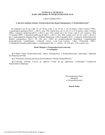 UCHWAŁA NR III/10/14 RADY MIEJSKIEJ W ŚWIĘTOCHŁOWICACH z dnia 9 grudnia 2014 r. w sprawie nadania Statutu „Środowiskowemu Domu Samopomocy w Świętochłowicach” Na podstawie art.18 ust. 2 pkt 15, art. 40 ust. 2 pkt 2, art. 41 ust. 1, art. 42 ustawy z dnia 8 marca 1990 r. o samorządzie gminnym (Dz.U. z 2013 r., poz. 594, z późn.zm.), art. 51, art. 51 a, 51 b ustawy z dnia 12 marca 2004 r. o pomocy społecznej (Dz.U. z 2013 r., poz. 182, z późń. zm.), art. 12 ust. 1 pkt 2 i ust. 2 ustawy z dnia 27 sierpnia 2009 r. o finansach publicznych (Dz.U. z 2013 r., poz. 885, z późń. zm.), §3 ust. 1 pkt 1, §4 ust.1 pkt 1 rozporządzenia Ministra Pracy i Polityki Społecznej z dnia 9 grudnia 2010 r. w sprawie środowiskowych domów samopomocy (Dz.U. Nr 238, poz. 1586), po przeprowadzeniu konsultacji z organizacjami pozarządowymi i podmiotami, o których mowa w art. 3 ust. 3 ustawy z dnia 24 kwietnia 2003 r. o działalności pożytku publicznego i o wolontariacie (Dz. U. z 2010 r., Nr 234, poz. 1536, z późń. zm.) Rada Miejska w Świętochłowicach uchwala, co następuje: § 1. Nadać Statut Środowiskowemu Domu Samopomocy w Świętochłowicach stanowiący załącznik do niniejszej uchwały. § 2. Wykonanie uchwały powierza się Prezydentowi Miasta Świętochłowice. § 3. Uchwała wchodzi w życie po upływie 14 dni od jej ogłoszenia w Dzienniku Urzędowym Województwa Śląskiego. Przewodniczący Rady Miejskiej w Świętochłowicach Marek Palka Id: AF0E5A39-61F2-48FF-B959-4E3AC0F2D2AC. Podpisany Załącznik do Uchwały Nr III/10/14 Rady Miejskiej w Świętochłowicach z dnia 9 grudnia 2014 r. Statut Środowiskowego Domu Samopomocy dla Osób Przewlekle Psychicznie Chorych w Świętochłowicach § 1. 1. Środowiskowy Dom Samopomocy dla Osób Przewlekle Psychicznie Chorych zwany dalej Domem jest jednostką organizacyjną Miasta Świętochłowice, działającą w formie jednostki budżetowej. 2. Środowiskowy Dom Samopomocy dla Osób Przewlekle Psychicznie Chorych w Świętochłowicach zwany dalej Domem działa na podstawie obowiązującego prawa, a w szczególności w oparciu o następujące przepisy: 1) ustawy o pomocy społecznej, 2) ustawy o ochronie zdrowia psychicznego i przepisów wykonawczych wydanych na jej podstawie, 3) ustawy o samorządzie gminnym, 4) ustawy o pracownikach samorządowych i przepisów wykonawczych wydanych na jej podstawie, 5) ustawy o rachunkowości, 6) ustawy o finansach publicznych i przepisów wykonawczych wydanych na jej podstawie, 7) rozporządzenia Ministra Pracy i Polityki Społecznej w sprawie środowiskowych domów samopomocy. 3. Siedzibą Domu jest miasto Świętochłowice, ul. Karpacka 3. 4. Nadzór nad działalnością Domu sprawują organy administracji rządowej i samorządowej w zakresie swoich kompetencji. § 2. 1. Dom jest placówką świadczącą wsparcie dla osób przewlekle psychicznie chorych, które wymagają pomocy do życia w środowisku rodzinnym i społecznym. Prowadzone działania terapeutyczne polegają w szczególności na nauce, rozwijaniu i podtrzymywaniu umiejętności w zakresie czynności dnia codziennego oraz funkcjonowania w życiu społecznym. 2. Dom świadczy następujący zakres usług: 1) trening funkcjonowania w codziennym życiu w tym: a) trening higieniczny i dbałości o wygląd zewnętrzny, b) trening budżetowy, c) trening kulinarny, d) trening umiejętności praktycznych, e) trening lekowy, 2) trening umiejętności interpersonalnych i rozwiązywania problemów, w tym: a) kształtowanie pozytywnych relacji uczestnika z osobami bliskimi, b) kształtowanie pozytywnych relacji uczestnika z sąsiadami, z innymi osobami, w czasie zakupów, w środkach komunikacji publicznej, w urzędach, itp. 3) trening umiejętności spędzania czasu wolnego, w tym: a) rozwijanie zainteresowań literaturą, b) audycjami radiowymi, telewizyjnymi, internetem, Id: AF0E5A39-61F2-48FF-B959-4E3AC0F2D2AC. Podpisany c) udział w spotkaniach towarzyskich, kulturalnych, itp. 4) poradnictwo psychologiczne, 5) pomoc w załatwianiu spraw urzędowych, 6) pomoc w dostępie do niezbędnych świadczeń zdrowotnych, 7) niezbędną opiekę, 8) terapię ruchową w tym: a) zajęcia sportowe, b) turystykę i rekreację, 9) całodobowe wyżywienie dla uczestników skierowanych na pobyt całodobowy w formie posiłków lub produktów żywnościowych do przygotowania posiłków przez uczestnika, 10) terapię zajęciowa, 11) psychoedukację, 12) inne formy postępowania przygotowujące do uczestnictwa w warsztatach terapii zajęciowej lub podjęcia zatrudnienia, w tym w warunkach pracy chronionej na przystosowanym rynku pracy. 3. Dom umożliwia uczestnikom skierowanym na pobyt dzienny spożywanie gorącego posiłku, przyznanego w ramach zadania własnego gminy, o którym mowa w ustawie o pomocy społecznej, lub w ramach treningu kulinarnego. § 3. 1. Celem działalności Domu jest: 1) promocja zdrowia psychicznego, 2) zapobieganie zaburzeniom psychicznym, 3) upowszechnienie wiedzy na temat zdrowia psychicznego, 4) kształtowanie wobec osób z zaburzeniami psychicznymi i ich rodzin właściwych postaw społecznych, zwłaszcza zrozumienia, tolerancji, życzliwości, a także przeciwdziałanie ich dyskryminacji oraz negatywnemu zjawisku stygmatyzacji osób chorych psychicznie, 5) zwiększenie integracji społecznej (uczestników) osób z zaburzeniami psychicznymi, uaktywnienie środowiska lokalnego w tym zakresie, 6) aktywizacja zawodowa (uczestników) osób zaburzonych psychicznie. 2. Dom realizując powyższe cele współpracuje z: 1) rodzinami, 2) opiekunami i innymi osobami bliskimi, 3) ośrodkiem pomocy społecznej, 4) poradnią zdrowia psychicznego, 5) oddziałem psychiatrycznym, innymi zakładami opieki zdrowotnej, 6) organizacjami pozarządowymi, 7) kościołami i związkami wyznaniowymi, 8) powiatowym urzędem pracy, 9) ośrodkami kultury, organizacjami kulturalno-rozrywkowymi, placówkami oświatowymi oraz innymi jednostkami świadczącymi usłu
