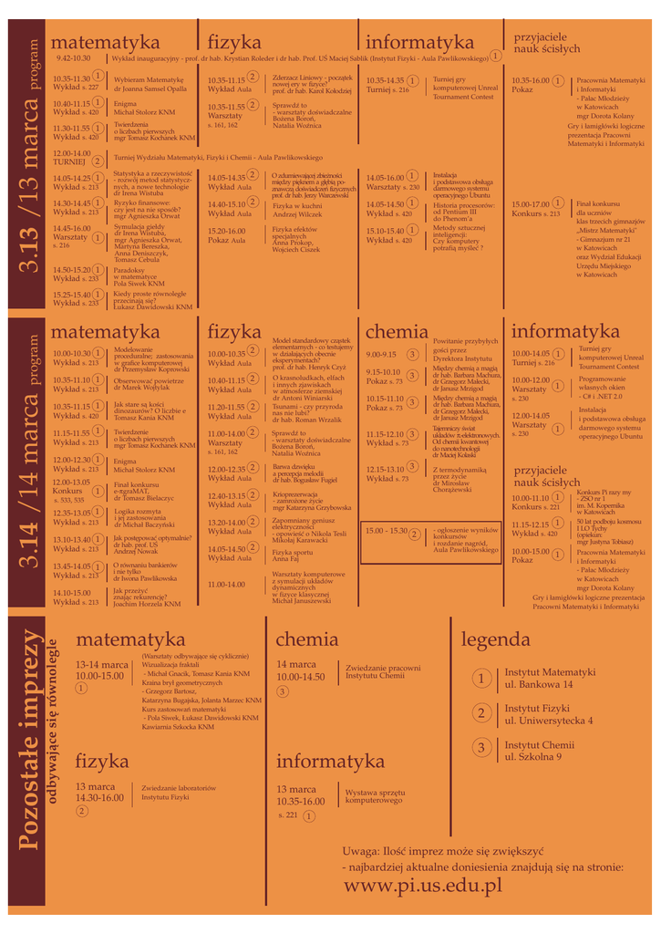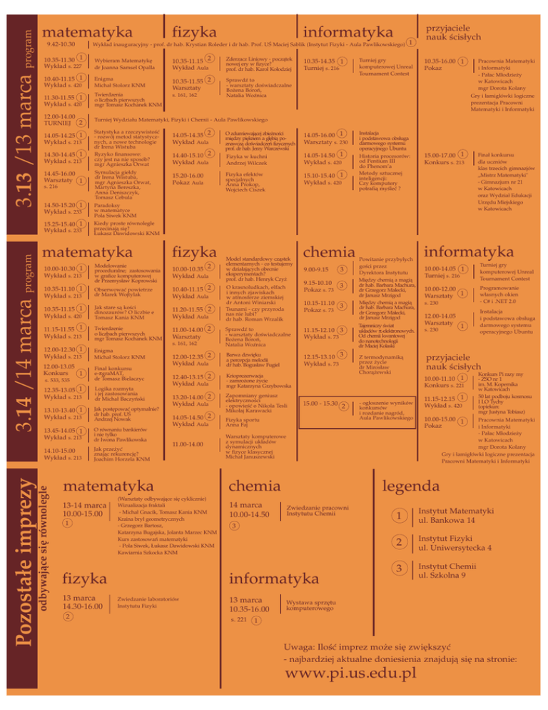 9.42-10.30 fizyka informatyka Wyk³ad inauguracyjny - prof. dr hab. Krystian Roleder i dr hab. Prof. UŒ Maciej Sablik (Instytut Fizyki - Aula Pawlikowskiego) 10.35-11.30 1 Wyk³ad s. 227 Wybieram Matematykê dr Joanna Samsel Opalla 10.35-11.15 2 Wyk³ad Aula Zderzacz Liniowy - pocz¹tek nowej ery w fizyce? prof. dr hab. Karol Ko³odziej 10.40-11.15 1 Wyk³ad s. 420 Enigma Micha³ Stolorz KNM 10.35-11.55 2 Warsztaty 11.30-11.55 1 Wyk³ad s. 420 Twierdzenia o liczbach pierwszych mgr Tomasz Kochanek KNM s. 161, 162 SprawdŸ to - warsztaty doœwiadczalne Bo¿ena Boroñ, Natalia WoŸnica 12.00-14.00 TURNIEJ 2 14.05-14.25 1 Wyk³ad s. 213 14.30-14.45 1 Wyk³ad s. 213 s. 216 Symulacja gie³dy dr Irena Wistuba, mgr Agnieszka Orwat, Martyna Bereszka, Anna Deniszczyk, Tomasz Cebula 14.50-15.20 1 Wyk³ad s. 233 Paradoksy w matematyce Pola Siwek KNM 15.25-15.40 1 Wyk³ad s. 233 Kiedy proste równoleg³e przecinaj¹ siê? £ukasz Dawidowski KNM matematyka 14.05-14.35 2 Wyk³ad Aula 14.40-15.10 2 Wyk³ad Aula 15.20-16.00 Pokaz Aula fizyka 10.00-10.30 1 Wyk³ad s. 213 Modelowanie proceduralne; zastosowania w grafice komputerowej dr Przemys³aw Koprowski 10.00-10.35 2 10.35-11.10 1 Wyk³ad s. 213 Obserwowaæ powietrze dr Marek Wojtylak 10.40-11.15 2 Wyk³ad Aula 10.35-11.15 1 Wyk³ad s. 420 Jak stare s¹ koœci dinozaurów? O liczbie e Tomasz Kania KNM 11.20-11.55 2 Wyk³ad Aula 11.15-11.55 1 Wyk³ad s. 213 Twierdzenie o liczbach pierwszych mgr Tomasz Kochanek KNM 11.00-14.00 2 Warsztaty 12.00-12.30 1 Wyk³ad s. 213 Enigma Micha³ Stolorz KNM 12.00-13.05 Konkurs 1 s. 533, 535 Fina³ konkursu e-pgraMAT, dr Tomasz Bielaczyc 12.35-13.05 1 Wyk³ad s. 213 Logika rozmyta i jej zastosowania dr Micha³ Baczyñski 13.10-13.40 1 Wyk³ad s. 213 Jak postêpowaæ optymalnie? dr hab. prof. UŒ Andrzej Nowak 13.45-14.05 1 Wyk³ad s. 213 O równaniu bankierów i nie tylko dr Iwona Pawlikowska 14.10-15.00 Wyk³ad s. 213 Jak prze¿yæ znaj¹c rekurencjê? Joachim Horzela KNM Wyk³ad Aula Turniej gry komputerowej Unreal Tournament Contest 10.35-16.00 1 Pokaz Pracownia Matematyki i Informatyki - Pa³ac M³odzie¿y w Katowicach mgr Dorota Kolany Gry i ³amig³ówki logiczne prezentacja Pracowni Matematyki i Informatyki 13-14 marca 10.00-15.00 1 Fizyka w kuchni Andrzej Wilczek 14.05-16.00 1 Warsztaty s. 230 Instalacja i podstawowa obs³uga darmowego systemu operacyjnego Ubuntu 14.05-14.50 1 Wyk³ad s. 420 Historia procesorów: od Pentium III do Phenom'a Metody sztucznej inteligencji: Czy komputery potrafi¹ myœleæ ? 15.10-15.40 1 Wyk³ad s. 420 Fizyka efektów specjalnych Anna Prokop, Wojciech Ciszek Model standardowy cz¹stek elementarnych - co testujemy w dzia³aj¹cych obecnie eksperymentach? prof. dr hab. Henryk Czy¿ O krasnoludkach, elfach i innych zjawiskach w atmosferze ziemskiej dr Antoni Winiarski Tsunami - czy przyroda nas nie lubi? dr hab. Roman Wrzalik chemia 9.00-9.15 3 9.15-10.10 3 Pokaz s. 73 10.15-11.10 3 Pokaz s. 73 11.15-12.10 3 Wyk³ad s. 73 s. 161, 162 12.00-12.35 2 Wyk³ad Aula Barwa dzwiêku a percepcja melodii dr hab. Bogus³aw Fugiel 12.15-13.10 3 Wyk³ad s. 73 12.40-13.15 2 Wyk³ad Aula Krioprezerwacja - zamro¿one ¿ycie mgr Katarzyna Grzybowska 13.20-14.00 2 Wyk³ad Aula Zapomniany geniusz elektrycznoœci - opowieœæ o Nikola Tesli Miko³aj Karawacki 14.05-14.50 2 Wyk³ad Aula 11.00-14.00 (Warsztaty odbywaj¹ce siê cyklicznie) Wizualizacja fraktali - Micha³ Gnacik, Tomasz Kania KNM Kraina bry³ geometrycznych - Grzegorz Bartosz, Katarzyna Bugajska, Jolanta Marzec KNM Kurs zastosowañ matematyki - Pola Siwek, £ukasz Dawidowski KNM Kawiarnia Szkocka KNM fizyka 13 marca 14.30-16.00 O zdumiewaj¹cej zbie¿noœci miêdzy piêknem a g³êbi¹ poznawcz¹ doœwiadczeñ fizycznych prof. dr hab. Jerzy Warczewski SprawdŸ to - warsztaty doœwiadczalne Bo¿ena Boroñ, Natalia WoŸnica matematyka 2 10.35-14.35 1 Turniej s. 216 1 przyjaciele nauk œcis³ych Turniej Wydzia³u Matematyki, Fizyki i Chemii - Aula Pawlikowskiego Statystyka a rzeczywistoœæ - rozwój metod statystycznych, a nowe technologie dr Irena Wistuba Ryzyko finansowe: czy jest na nie sposób? mgr Agnieszka Orwat 14.45-16.00 Warsztaty 1 odbywaj¹ce siê równolegle 3.13 /13 marca program 3.14 /14 marca program Pozosta³e imprezy matematyka Tajemniczy œwiat uk³adów p.-elektronowych. Od chemii kwantowej do nanotechnologii dr Maciej Kolaski Z termodynamik¹ przez ¿ycie dr Miros³aw Chor¹¿ewski 15.00 - 15.30 2 Fizyka sportu Anna Faj - og³oszenie wyników konkursów i rozdanie nagród, Aula Pawlikowskiego 10.00-14.05 1 Turniej s. 216 Turniej gry komputerowej Unreal Tournament Contest 10.00-12.00 Warsztaty 1 Programowanie w³asnych okien - C# i .NET 2.0 s. 230 12.00-14.05 Warsztaty s. 230 14 marca 10.00-14.50 11.15-12.15 1 Wyk³ad s. 420 s. 221 Konkurs Pi razy my - ZSO nr 1 im. M. Kopernika w Katowicach 50 lat podboju kosmosu I LO Tychy (opiekun: mgr Justyna Tobiasz) 10.00-15.00 1 Pokaz Pracownia Matematyki i Informatyki - Pa³ac M³odzie¿y w Katowicach mgr Dorota Kolany Gry i ³amig³ówki logiczne prezentacja Pracowni Matematyki i Informatyki legenda Zwiedzanie pracowni Instytutu Chemii 1 Instytut Matematyki ul. Bankowa 14 2 Instytut Fizyki ul. Uniwersytecka 4 3 Instytut Chemii ul. Szkolna 9 3 13 marca 10.35-16.00 1 Instalacja i podstawowa obs³uga darmowego systemu operacyjnego Ubuntu przyjaciele nauk œcis³ych Warsztaty komputerowe z symulacji uk³adów dynamicznych w fizyce klasycznej Micha³ Januszewski chemia Fina³ konkursu dla uczniów klas trzecich gimnazjów ,,Mistrz Matematyki" - Gimnazjum nr 21 w Katowicach oraz Wydzia³ Edukacji Urzêdu Miejskiego w Katowicach informatyka 10.00-11.10 1 Konkurs s. 221 informatyka Zwiedzanie laboratoriów Instytutu Fizyki Powitanie przyby³ych goœci przez Dyrektora Instytutu Miêdzy chemi¹ a magi¹ dr hab. Barbara Machura, dr Grzegorz Ma³ecki, dr Janusz Mrzigod Miêdzy chemi¹ a magi¹ dr hab. Barbara Machura, dr Grzegorz Ma³ecki, dr Janusz Mrzigod 15.00-17.00 1 Konkurs s. 213 Wystawa