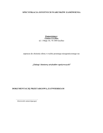 SPECYFIKACJA ISTOTNYCH WARUNKÓW ZAMÓWIENIA Zamawiający: Gmina Gryfino ul. 1 Maja 16; 74-100 Gryfino zaprasza do złożenia oferty w trybie przetargu nieograniczonego na: „Zakup i dostawę artykułów spożywczych” DOKUMENTACJĘ PRZETARGOWĄ ZATWIERDZAM ................................................... (kierownik zamawiającego) I. NAZWA ORAZ ADRES ZAMAWIAJĄCEGO Gmina Gryfino ul. 1 Maja 16; 74-100 Gryfino fax (91) 416 27 02 II. TRYB UDZIELENIA ZAMÓWIENIA Postępowanie o udzielenie zamówienia publicznego prowadzone jest w trybie przetargu nieograniczonego z zachowaniem zasad określonych ustawą z dnia 29 stycznia 2004 r. Prawo zamówień publicznych (Dz.U. z 2010 r. Nr 113, poz. 759 z późniejszymi zmianami), wydanymi na jej podstawie aktami wykonawczymi oraz w sprawach nieuregulowanych przepisami ustawy Prawo zamówień publicznych – przepisami ustawy Kodeks cywilny. III. OPIS PRZEDMIOTU ZAMÓWIENIA 1. Przedmiotem zamówienia jest zakup i dostawa artykułów spożywczych dla potrzeb Urzędu Miasta i Gminy w Gryfinie, funduszu sołeckiego i innych organizacji. KOD CPV 15860000-4 Kawa, herbata i podobne produkty 15981000-8 Wody mineralne 15321000-4 Soki owocowe 15982000-5 Napoje orzeźwiające 15500000-3 Produkty mleczarski 15842000-2 Czekolada i wyroby cukiernicze 15870000-7 Przyprawy i przyprawy korzenne 15830000-5 Cukier i produkty pokrewne 15241200-1 Śledź przetworzony lub konserwowy 15612100-2 Mąka pszenna 15872400-5 Sól 15331425-2 Przecier pomidorowy 15811000-6 Pieczywo 15411000-2 Oleje zwierzęce lub roślinne 15600000-4 Produkty przemiału ziarna, skrobi i produktów skrobiowych 15898000-9 Drożdże 15899000-6 Proszek do pieczenia 03222210-8 Cytryny 03142500-3 Jaja 15330000-0 Przetworzone owoce i warzywa 15110000-2 Mięso 2. Zamawiający dopuszcza składanie ofert częściowych. Oferta częściowa musi zawierać minimum jedną z poniższych części: a) grupa I - pieczywo, wyroby cukiernicze, artykuły zbożowe i sypkie, nabiał, mleko i wyroby mleczarskie, napoje orzeźwiające, przetwory, koncentraty, przyprawy i inne artykuły spożywcze, b) grupa II - mięso i wędliny. 3. Zamawiający będzie zamawiał u Wykonawcy raz na miesiąc lub doraźnie wybrane artykuły spożywcze na podstawie warunków określonych w niniejszej umowie. 4. Wykonawca zobowiązuje się zrealizować zamówienie w ciągu trzech dni od dnia pisemnego złożenia zamówienia, a w przypadku zamówienia telefonicznego - 2 w ciągu 24 godzin. Zamówienie telefoniczne zostanie potwierdzone na piśmie przez Zamawiającego. 5. Zakres zamówienia: a) grupa I - pieczywo, wyroby cukiernicze, artykuły zbożowe i sypkie, nabiał, mleko i wyroby mleczarskie, napoje orzeźwiające, przetwory, koncentraty, przyprawy i inne artykuły spożywcze Urząd Miasta i Gminy w Gryfinie LP. 1 2 3 4 5 6 7 8 9 10 11 12 13 14 NAZWA PRODUKTU Kawa rozpuszczalna NESCAFE Classic nie mniej niż 100 g / op. (lub równoważne) Kawa rozpuszczalna NESCAFE Classic nie mniej niż 200 g / op. (lub równoważne) Kawa rozpuszczalna VELVET Jacobs nie mniej niż 100 g / op. (lub równoważne) Kawa rozpuszczalna VELVET Jacobs nie mniej niż 200 g / op. (lub równoważne) Kawa rozpuszczalna JACOBS CRONAT GOLD nie mniej niż 200 g / op. (lub równoważne) Kawa rozpuszczalna MK CAFE Premium nie mniej niż 75 g/op. (lub rownoważne) Kawa naturalna MK CAFE Premium drobno mielona nie mniej niż 80 g / op. (lub równoważne) Kawa LAVAZZA QUALITA ROSSA nie mniej niż 1 kg/op (lub równoważny) Herbata ekspresowa LIPTON nie mniej niż 25 torebek / op. (lub równoważne) Herbata ekspresowa CEYLON GOLD (Dilmah) nie mniej niż 100 torebek / op. (lub równoważny) Herbata czarna ekspresowa SAGA nie mniej niż 50 torebek/op. (lub równoważne) Herbata - MALINA - Herbapol nie mniej niż 20 torebek/op. (lub równoważny) Herbata - MIĘTA - Herbapol nie mniej niż 20 torebek/op. (lub równoważny) Herbata GRUNPOWDER ZIELONA, liściasta - nie mniej niż 100 g/op. BIOACTIVE (lub równoważny) PU-ERH - chińska herbata czerwona 80 g/op. - nie mniej niż 40 torebek/op. (lub równoważny) Herbata IRVING zielona malinowa nie mniej niż 20 torebek/op. 16 (lub równoważne) 17 Miód wielokwiatowy 0,90/słoik 15 ILOŚĆ 80 szt. 4 szt. 140 szt. 2 szt. 11 szt. 15 szt. 142 op. 80 op. 170 op. 20 op. 12 op. 66 op. 60 op. 50 op. 60 op. 30 op. 12 szt. 3 LP. NAZWA PRODUKTU 18 Cukier ILOŚĆ 87 kg 19 Mleko 3,2% 1 l. 289 litr 20 Śmietanka jednorazowa nie mniej niż 10 szt./op. 180 op. 21 Śmietanka jednorazowa nie mniej niż 200 szt./op. 20 op. 22 Cremona Śmietankowa Classic nie mniej niż 400 g (lub równoważne) 10 szt. 23 Cytryny 68 kg 24 Woda mineralna niegazowana ŻYWIEC ZDRÓJ 0,5 l. (lub równoważne) 4500 szt. 25 Woda mineralna gazowana ŻYWIEC ZDRÓJ 0,5 l. (lub równoważne) 4500 szt. 26 Woda mineralna gazowana CISOWIANKA 0,5 l. (lub równoważne) 1086 szt. 27 Woda mineralna niegazowana CISOWIANKA 0,5 l. (lub równoważne) 1636 szt. 28 Sok wieloowocowy 100% bez cukru 1 l. 9 szt. 29 Sok pomarańczowy 100 %, bez cukru 1 l. 71 szt. 30 Sok grejpfrutowy 100 %, bez cukru 1 l. 67 szt. 31 Sok jabłkowy 100%, bez cukru 1 l. 71 szt. 32 Napój niegazowany w kartoniku (różne smaki) nie mniej niż 200 ml 50 szt. 33 34 35 36 37 38 57 kg 46 kg 42 kg 61 kg 41 kg 44 kg Pierniki z nadzieniem owocowym w polewie czekoladowej Ciastka kruche owsiane Słomka mini KARWIT 1 kg/op. (lub równoważne) Markizy różne smaki Serca w czekoladzie Wafle o smakach: waniliowe, orzechowe, owocowe 39 Wafle w polewie czekoladowej 46 kg 40 Biszkopty z galaretką owocową 41 Herbatniki szkolne z galaretką o smaku pomarańczy z polewą czekoladową 42 Galaretka z polewą czekoladową 21 kg 6 kg 44 kg 43 Pianka z polewą czekoladową 3 kg 44 Ptasie mleczko waniliowe 44 kg 45 Karmelki nadziewane limonką z witaminą C 30 kg 46 Karmelki miętowe 50 kg 47 Cukierki musujące Fizzy ZOZOLE MIESZKO (lub równoważne) 2 kg 48 Cukierki Mieszanka Teatralna GOPLANA LUZ (lub równoważne) 5 kg 49 Cukierki 