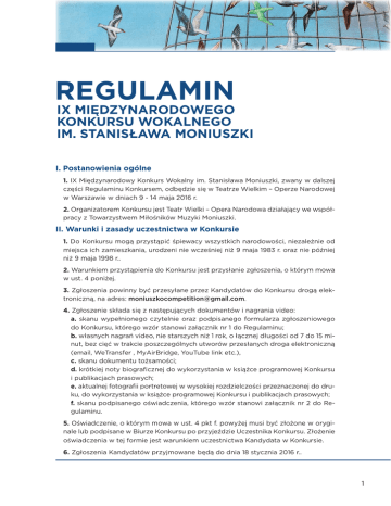 REGULAMIN IX MIĘDZYNARODOWEGO KONKURSU WOKALNEGO IM. STANISŁAWA MONIUSZKI I. Postanowienia ogólne 1. IX Międzynarodowy Konkurs Wokalny im. Stanisława Moniuszki, zwany w dalszej części Regulaminu Konkursem, odbędzie się w Teatrze Wielkim – Operze Narodowej w Warszawie w dniach 9 - 14 maja 2016 r. 2. Organizatorem Konkursu jest Teatr Wielki – Opera Narodowa działający we współpracy z Towarzystwem Miłośników Muzyki Moniuszki. II. Warunki i zasady uczestnictwa w Konkursie 1. Do Konkursu mogą przystąpić śpiewacy wszystkich narodowości, niezależnie od miejsca ich zamieszkania, urodzeni nie wcześniej niż 9 maja 1983 r. oraz nie później niż 9 maja 1998 r.. 2. Warunkiem przystąpienia do Konkursu jest przysłanie zgłoszenia, o którym mowa w ust. 4 poniżej. 3. Zgłoszenia powinny być przesyłane przez Kandydatów do Konkursu drogą elektroniczną, na adres: [email protected]. 4. Zgłoszenie składa się z następujących dokumentów i nagrania video: a. skanu wypełnionego czytelnie oraz podpisanego formularza zgłoszeniowego do Konkursu, którego wzór stanowi załącznik nr 1 do Regulaminu; b. własnych nagrań video, nie starszych niż 1 rok, o łącznej długości od 7 do 15 minut, bez cięć w trakcie poszczególnych utworów przesłanych droga elektroniczną (email, WeTransfer , MyAirBridge, YouTube link etc.), c. skanu dokumentu tożsamości; d. krótkiej noty biograficznej do wykorzystania w książce programowej Konkursu i publikacjach prasowych; e. aktualnej fotografii portretowej w wysokiej rozdzielczości przeznaczonej do druku, do wykorzystania w książce programowej Konkursu i publikacjach prasowych; f. skanu podpisanego oświadczenia, którego wzór stanowi załącznik nr 2 do Regulaminu. 5. Oświadczenie, o którym mowa w ust. 4 pkt f. powyżej musi być złożone w oryginale lub podpisane w Biurze Konkursu po przyjeździe Uczestnika Konkursu. Złożenie oświadczenia w tej formie jest warunkiem uczestnictwa Kandydata w Konkursie. 6. Zgłoszenia Kandydatów przyjmowane będą do dnia 18 stycznia 2016 r.. 1 Regulamin 7. Decyzję w sprawie zakwalifikowania Kandydata do udziału w Konkursie podejmie Komisja Kwalifikacyjna, na podstawie analizy nagrania i dokumentów wymienionych w ust.4. 8. Kandydaci zostaną poinformowani o decyzji Komisji Kwalifikacyjnej do dnia 26 lutego 2016 r. drogą elektroniczną. 9. Laureaci ostatnich edycji konkursów: Międzynarodowego Konkursu Wokalnego im. Francisca Viñasa, Międzynarodowego Konkursu im. Piotra Czajkowskiego, Międzynarodowego Konkursu Wokalnego im. Marcelli Sembrich - Kochańskiej, Konkursu Wokalnego Le Grand Prix de l’Opéra, Konkursu Wokalnego im. Leyli Gencer, Międzynarodowego Konkursu Sztuki Wokalnej im. Ady Sari, Międzynarodowego Konkursu Wokalnego NEUE STIMMEN, Międzynarodowego Konkursu Wokalnego w ‘s-Hertogenbosch, Konkursu Królowej Elżbiety, zostaną automatycznie zakwalifikowani do I etapu Konkursu, pod warunkiem przesłania zgłoszenia do dnia 18 stycznia 2016 r.. 10. Warunkiem uczestnictwa zakwalifikowanego Kandydata w Konkursie jest wniesienie do dnia 10 marca 2016 r. opłaty wpisowej w wysokości 80 EUR lub 320 PLN. Wpłaty należy przesyłać na konto: Dane do przelewów krajowych: Teatr Wielki – Opera Narodowa Bank Gospodarstwa Krajowego 73 1130 1017 0020 1462 7820 0002 (z dopiskiem: Konkurs Moniuszkowski) Dane do przelewów zagranicznych: Teatr Wielki – Opera Narodowa Bank Gospodarstwa Krajowego IBAN: PL73113010170020146278200002 KOD BIC: GOSKPLPW (z dopiskiem: Konkurs Moniuszkowski) 11. Zawiadomienie Kandydata o zakwalifikowaniu do Konkursu i opłacenie przez Kandydata wpisowego będzie równoznaczne z zawarciem umowy między Organizatorem Konkursu a Kandydatem w sprawie udziału w Konkursie na warunkach określonych niniejszym Regulaminem, oraz uzyskaniem przez Kandydata statusu Uczestnika Konkursu (zwanego dalej Uczestnikiem). 12. Organizator Konkursu zapewni Uczestnikom zakwaterowanie na koszt Organizatora w następujących terminach: a. Uczestnikom I etapu Konkursu – w dniach 8 - 11 maja 2016 r., b. Wszystkim uczestnikom zakwalifikowanym do II etapu Konkursu – w dniach 8 - 15 maja 2016 r. – do końca trwania konkursu. 13. Organizator Konkursu zapewnia Uczestnikom zwrot poniesionych kosztów podroży: a. do kwoty 400,- PLN w przypadku podróży w obrębie Rzeczpospolitej Polskiej, b. do kwoty 200,- EUR w przypadku podróży z pozostałych krajów Europy, c. do kwoty 400,- EUR w przypadku podróży międzykontynentalnych. 14. Koszty, o których mowa w ust. 13 zostaną zwrócone pod warunkiem przedłożenia w Biurze Konkursu biletów dokumentujących podróż Uczestnika na Konkurs. Bilety opłacone w walucie EUR będą refundowane przez Organizatora w EUR, a opłacone w walucie PLN będą refundowane w PLN. 2 Regulamin 15. Organizator zapewni i opłaci akompaniatorów dla wszystkich Uczestników. Uczestnik może wziąć udział w Konkursie z własnym akompaniatorem, ale zakwaterowanie i podroż akompaniatora, oraz jego honorarium winny być opłacone przez Uczestnika. 16. Uczestnik przenosi na Organizatora nieodpłatnie prawa pokrewne do artystycznych wykonań podczas jego udziału w Konkursie zgodnie z oświadczeniem, o którym mowa w części II ust. 4 pkt f Regulaminu. 17. Organizator nie jest zobowiązany do ubezpieczenia Uczestnika od następstw nieszczęśliwych wypadków oraz choroby, nie jest także zobowiązany do ubezpieczenia od utraty lub zniszczenia bagażu Uczestnika. III. Harmonogram i miejsce Konkursu 1. Harmonogram Konkursu jest następujący: 21 marca 2016r. losowanie i ogłoszenie kolejności przesłuchań 8 maja 2016 r. Otwarcie Konkursu 9-10 maja 2016 r. I etap 11-12 maja 2016 r. II etap 14 maja 2016 r. III etap, ogłoszenie wyników, ceremonia wręczenia nagród 2. Konkurs odbędzie się w następujących miejscach: I i II etap – w Sali Kameralnej Teatru Wielkiego – Opery Narodowej III etap – w Sali im. Stanisława Moniuszki Teatru Wielki