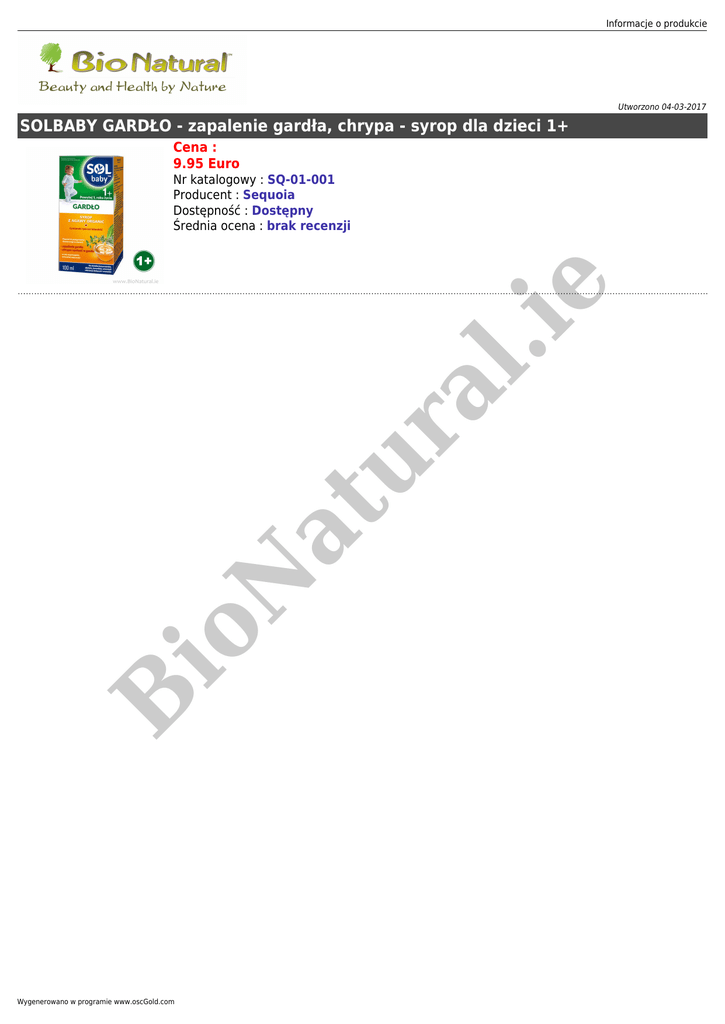 Informacje o produkcie Utworzono 04-03-2017 SOLBABY GARDŁO - zapalenie gardła, chrypa - syrop dla dzieci 1+ Cena : 9.95 Euro B io N at ur al .ie Nr katalogowy : SQ-01-001 Producent : Sequoia Dostępność : Dostępny Średnia ocena : brak recenzji Wygenerowano w programie www.oscGold.com SOLbaby GARDŁO to preparat do postępowania dietetycznego w sytanach zapalenie gardła, chrypy i suchości w gardle w celu wspomagania naturalnej odporności. Preparat przeznaczony jest dla dzieci powyżej 1-go roku życia. Opakowanie: 100ml Wskazania - SOLbaby GARDŁO to naturalnie gęsty i słodki syrop stworzony specjalnie dla dzieci już powyżej 1. roku życia. - Kompozycja specjalnie dobranych składników, które pomagają podrażnionemu gardłu, działają łagodząco i nawilżająco. - Skuteczność działania składników została potwierdzona wieloma publikacjami naukowymi. Składniki aktywne: SOLbaby GARDŁO zawiera: Syrop z agawy organic (83%), który pokrywa i łagodzi podrażnioną śluzówkę gardła, a także, dzięki zwiększonej gęstości, przedłuża miejscowe działanie pozostałych składników syropu. Syrop jest produkowany z agawy organic pochodzącej z certyfikowanych upraw. .ie Ekstrakt z tymianku, który ma działanie antyoksydacyjne, co wpływa na jego aktywność przeciwzapalną. Ekstrakt z porostu islandzkiego, który łagodzi podrażnienia i nawilża błonę śluzową górnych dróg oddechowych. Ponadto ma naturalne działanie antyoksydacyjne. Ekstrakt z aceroli bogate, naturalne źródło witaminy C, która jest konieczna do prawidłowego funkcjonowania układu odpornościowego. Dodatkowo witamina C wpływa kojąco na gardło. Witaminę A, która pomaga w utrzymaniu prawidłowego stanu błon śluzowych. al Ekstrakt z szałwii, który ma działanie antyoksydacyjne. Ekstrakt z mięty, który zawiera substancje eteryczne korzystnie wpływające na oddychanie. Dodatkowo pozostawia uczucie świeżości. ur Składniki: syrop z agawy (83%), ekstrakt z porostu islandzkiego, ekstrakt z szałwii, ekstrakt z tymianku, witamina A, ekstrakt z aceroli (witamina C), ekstrakt z mięty pieprzowej, rozmaryn. Sposób użycia: Stosować 2,5 ml 3-4 razy dziennie. N at W zależności od indywidualnego zapotrzebowania lekarz może wskazać inną porcję do dziennego spożycia. Wstrząsnąć przed użyciem. Syrop należy spożyć bezpośrednio doustnie. Nie należy mieszać preparatu z innymi płynami. Nie należy popijać bezpośrednio po spożyciu. Do produktu dołączona jest strzykawka pozwalająca na precyzyjne podawanie syropu. Jeżeli zapaleniu gardła towarzyszy kaszel można dodatkowo przyjmować syrop SOLbaby TUSSI. Podawanie syropów SOLbaby GARDŁO i SOLbaby TUSSI należy stosować w odstępie co najmniej 30 minut. Syrop należy zużyć w ciągu 3 miesięcy po otwarciu. Przechowywać w temperaturze pokojowej. Chronić przed dostępem do światła. Przeciwwskazania: Uczulenie na którykolwiek ze składników syropu. Środki bezpieczeństwa: io strona www produktu: www.solbaby.pl B Przechowywać: w suchym, nienasłonecznionym miejscu, w temp. do 25°C Przechowywać w szczelnie zamkniętym opakowaniu, w miejscach niedostępnych dla dzieci. Nie przekraczać zalecanej dawki dziennej. Suplementy diety nie mogą być stosowane jako substytut zróżnicowanej diety. Suplementy diety - preparaty zawierające niezbędne dla zdrowia i prawidłowego funkcjonowania organizmu składniki (witaminy, minerały i inne substancje egzogenne). Oferowane są w postaci skoncentrowanej - jako tabletki, kapsułki, proszek lub płyn. Nie leczą i nie zapobiegają chorobom. Jeśli zażywasz leki, zanim zaczniesz stosować suplement diety, zasięgnij porady lekarza lub farmaceuty. Niektóre połączenia mogą być bowiem niebezpieczne dla zdrowia. Firma NCI jest producentem i dystrybutorem preparatów ziołowych i kosmetyków. Nie leczymy i nie udzielamy porad medycznych. Informacje zawarte na naszej stronie internetowej mają charakter informacyjny i nie są poradami medycznymi. W razie problemów zdrowotnych należy skonsultować się z lekarzem lub farmaceutą. Nie wolno opierać się jedynie na suplementach i odrzucać klasyczne leki zalecane przez lekarzy. Informacje dodatkowe: Przed zastosowaniem produktu sugerujemy zapoznanie się z dokładnymi informacjami podanymi na opakowaniu lub załączonej ulotce. Czy wiesz, że: Zapalenie gardła to stan zapalny o podłożu wirusowym lub bakteryjnym, obejmujący błonę śluzową gardła. Głównymi jego objawami są obrzęk i zaczerwienienie błony śluzowej, którym towarzyszy silny ból gardła, suchość w gardle i chrypa. W zapaleniu gardła spowodowanym zakażeniem bakteryjnym objawy są silniejsze. Pojawia się wysoka gorączka, dreszcze oraz spływająca po tylnej ścianie gardła treść ropna, która może przenosić zakażenie do oskrzeli. BEZPIECZNY, SKUTECZNY, PRZYJAZNY Bezpiecznym i skutecznym sposobem stosowanym wspomagająco w zapaleniu gardła u małych dzieci jest podawanie syropów na bazie naturalnych substancji, takich jak: roślinne wyciągi z tymianku i porostu islandzkiego. Zapaleniu gardła często towarzyszy uszkodzenie błony śluzowej, dlatego bardzo ważne jest, by syrop nie zawierał w swoim składzie drażniących konserwantów, alkoholu, barwników, sztucznych aromatów i substancji słodzących. Informacje o produkcie B io N at ur al .ie Pochodzenie: Polska Najlepsze przed: 31/08/2015 Wygenerowano w programie www.oscGold.com