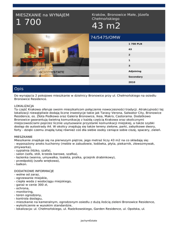 MIESZKANIE na WYNAJEM 1 700 Kraków, Bronowice Małe, Józefa Chełmońskiego 43 m2 74/5475/OMW 1 700 PLN 43 2 1 3 Adjoining Secondary 2010 Opis Do wynajęcia 2 pokojowe mieszkanie w dzielnicy Bronowice przy ul. Chełmońskiego na osiedlu Bronowice Residence. LOKALIZACJA Ta część Krakowa oferuje swoim mieszkańcom połączenie nowoczesności tradycji. Atrakcyjności tej lokalizacji niewątpliwie dodają liczne inwestycje takie jak Tarasy Verona, Salwator City, Bronowice Residence, os. Złota Podkowa oraz Galeria Bronowice, Ikea, Makro, Castorama. Dodatkowo Bronowice gwarantują świetną komunikację z każdą częścią Krakowa oraz okolicznymi miejscowościami poprzez licznie usytuowane przystanki komunikacji miejskiej, a także szybki dostęp do autostrady A4. W okolicy znajdują się także tereny zielone, parki, zabytkowe dwory, forty - dzięki czemu znajdą tutaj również coś dla siebie osoby ceniące sobie ciszę, spacery, zieleń. MIESZKANIE Mieszkanie znajduje się na pierwszym piętrze, jego metraż liczy 43 m2 na co składają się: - wyposażony aneks kuchenny (meble w zabudowie, lodówka, płyta, piekarnik, zlewozmywak, zmywarka), - sypialnia (łóżko, szafa), - salon (sofa, stół, krzesła barowe, szafka), - łazienka (wanna, umywalka, toaleta, pralka, grzejnik drabinkowy), - przedpokój (szafa wnękowa), - balkon. DODATKOWE INFORMACJE - wolne od zaraz, - ogrzewanie miejskie, - ciepła woda z wodociągu miejskiego, - garaż w cenie 300 zł, - ochrona, - monitoring, - teren ogrodzony, - kontrola dostępu, - mieszkanie na kameralnym, ogrodzonym osiedlu z dużą ilością zieleni Bronowice Residence, - wykończenie w wysokim standardzie, - lokalizacja: ul. Chełmońskiego, ul. Radzikowskiego, Garden Residence, ul. Opolska, ul. JachymEstate Sosnowiecka, ul. Piaskowska, ul. Stelmachów, ul. Kiwerskiego, - prowizja dla firmy, - kaucja, - mieszkanie w budynku z 2012 roku. CENA Cena wynajmu 1700 zł + 300 zł garaż + 360 zł czynsz administracyjny (zaliczka na wodę, centralne ogrzewanie) i energię elektryczną (według zużycia ok 50 zł). POLECAM I ZAPRASZAM DO OGLĄDANIA. Biuro nieruchomości JACHYMESTATE. KONTAKT DO SPECJALISTY DS. NIERUCHOMOŚCI Rafał Sekuła Kom.: +48 570 947 003 Email: [email protected] Zapraszamy do zapoznania się z naszą pełną ofertą na www.JachymEstate.pl Rafał Sekuła tel. 570 947 003 email: [email protected] JachymEstate Powered by TCPDF (www.tcpdf.org)