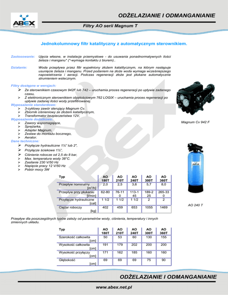 ODŻELAZIANIE I ODMANGANIANIE Filtry AO serii Magnum T Jednokolumnowy filtr katalityczny z automatycznym sterownikiem. Zastosowanie: Ujęcia własne, w instalacje przemysłowe - do usuwania ponadnormatywnych ilości żelaza i manganu* (*-wymaga kontaktu z biurem).. Działanie: Woda przepływa przez filtr wypełniony złożem katalitycznym, na którym następuje usunięcie żelaza i manganu. Przed podaniem na złoże woda wymaga wcześniejszego napowietrzania i aeracji. Podczas regeneracji złoże jest płukane automatycznie strumieniem wstecznym. Filtry dostępne w wersjach: Ze sterownikiem czasowym 942F lub 742 – uruchamia proces regeneracji po upływie zadanego czasu, Z elektronicznym sterownikiem objętościowym 762 LOGIX – uruchamia proces regeneracji po upływie zadanej ilości wody przefiltrowanej. Wyposażenie standardowe: 3-cyklowy zawór sterujący Magnum Cv, Zbiornik ciśnieniowy ze złożem katalitycznym, Transformator bezpieczeństwa 12V, Wyposażenie dodatkowe: Zawory wspomagające, Sprężarka, Adapter Magnum, Zestaw do montażu bocznego, Aerator. Dane techniczne: Przyłącze hydrauliczne 1½” lub 2", Przyłącze ściekowe 1½”, Ciśnienie robocze od 2,5 do 8 bar, Max. temperatura wody 38°C. Zasilanie 230 V/50 Hz Napięcie pracy 12 V/50 Hz Pobór mocy 3W Typ Przepływ nominalny [m3/h] Przepływ przy płukaniu [l/min] Przyłącze hydrauliczne [cal] Ciężar roboczy [kg] AO 180T 2,0 AO 210T 2,5 AO 240T 3,6 AO 300T 5,7 AO 360T 8,0 62-80 1 1/2 76-11 0 1 1/2 113-1 45 1 1/2 189-2 25 2 265-33 0 2 402 459 653 1055 1469 Magnum Cv 942 F AO 240 T Przepływ dla poszczególnych typów zależy od parametrów wody, ciśnienia, temperatury i innych zmiennych układu. Typ Szerokość całkowita [cm] Wysokość całkowita [cm] Wysokość przyłączy [cm] Głębokość [cm] AO 180T 50 AO 210T 53 AO 240T 60 AO 300T 130 AO 360T 155 191 179 202 200 200 171 162 185 160 160 69 69 69 75 90 ODŻELAZIANIE I ODMANGANIANIE www.abex.net.pl
